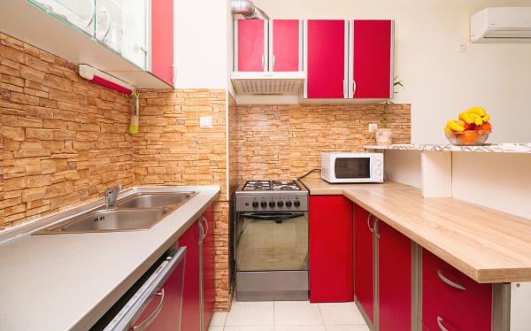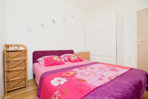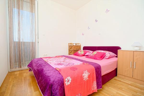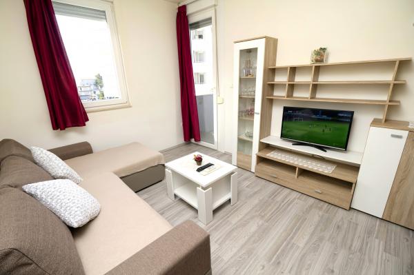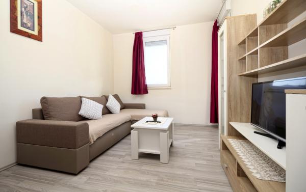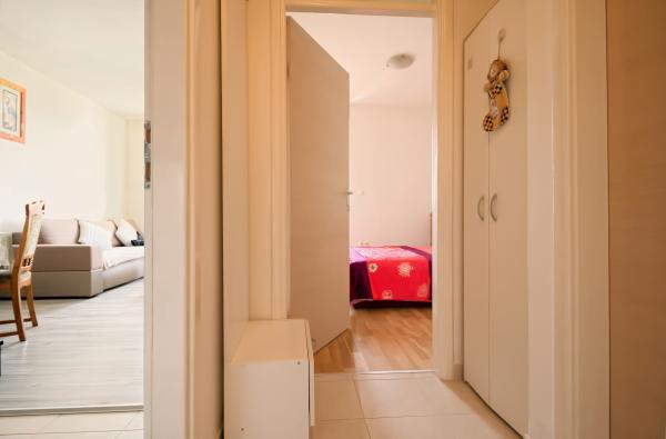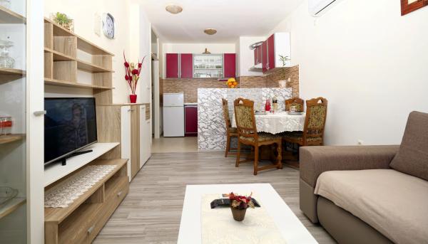 Jednosoban stan u zrgadi na prvom katu - novogradnja, kompletno uređen i opremljen. Sasotji se od hodnika, dnevnog boravka sa blagovaonicom i kuhinjom, spavaće sobe i kupatila. Mali balkon ima pogled na more. Parking je u garaži zgrade (rezervirano parking mjesto), te ispred zgrade (zajednički parking).