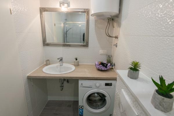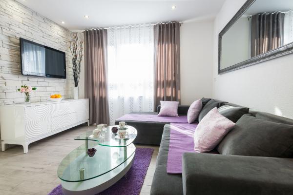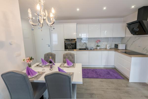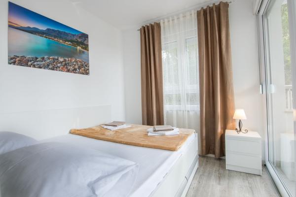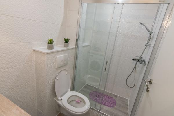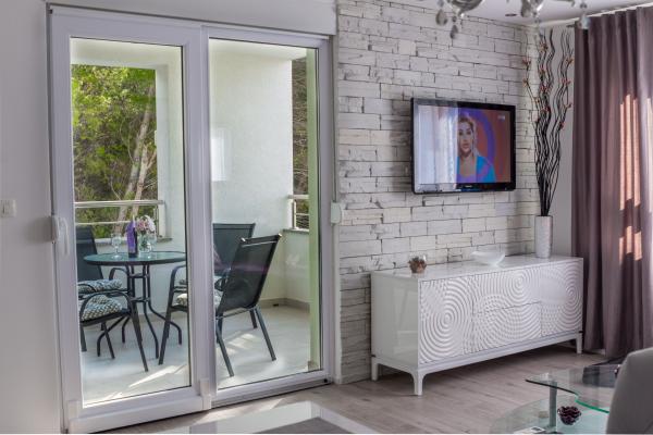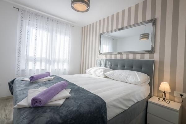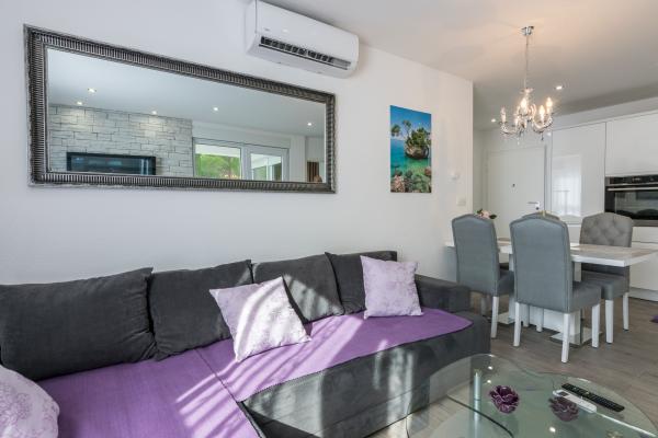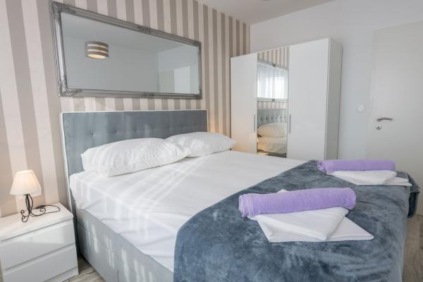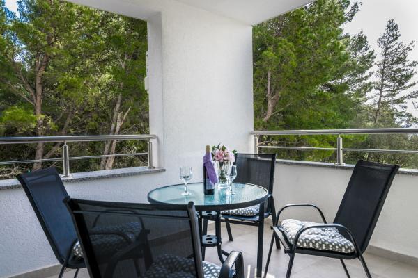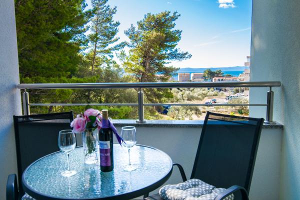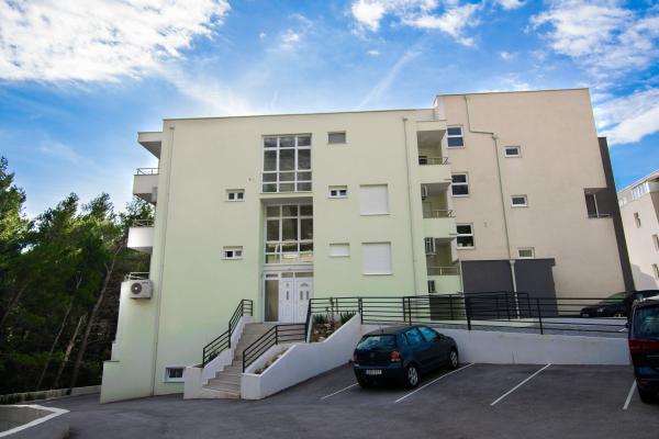 Kompletno i suvremeno opremljen novi stan, sa pogledom na more, veličine 60 m2. Stan se sastoji od dvije spavaće sobe, sa velikim krevetima, kupatila, kuhinje, terase. Isti je opremljen klimom, WI-FI internetom, te posjeduje svoj privatni parking, koji je za goste besplatan. Stan se nalazi u mirnom okruženju uz borovu šumu, te je izoliran od buke automobila. Udaljen od plaže, mora oko 650-700 metara, 5-6 minuta pješice, od autobusnog kolodvora također oko 600-700 metara, od centra oko 900 metara.