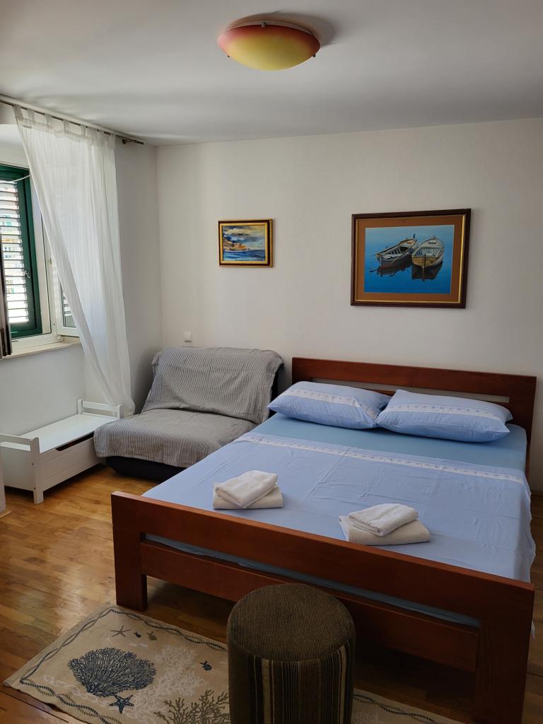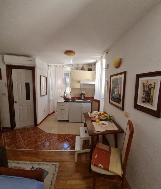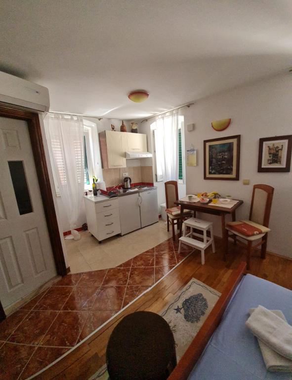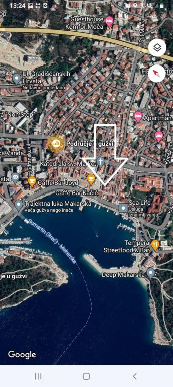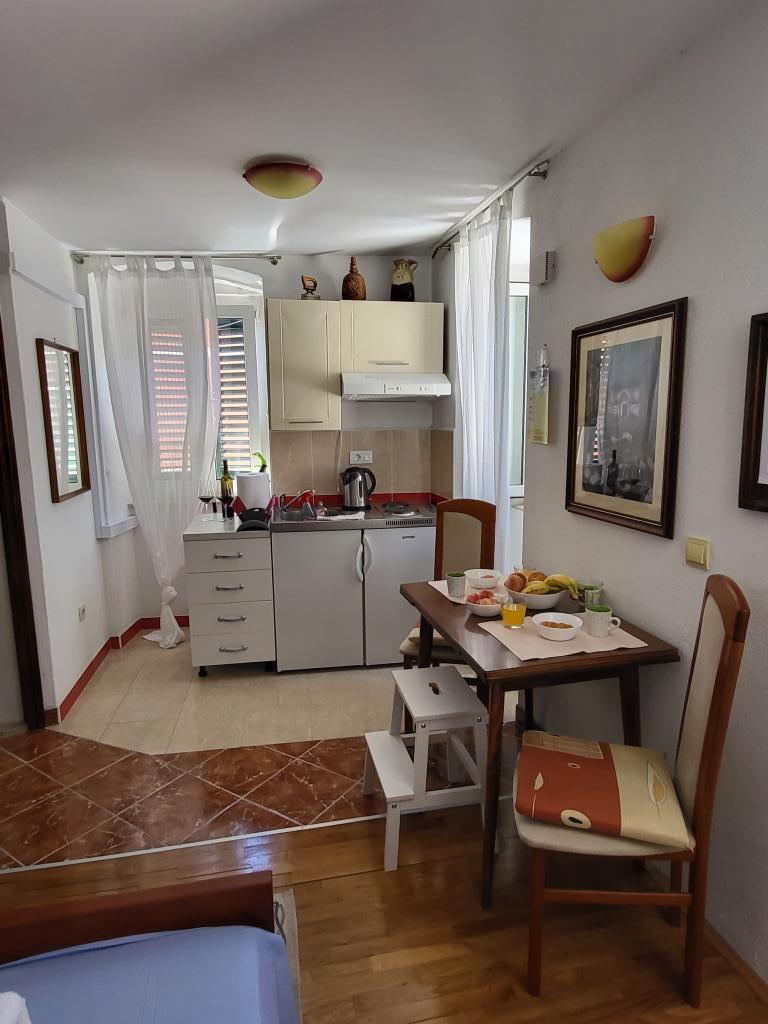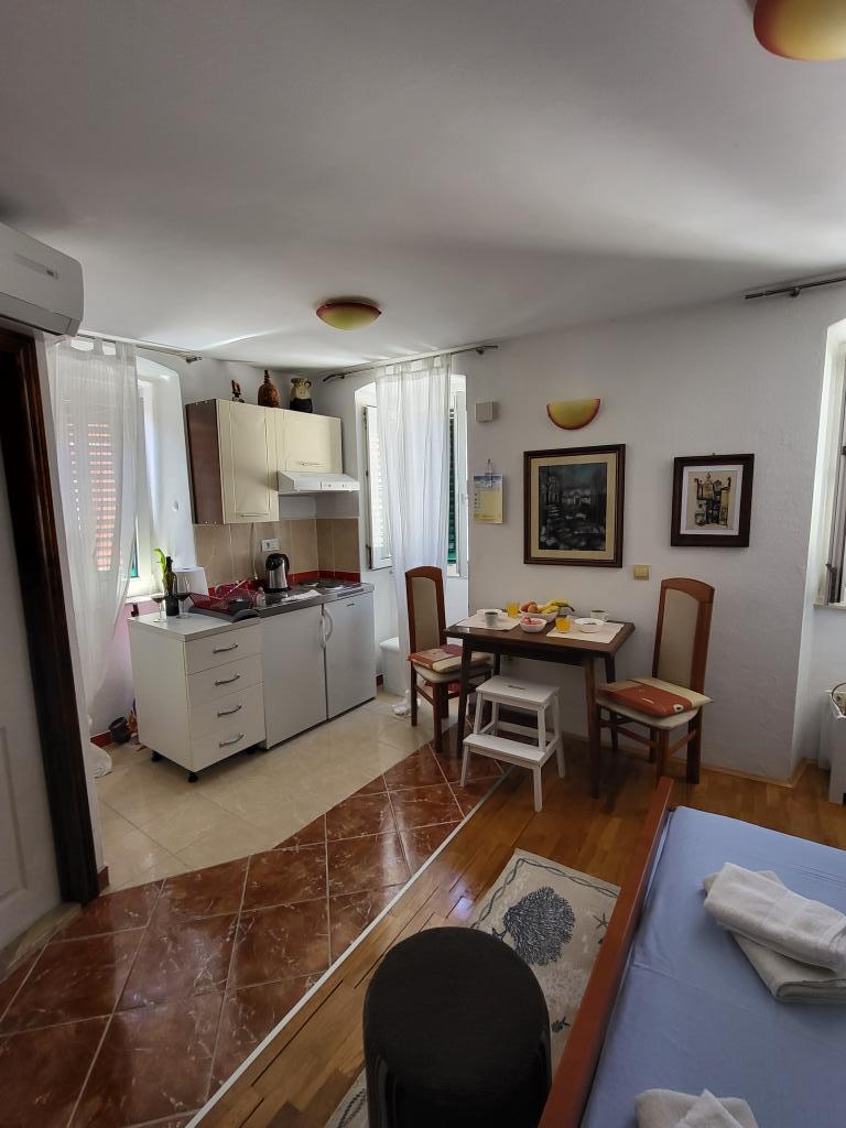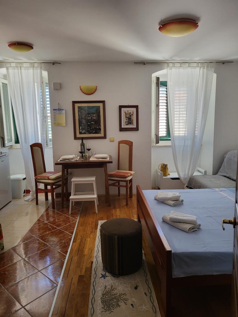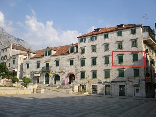 Studio se nalazi u strogom centru grada, na Kačićevom trgu. U neposrednoj blizini je rive 10 metara, a do najbliže plaže oko 150 metara. Dućan,tržnica i pekara nalaze se na sjevernoj strani samog trga, na manje od 50 m. Ljekara se nalazi 10 tak metara od ulaza u zgradu. Studio nudi mogućnost smještaja 2+1. Uz klasičan krevet za dvije osobe , postoji fotelja koja se razvlači i pretvara u krevet za jednu osobu. Mini kuhinja koja zadovoljava potrebe kuhanja i konzumiranja hrane, te kupatilo sa tuš-kadom, wc i umivaonikom. Osiguran je gradski parking, uz nadoplatu koju određuje Komunalno Makarska, isključivo na tjedan dana.