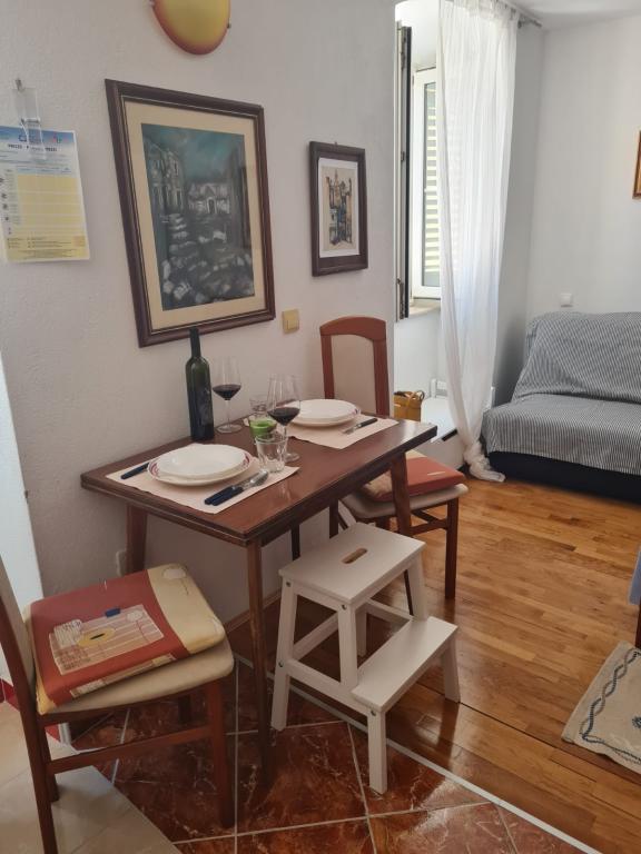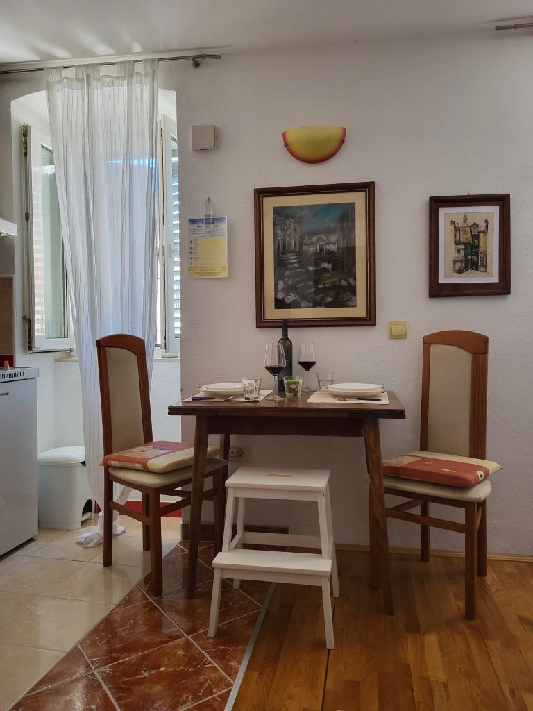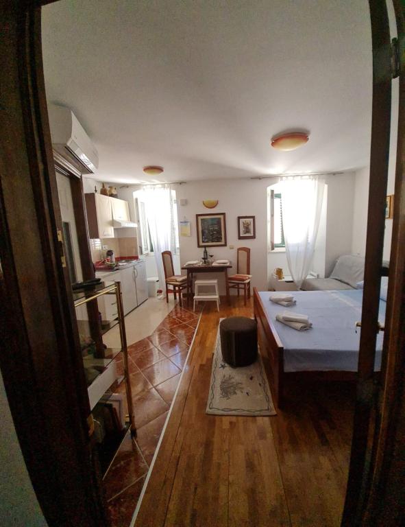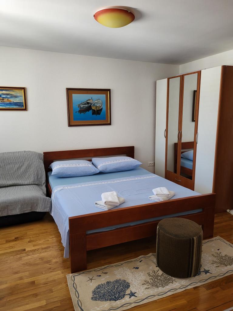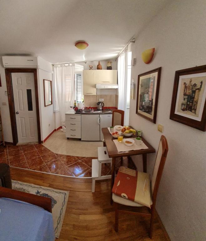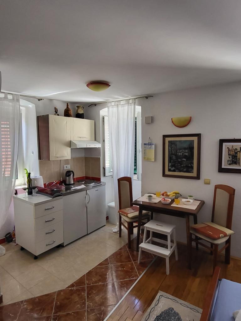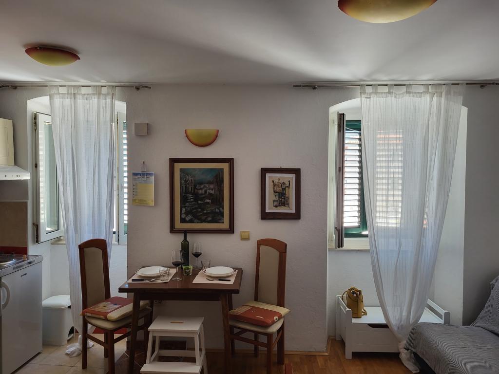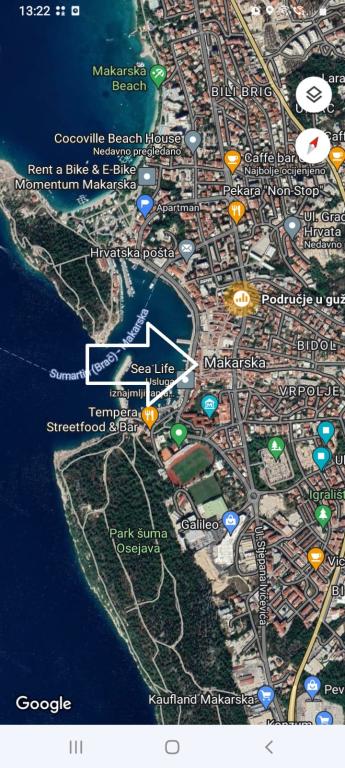 Studio se nalazi u strogom centru grada, na Kačićevom trgu. U neposrednoj blizini je rive 10 metara, a do najbliže plaže oko 150 metara. Dućan,tržnica i pekara nalaze se na sjevernoj strani samog trga, na manje od 50 m. Ljekara se nalazi 10 tak metara od ulaza u zgradu. Studio nudi mogućnost smještaja 2+1. Uz klasičan krevet za dvije osobe , postoji fotelja koja se razvlači i pretvara u krevet za jednu osobu. Mini kuhinja koja zadovoljava potrebe kuhanja i konzumiranja hrane, te kupatilo sa tuš-kadom, wc i umivaonikom. Osiguran je gradski parking, uz nadoplatu koju određuje Komunalno Makarska, isključivo na tjedan dana.