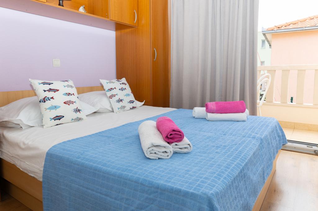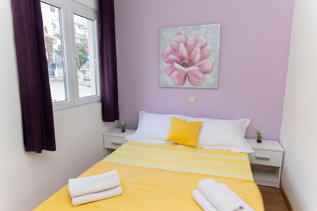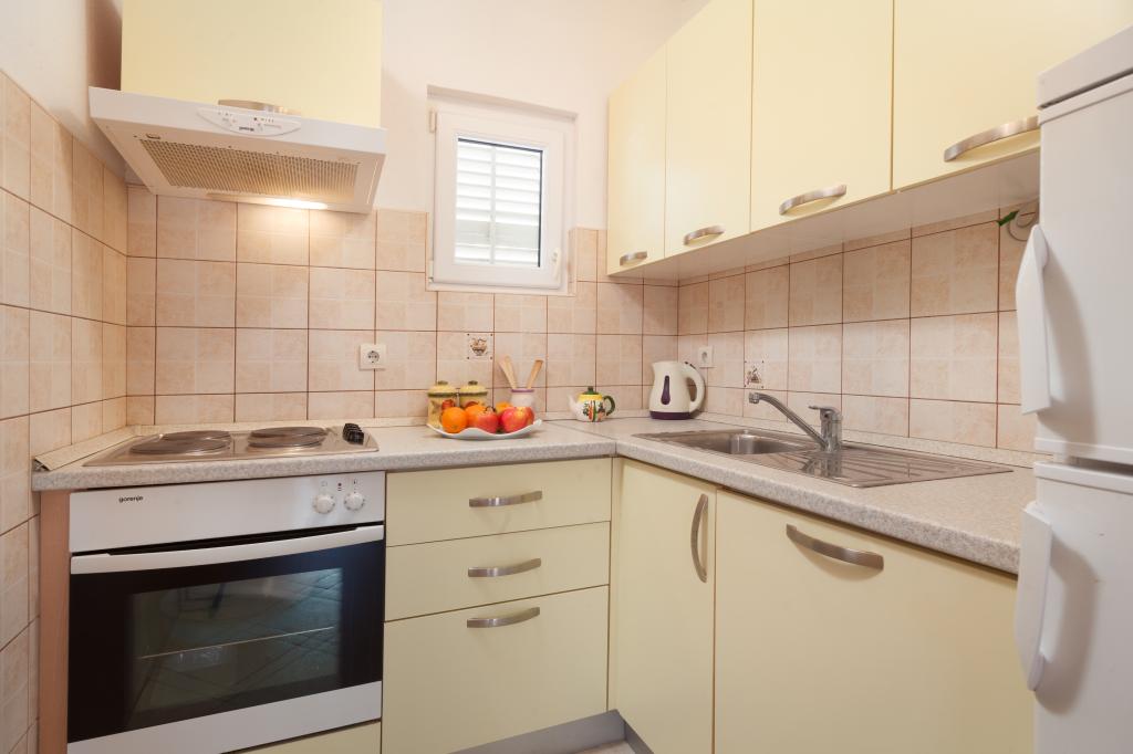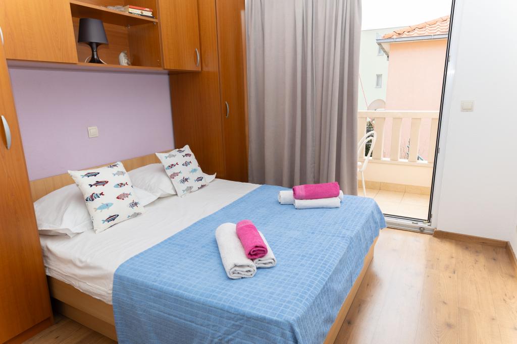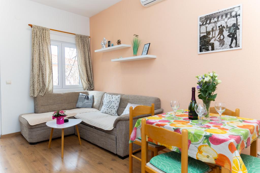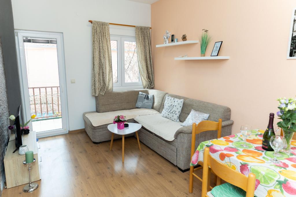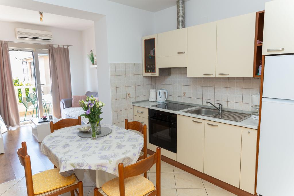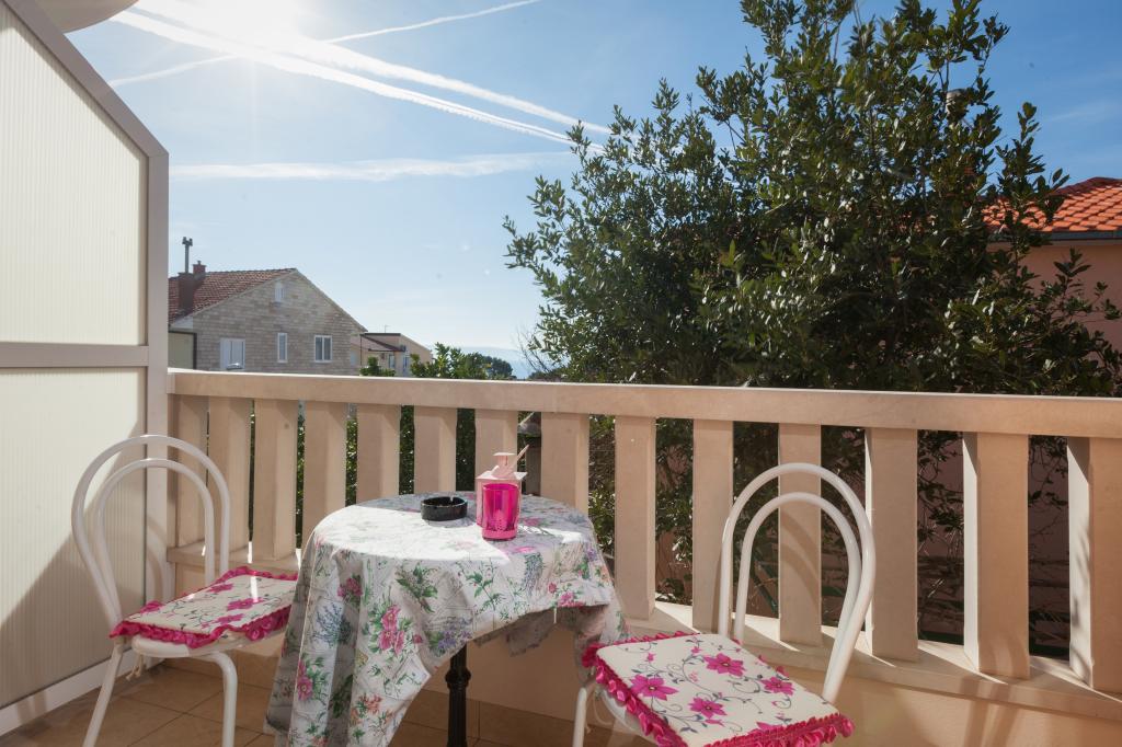Apartmani se nalaze na 1. katu obiteljske kuće u jednosmjernoj ulici na zapadnom dijelu grada Makarske. Do šljunčane plaže Ratac se dolazi za 5 minuta hoda, a do centra grada za 15-tak minuta hoda šetnicom uz more. Apartmani se sastoje od dnevnog boravka s kuhinjom i blagovaonicom, 2 spavaće sobe (s bračnim krevetima) te kupaonicom s tuš-kadom. U dobro opremljenoj kuhinji gosti će pronaći ploču za kuhanje, hladnjak, posuđe i pećnicu. U dvorištu objekta se nalazi veliki roštilj koji mogu koristiti naši gosti. Apartmani imaju balkone s pogledom na more, zvučno izolirane zidove i TV ravnog ekrana s kabelskim programima.
