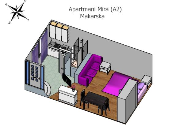 Apartmani Mira nalaze se u zapadnom dijelu grada Makarske, na drugom katu obiteljske kuće u mirnom okruženju s prekrasnim pogledom na Jadransko more i poluotok Sveti Petar. Apartmani su novouređeni i klimatizirani, a gosti u njima mogu uživati uz besplatni WiFi i satelitske programe. Svi gosti imaju besplatan parking. Duga šljunčana plaža nalazi se svega 50 metara od naših apartmana, prepuna atraktivnih ljetnih sadržaja kao što su parasailling, jet ski, vodene tube,bungee jumping, skijanje na vodi,adrenalinski park..., a za one s manje adrenalina tu su rent-a-boat, rent-a-bike, teniski tereni, masaže u blizini mora .... Za Vaše najmlađe točno ispod naših apartmana nalazi se aquapark i dječiji park. Od središta grada Apartmani Mira su udaljeni 10 minuta šetnje. Apartmani su idealni za obitelji s djecom i ljude željne mirnog i relaksirajućeg odmora. Dovoljno su udaljeni da se odmorite od buke i gradske gužve, ali i vrlo blizu svemu što nudi ovaj divni grad na obali Jadranskog mora.
