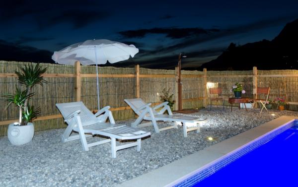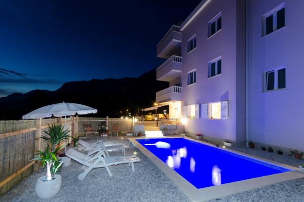 Apartman na istočnom dijelu grada Makarske, nalazi se u prizemlju novoizgrađene kuće, ostali stanovi su zatvoreni, bazen je za uporabu gostima tog jednog jedinog apartmana, besplatan parking, sve prostorije su klimatizirane, el.roštilj. Objekt se nalazi 10 min. hoda od centra grada, isto toliko do plaže(gradske).