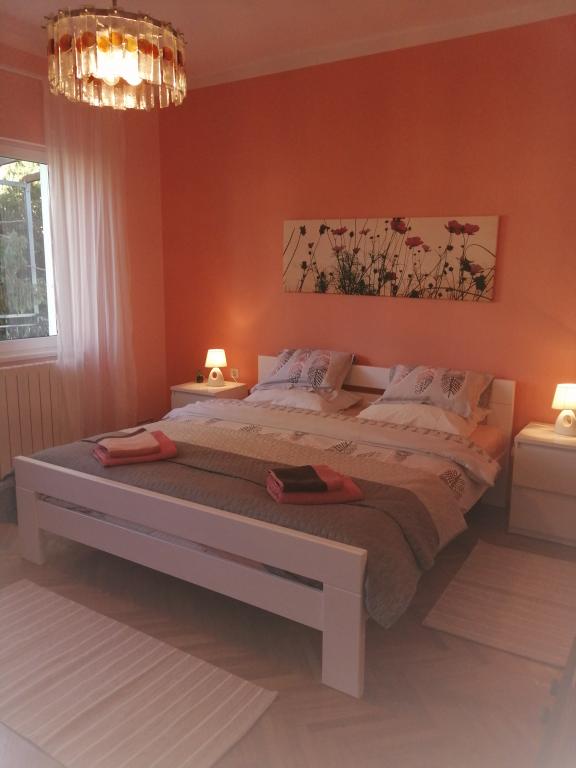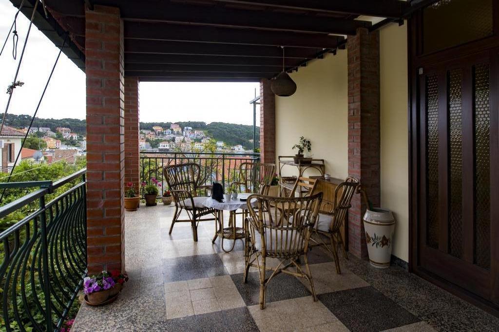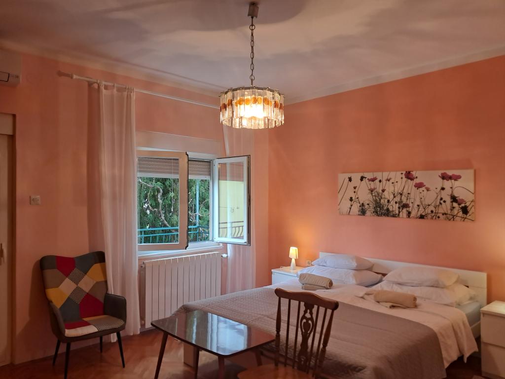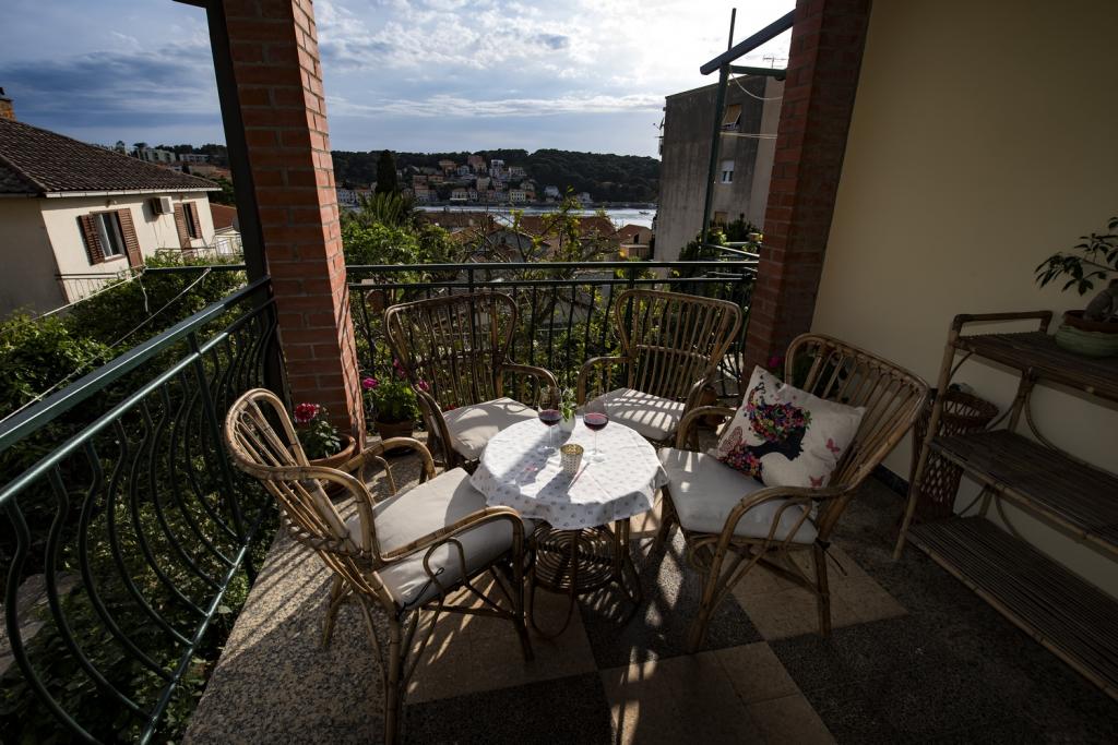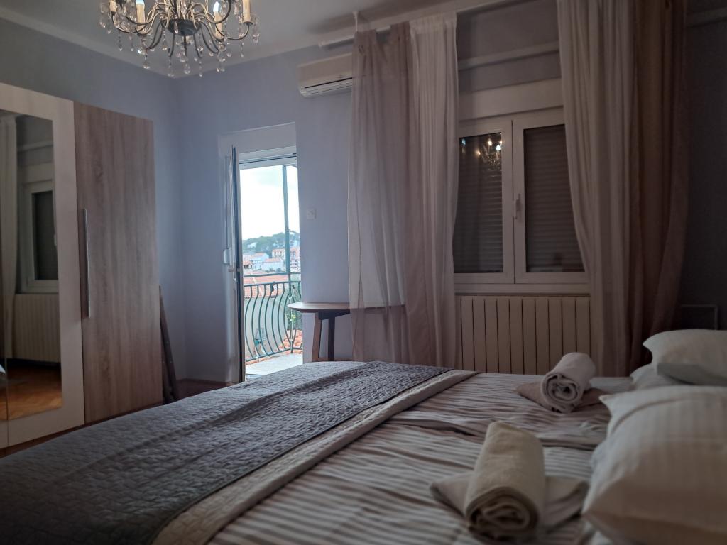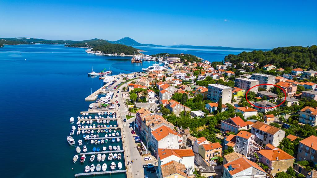 Apartman se nalazi se u mirnom djelu grada u bliziini plaža i centra grada. Apartman ima zaseban ulaz, veliku terasu s pogledom na more i luku. Stan ima 3 sobe, dnevni boravak, kuhinju, 2 kupatila. Apartman je u potpunosti opremljen(pribor za jelo i kuhanje, perilica posuđa, hladnjak s frizerom, toster, 2 vrste aparat za kavu, mikrovalna pećnica, kuhalo za vodu, ručnici, posteljina, glačalo za rublje, tv-sat, wi-fi, perilica za rublje, sušilo za kosu,klima uređaji). U sklopu apartmana je i prostor za roštilj. U zimskim mjesecima apartman se grije centralnim grijanjem u svim prostorijama. Mogućnost parkiranja vozila na ulazu u objekt na javnoj površini.