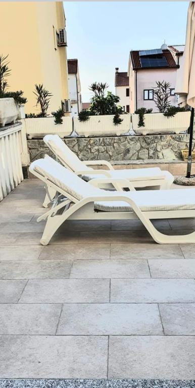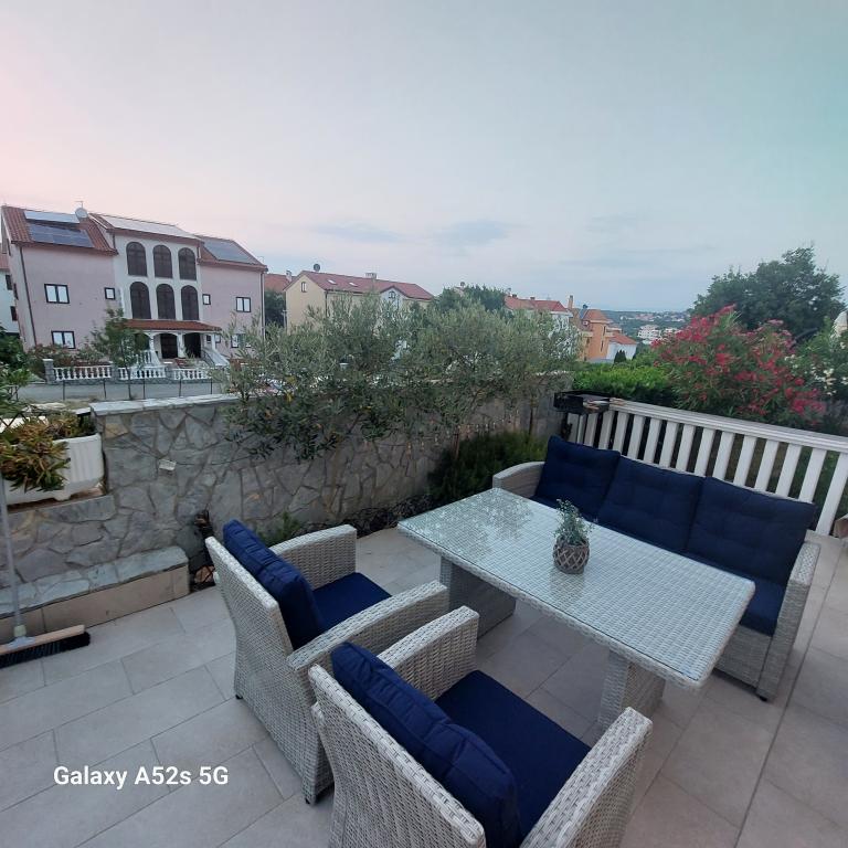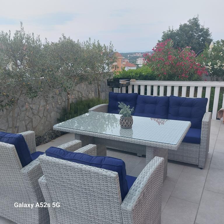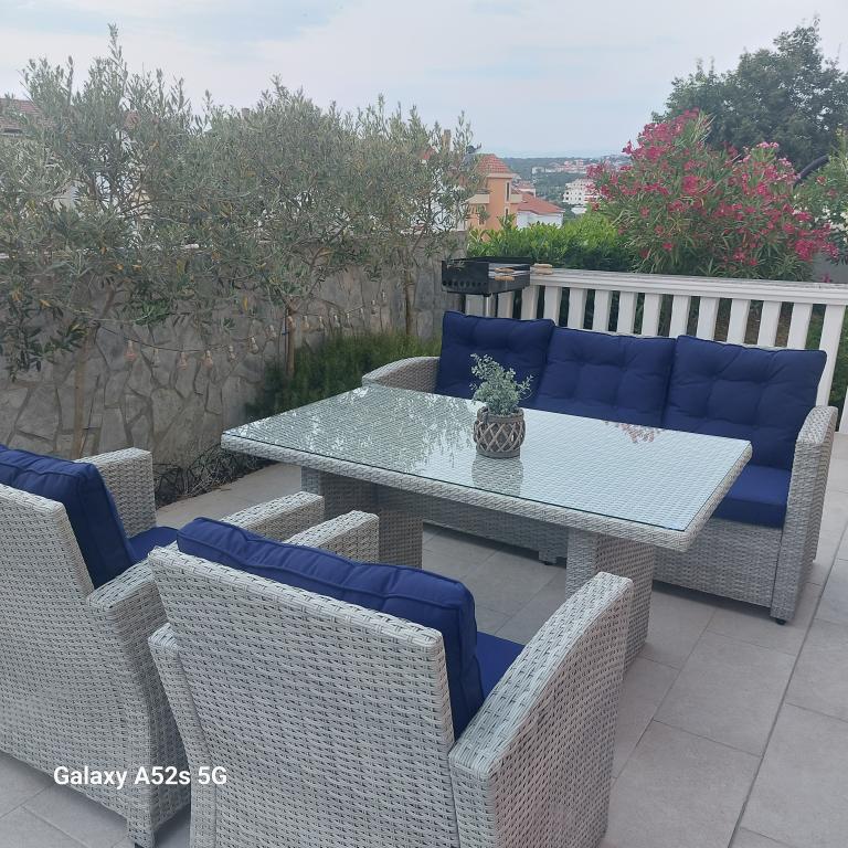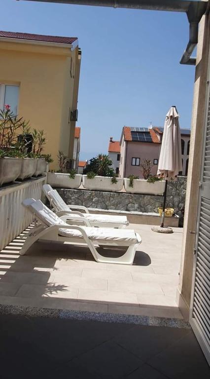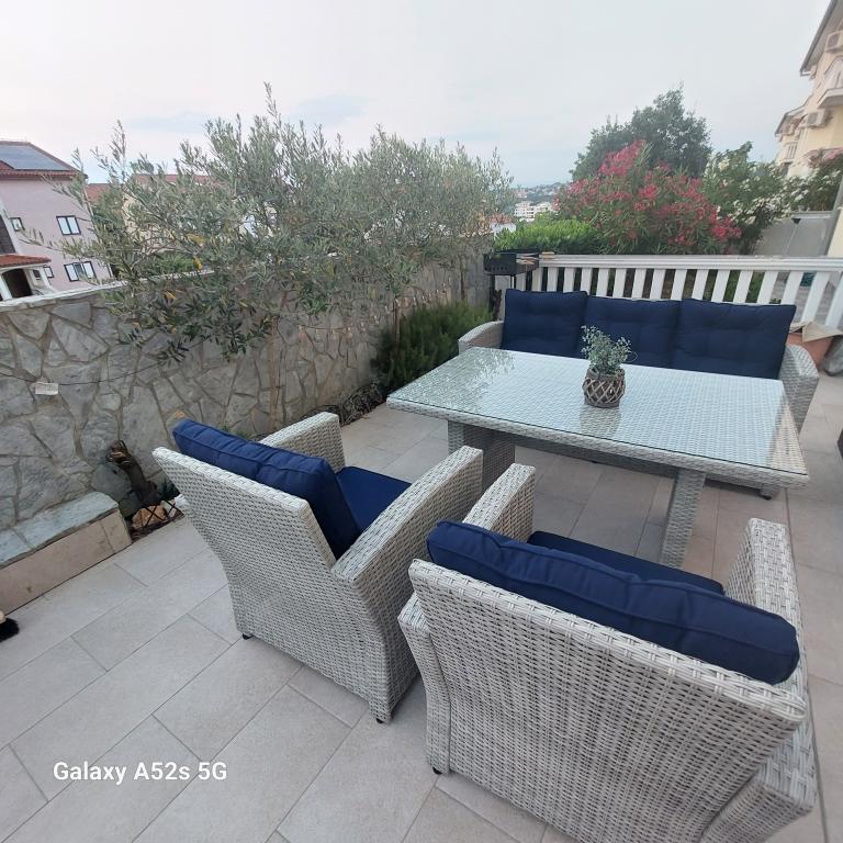 Apartman je smješten u prekrasnom malom gradu Malinska na otoku Krku. Nalazi se u prizemlju. Sastoji se od spavaće sobe sa velikim krevetom za dvoje (posteljina uključena, mijenja se svakih 7 dana) i dnevnim boravkom sa garniturom na izvlačenje za dvoje. Prostor je otvoren pa su blagovaona i dnevni boravak spojeni. Opremljen sa dva televizora - jedan u dnevnom boravku sa mini linijom a drugi u spavaćoj sobi. U apartmanu je kupaona sa tuš kabinom (3 ručnika po osobi), te perilicom za rublje, i kuhinja sa mikrovalnom pećnicom, štednjakom, aparatom za kavu i velikim hladnjakom sa ledenicom od 50 litara, i perilicom za suđe. Parkiralište ispred apartmana. Najvrijedniji dio apartmana je velika terasa (35m2) sa ugodnim stolicama i ležaljkama gdje možete uživati u popodnevnom odmaranju. Pri izlasku na terasu prolazite kroz posebni kutak sa stolićem i dvije stolice (lođa) ukoliko želite popiti kavu sa otvorenim pogledom na terasu i djelomičnim pogledom na more, sakriveni od sunca.