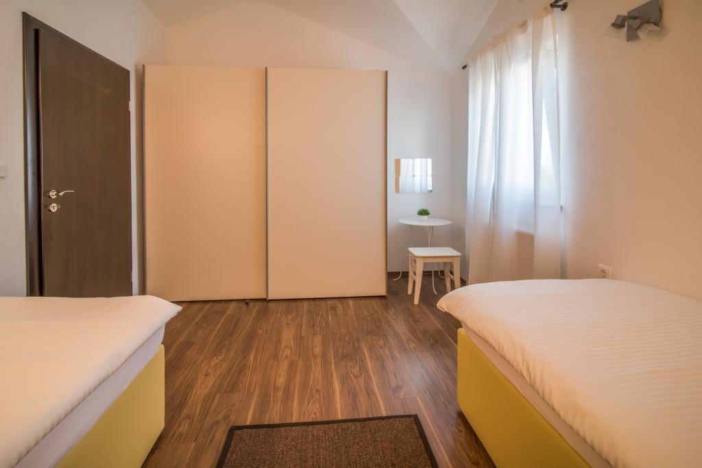 Mediteransko zelenilo,opojni miris mora, mir i tišina, blizina plaže, restorana i trgovine najbolje opisuju mjesto na kojem se nalaze naši apartmani. Udaljeni 250 m od prekrasne uvale Rova i 1500m od centra Malinske idealan su odabir za vaš obiteljski odmor. U prizemlju naše obiteljske kuće nalaze se dva jednosobna apartmana i pružaju smještaj za 4-5 osoba. Svaki apartman ima vlastitu terasu,zajednički vrt i privatni parking. U našoj drugoj kući nalazi se nov i moderno opremljen apartman s jednom spavaćom sobom i pruža smještaj za 4 osobe. Udaljen je 450 m od plaže i nalazi se na drugom katu. Ima balkon s pogledom na more i privatan parking. Apartmani su klimatizirani,imaju SAT TV i bežični pristup internetu.