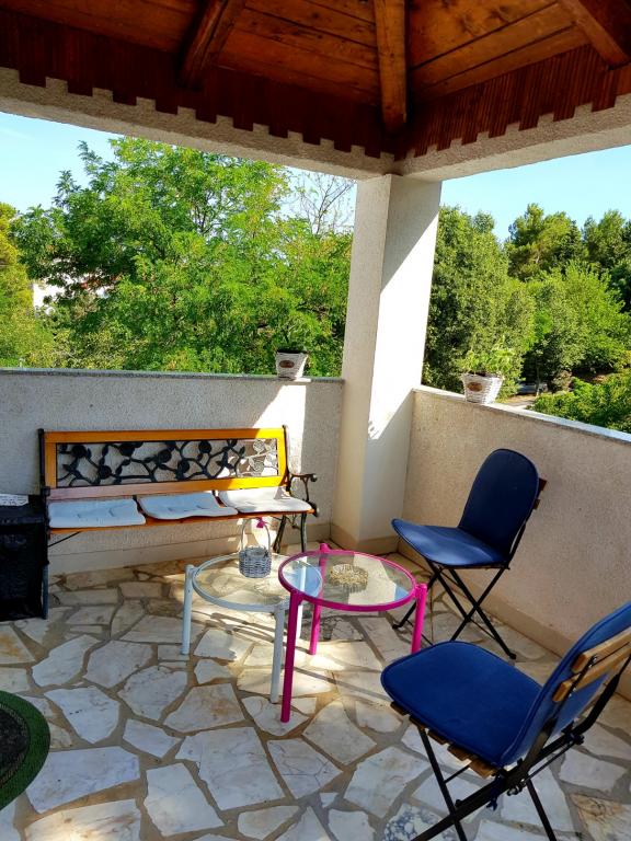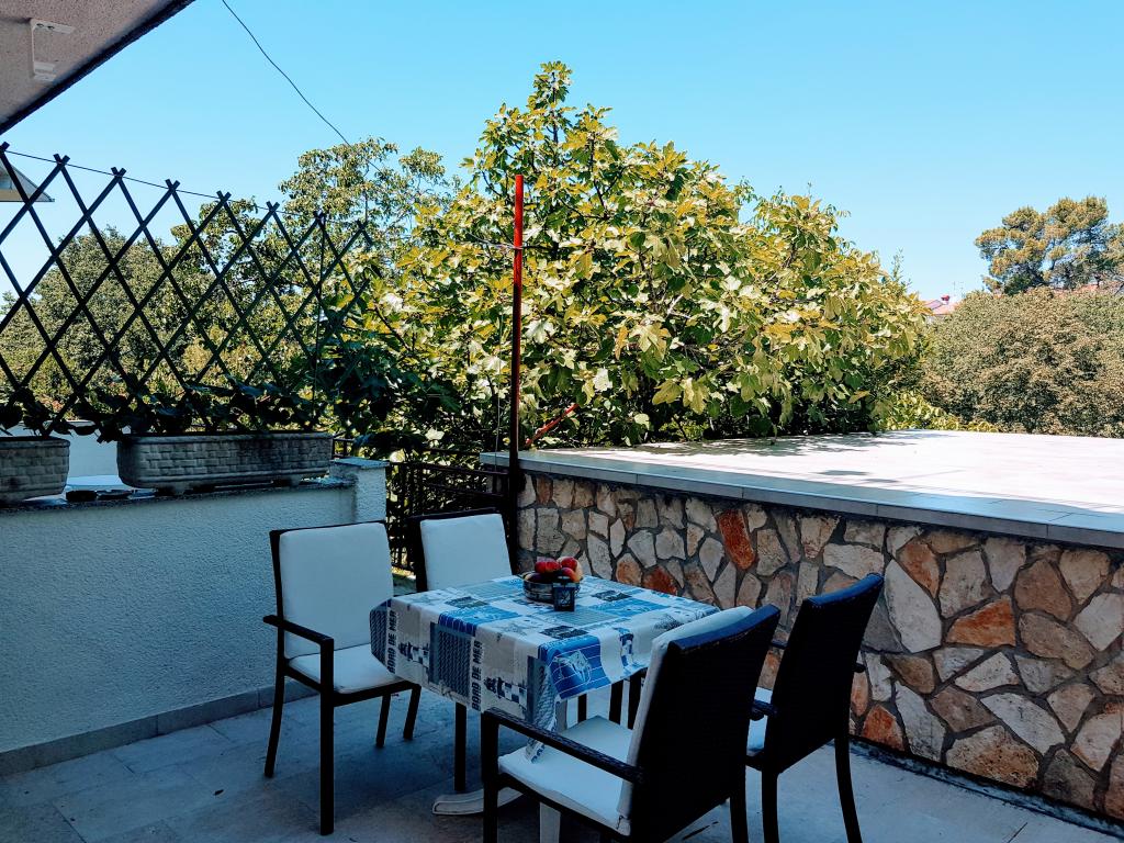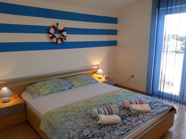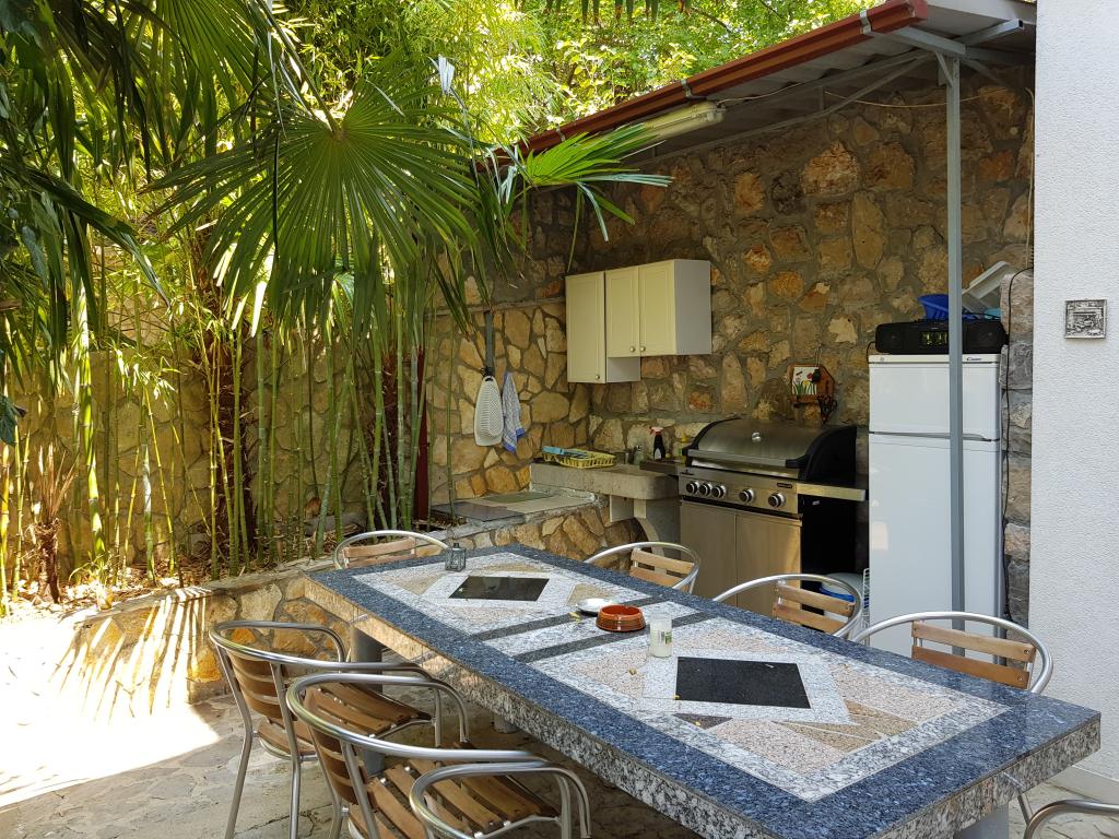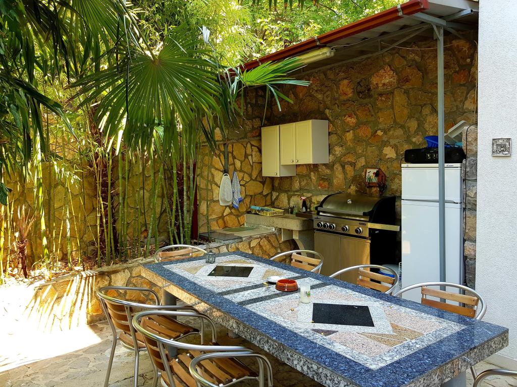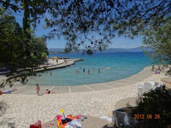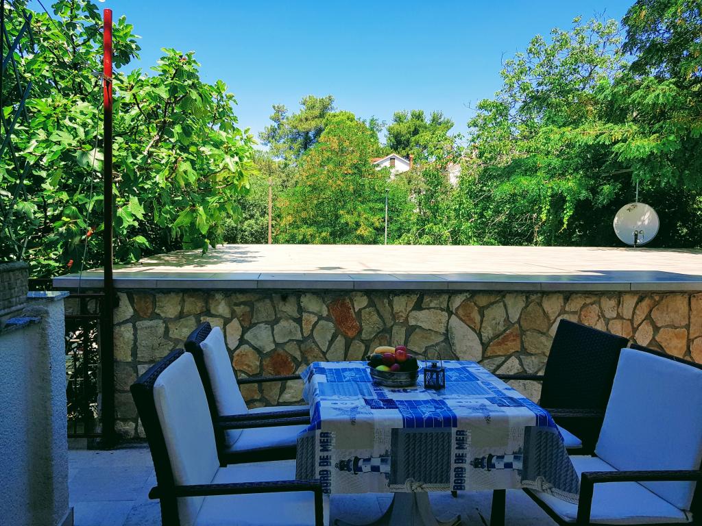 Apartmani, sobe i bungalov, okruženi zelenilom šume primorskog bora, u mirnoj ulici iznad centra. Kuća se nalazi 3 minute hoda do rive i manje od 10 minuta hoda do gradske plaže. U blizini se nalaze dućan i restoran. Parking za automobile nalazi se u dvorištu. Roštilj terasa s ljetnom kuhinjom namijenjena je svim gostima kuće te nudi roštilj na drveni ugljen i plinski roštilj.