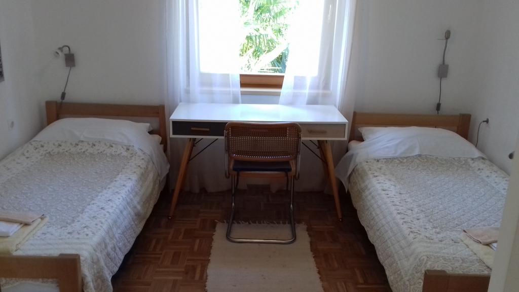 Apartmani u kući se iznajmljuju na cijieli mjesec lipanj ( 1.6 do 1.7.) cijeli mjesec rujan (2.9. do 2.10.). Cijena po apartmanu je mjesečni najam od 1300 Eura. Kuća s dva apartmana (4 plus 1 ; 4 plus 1) udaljena od plaže manje od 100m. Smještena je izvan centra Malinske (10 min ), u blizini hotela Malin. Kuća je drugi red od mora. Uvučena je s glavne ceste u naselju vikendica i puno zelenila. Ispred kuće je jedno parkirno mjesto. Drugi parking na javnom parkiralištu. Donji apartman ima malo vrta. Kuća ima wlan flat rate internet. . U blizini je dječje igralište (50 m), dućan (50 m), te ronilački centar (50 m) , welness i bazen u hotelu Malin koji mogu koristiti i vanjski gosti uz plaćanje. Kontaktirati nas možete preko obrasca ili direktno - Whatsup.