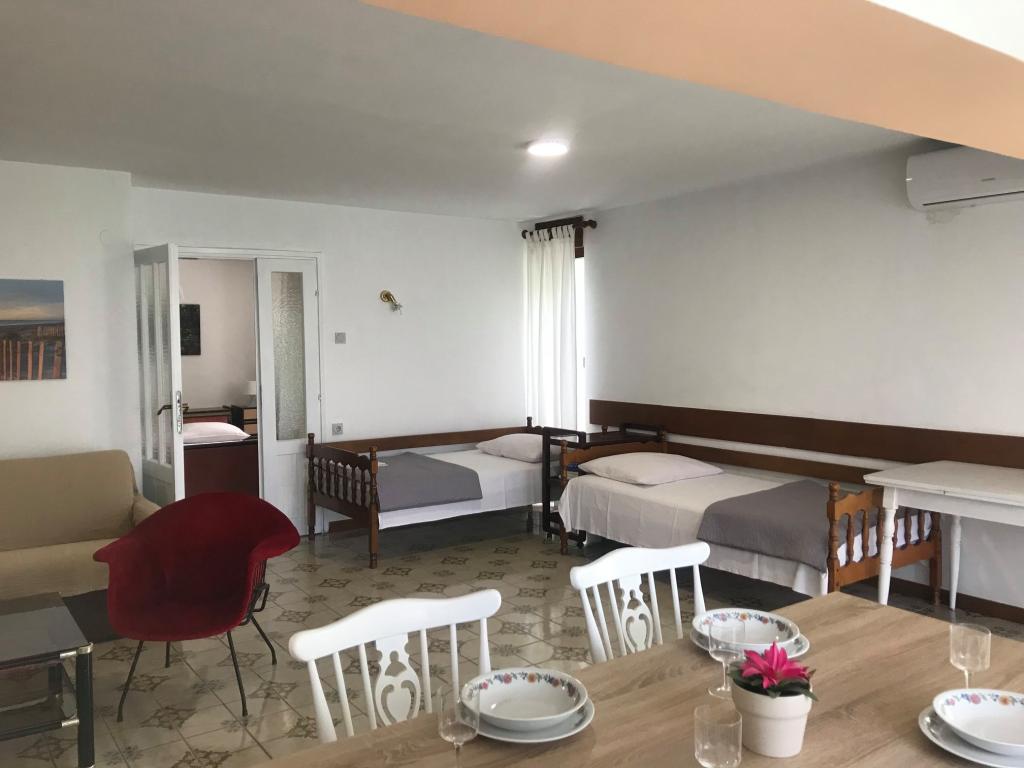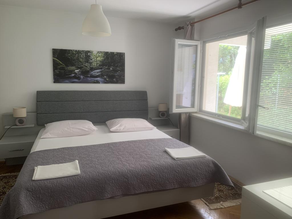 Turistička pristojba je uključena u cijenu. Šaljemo pismenu potvrdu rezervacije (voucher)Apartman 2+2 (55 m2) se nalazi u prizemlju kuće te se sastoji od sobe s bračnim krevetom dok se dva pomoćna ležaja nalaze u dnevnom boravku (dva kreveta s madracima). Kuhinja je opremljena posuđem, hladnjakom sa zamrzivačem, mikrovalnom pećnicom, električnim štednjakom s pećnicom, kuhalom za vodu i aparatom za kavu. Apartman ima prednju i stražnju terasu. Kućni ljubimci su dobrodošli po dodatnoj cijeni od 5 € dnevno po ljubimcu. ------------------------------------------------------------------ Apartman 4+2 (85 m2) se nalazi na prvom katu te se sastoji od 2 sobe s bračnim krevetima dok se 2 pomoćna ležaja nalaze u dnevnom boravku. U apartmanu se nalazi kupaonica (tuš/wc) te odvojeni wc. Kuhinja je opremljena posuđem, dvostrukim hladnjakom sa zamrzivačem, mikrovalnom pećnicom, električnim štednjakom s pećnicom, kuhalom za vodu i aparatom za filter kavu. Apartman ima veliku terasu na prednjoj strani prema dvorištu i balkon prema vrtu.