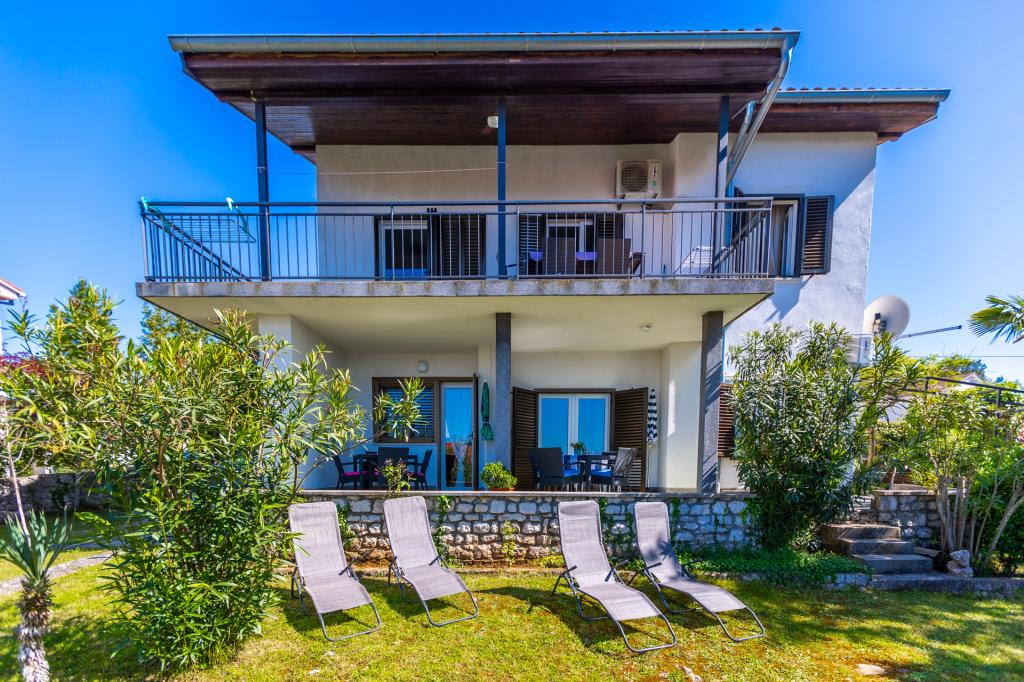 Dva dobro opremljena i uređena apartmana u prizemlju kuće u mirnom dijelu Malinske, sa sigurnim polu natkrivenim parkiralištem, natkrivenim terasama s pogledom na more, uređenim vrtom s mediteranskom vegetacijom, dvorišnim roštiljem. Apartmani su klimatizirani, LCD SAT TV, Wi-Fi Internet. Kuhinje opremljene - mikrovalna pećnica, aparat za filter kavu, toster, perilica posuđa.