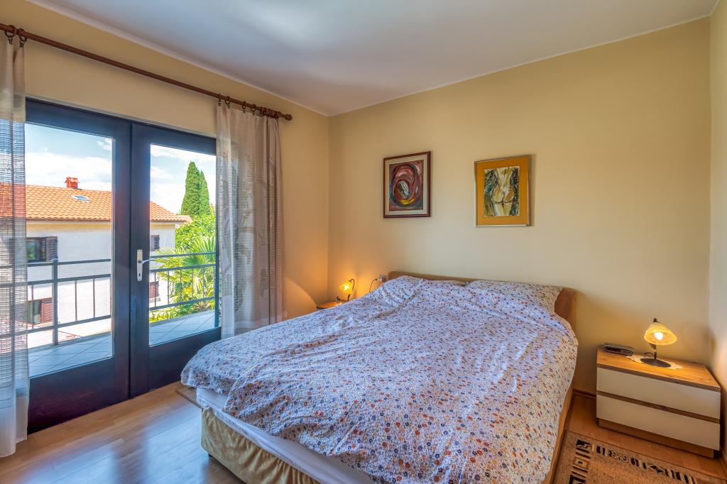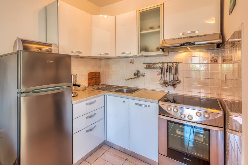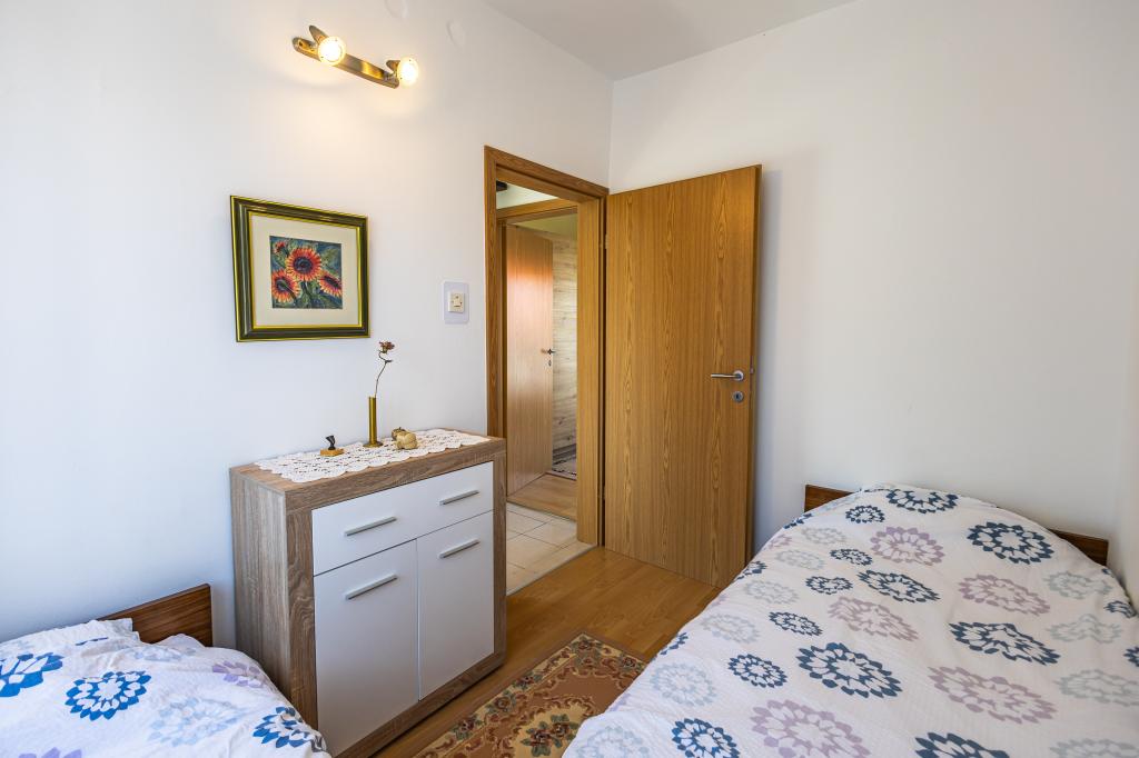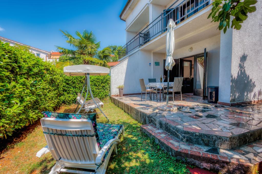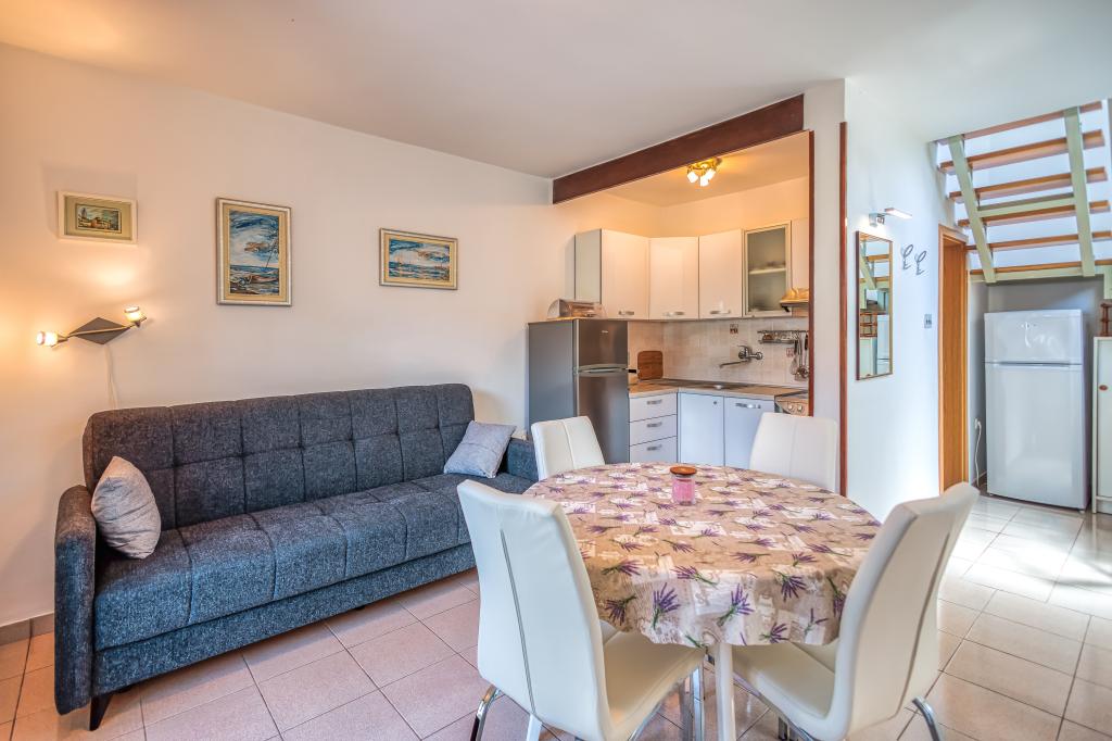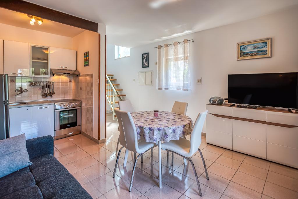 Potpuno opremljeni cetverokrevetni dvoetažni apartman sa vlastitim parkingom i vrtom. Sastoji se od terase, balkona, kuhinje sa dnevnim boravkom, wc/kupaona i dvije sobe. Apartman je smješten na kraju slijepe ulice koja nije prometna. Udaljenost od plaže i restorana je pet minuta hoda, a od centra Malinske 20 minuta hoda šetnicom uz more.