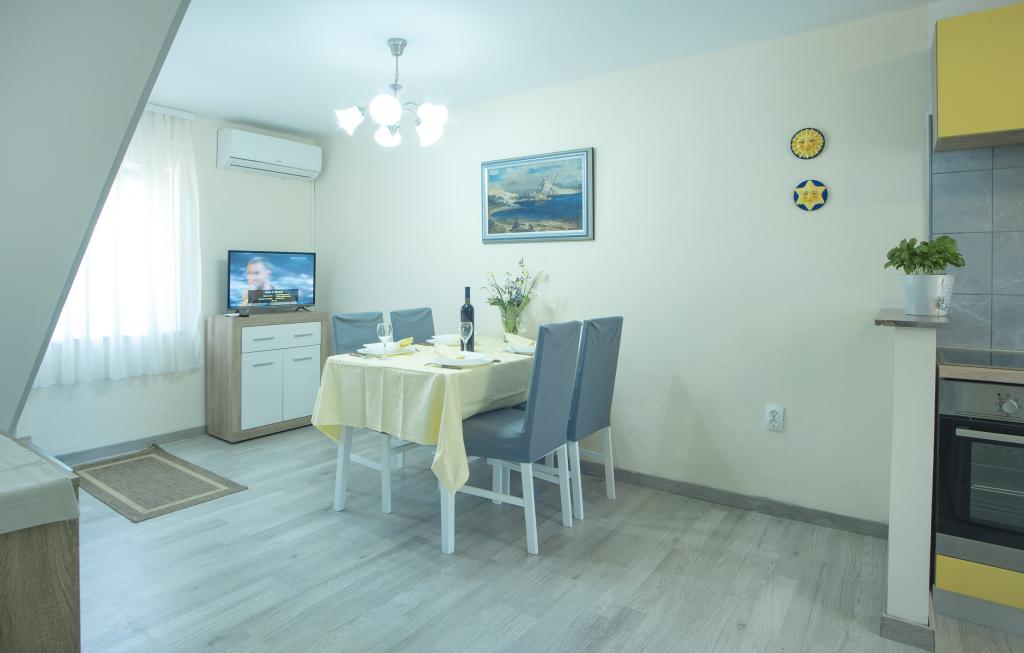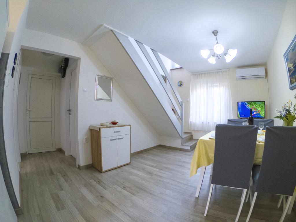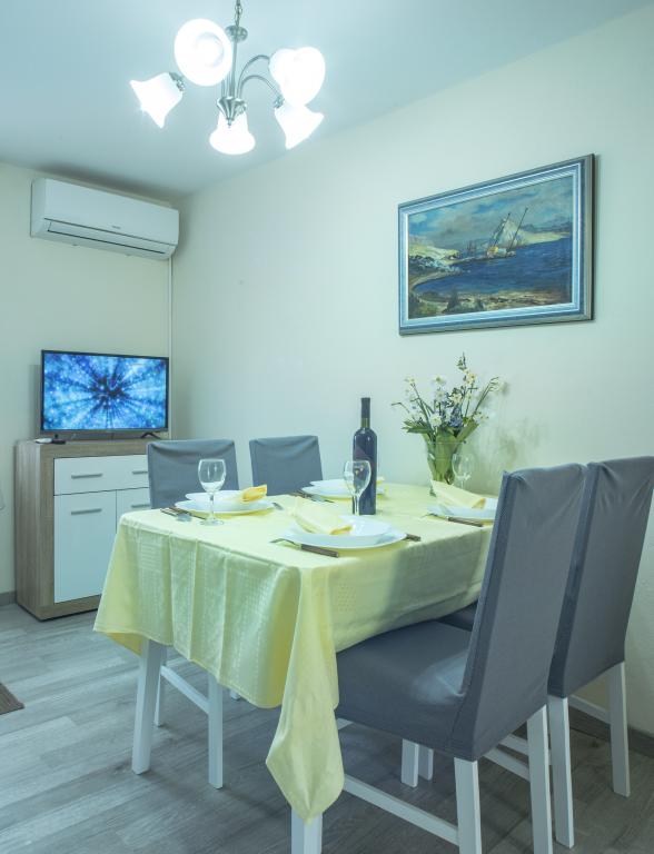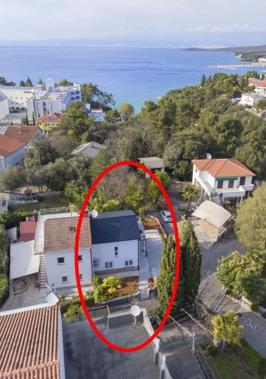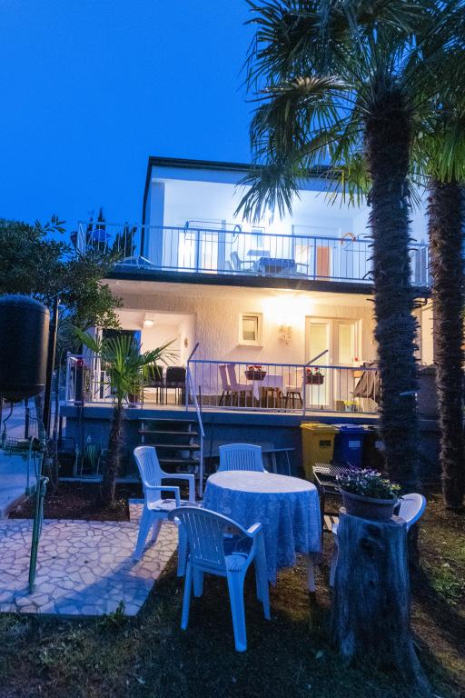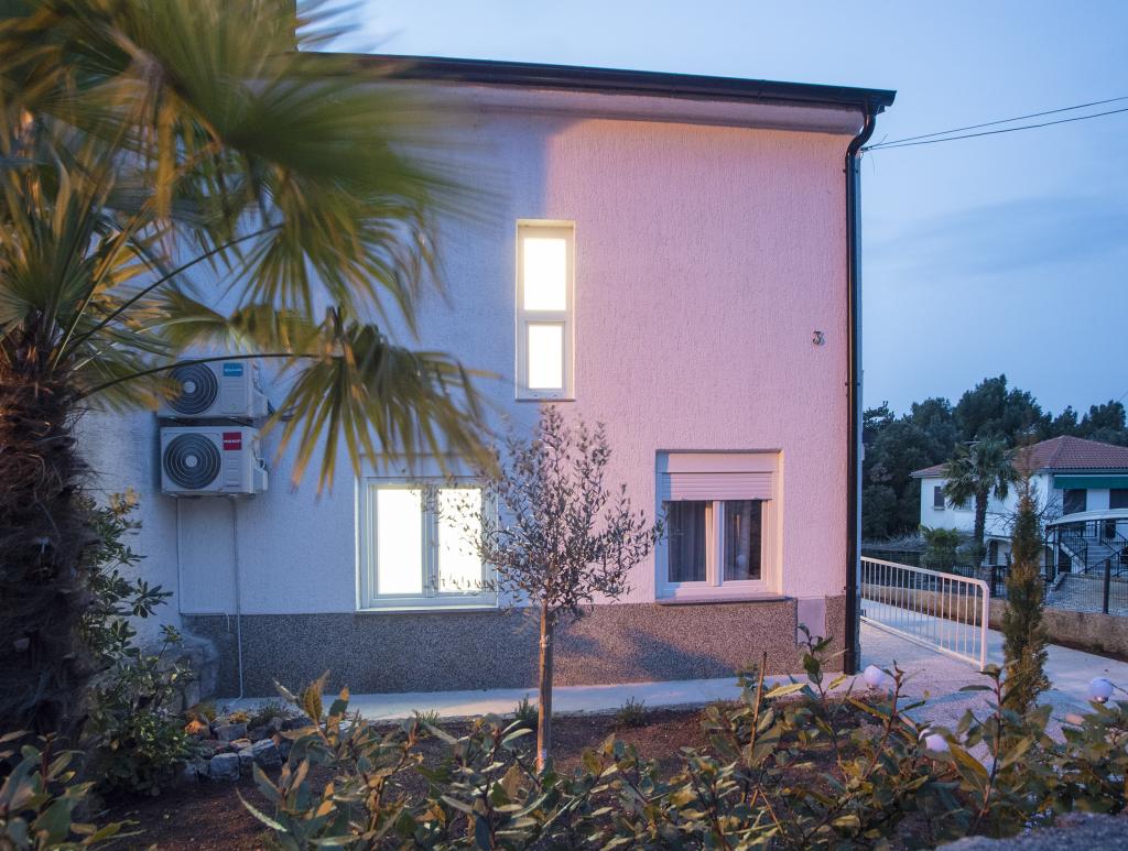 Novouređena kuća za odmor. Potpuno opremljeni cetverokrevetni dvoetažni apartman sa vlastitim parkingom i vrtom. Sastoji se od terasa, balkona, kuhinje sa blagavaonicom, , kupaonica/wc uprizemlju, te dvije spaaće sobe sa bračnim ležajem, dodatni wc i velika opremljena terasa na 1. katu. Kuća je smještena na kraju slijepe ulice koja nije prometna. Pored kuće je parking. a ispred vrt sa grilom, vanjskim tušem. Od kuće vodi staza do plaže, udaljene svega 3 minute hoda. Produžite li dalje šetnicom, za desetak minuta stižete u centar grada, prolazeći uz brojne restorane i caffe barove, ali i dječije igralište, gdje možete predahnuti uz osveženje. U večernjim satima, Malinska i okolna mjesta na otoku nude koncerte, izložbe i druge sadržaje za sve uzraste