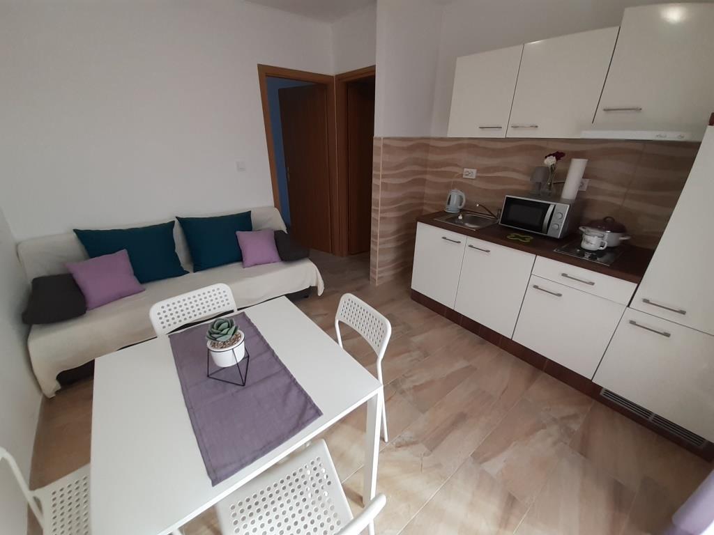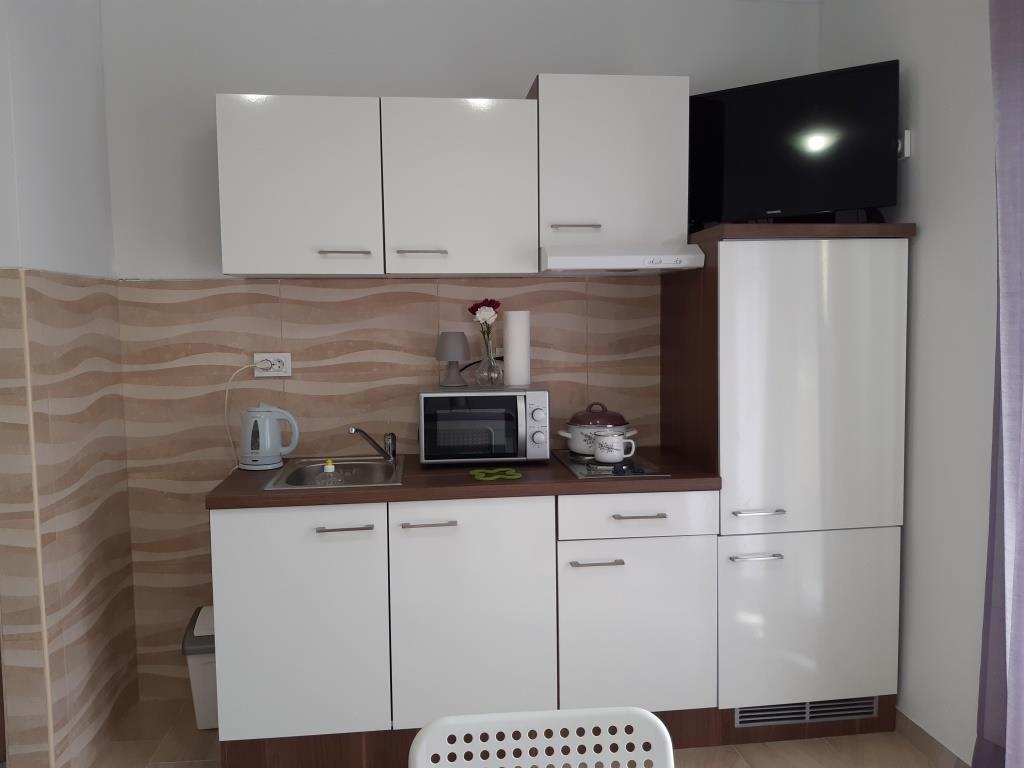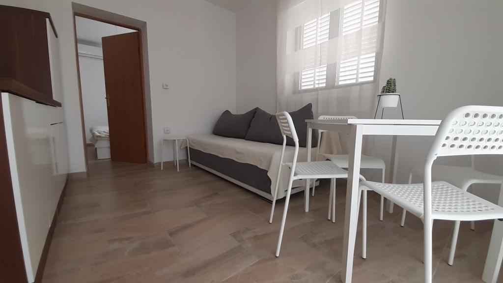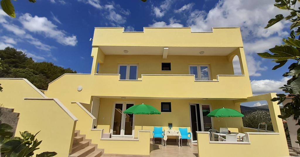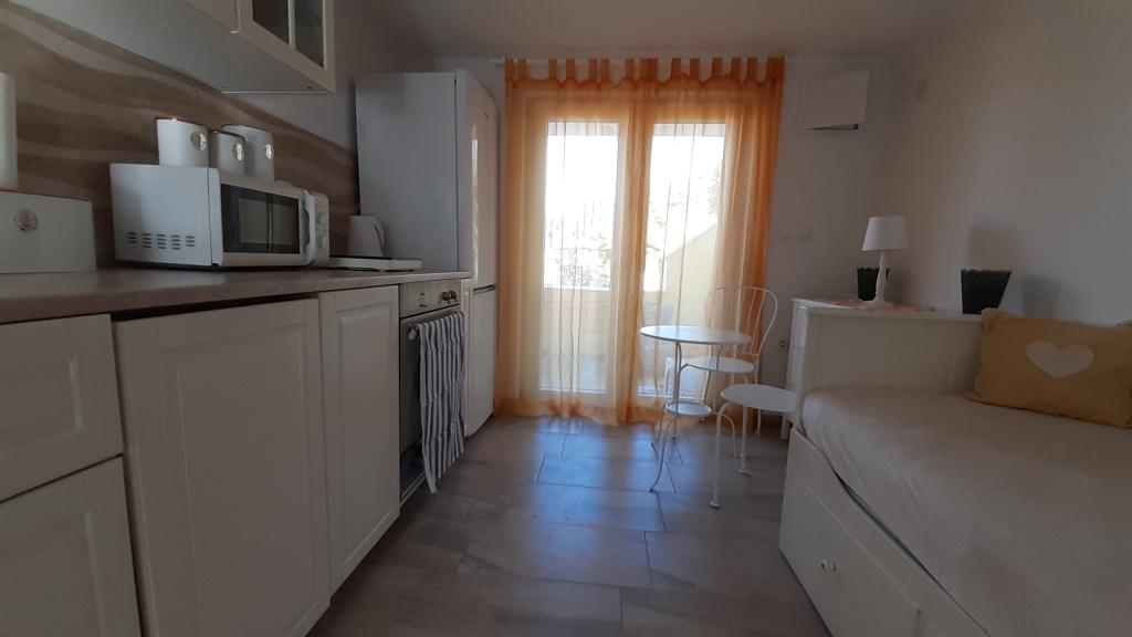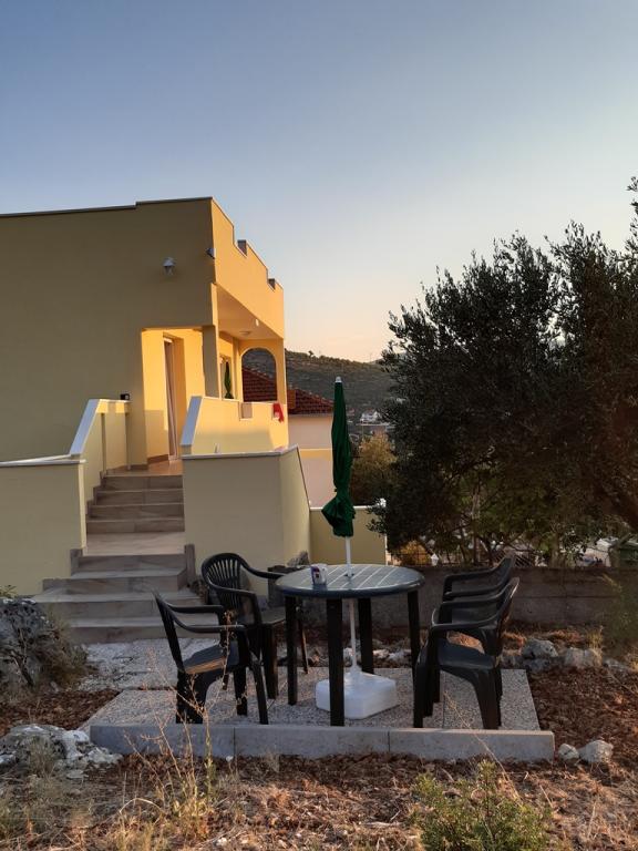 Apartmani se nalazi u samostalnom objektu renoviranom 2020. godine koji ima samo 4 apartmanske jedinice- svaki studio apartman za 2 2 osobe, u mirnom dijelu okružen dalmatinskim zelenilom. Apartman se sastoji od 1 spavaće sobe (bračni krevet 160x200), boravka (s krevetom na razvlačenje u ležaj 140x200) s kuhinjom (opremljena frižiderom, pločom za kuhanje, mikrovalnom i kuhalom te ostalim potrebnim priborom), kupaonice s tušem te perilicom rublja. Apartman je klimatiziran i ima besplatan WiFi. Balkon je prekrasan za jutarnju kavu uz izlazeće sunce ili navečer uz čašu domaćeg vina i svjetla Marinskog zaljeva. U dvorištu je moguće sjesti u sjenu masline ili suncobrana okružen maslinama, smokvama i drugim izvornim dalmatinskim zelenilom. U dvorištu je osiguran parking. Smještaj je nedaleko centra mjesta (5) s trgovinama, poštom, pekarom i ljekarnom te ambulantom i zubarskom ordinacijom te restoranima i caffe barovima, blizu starog središta s povijesnom kulom-simbolom tradicije (10)