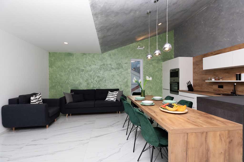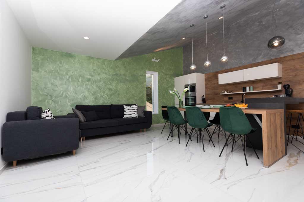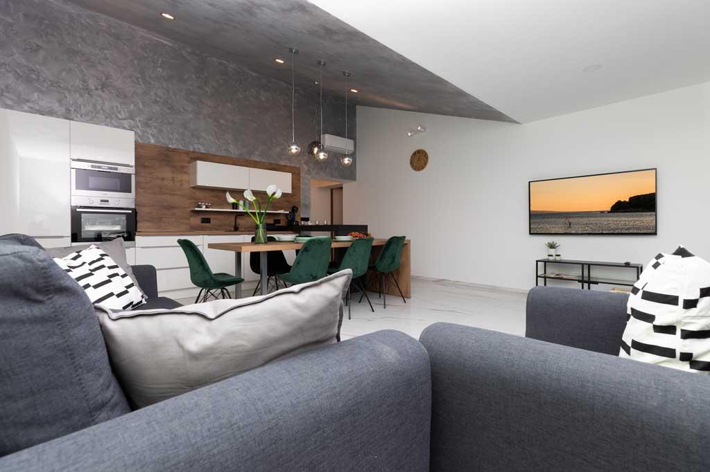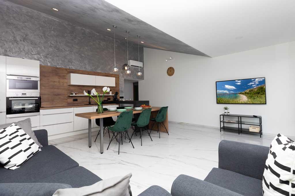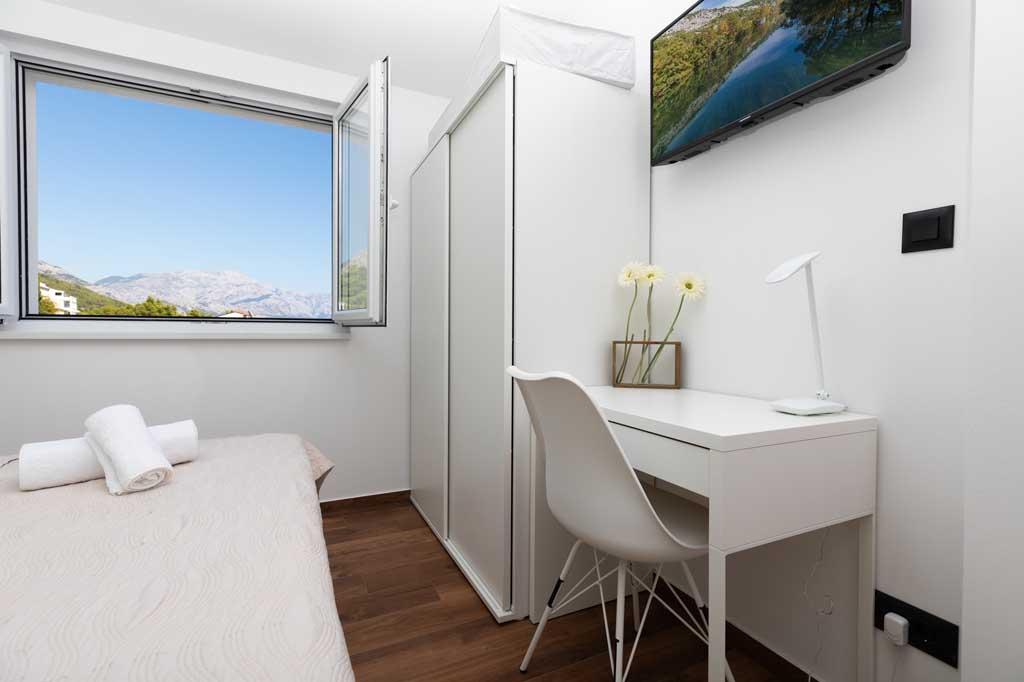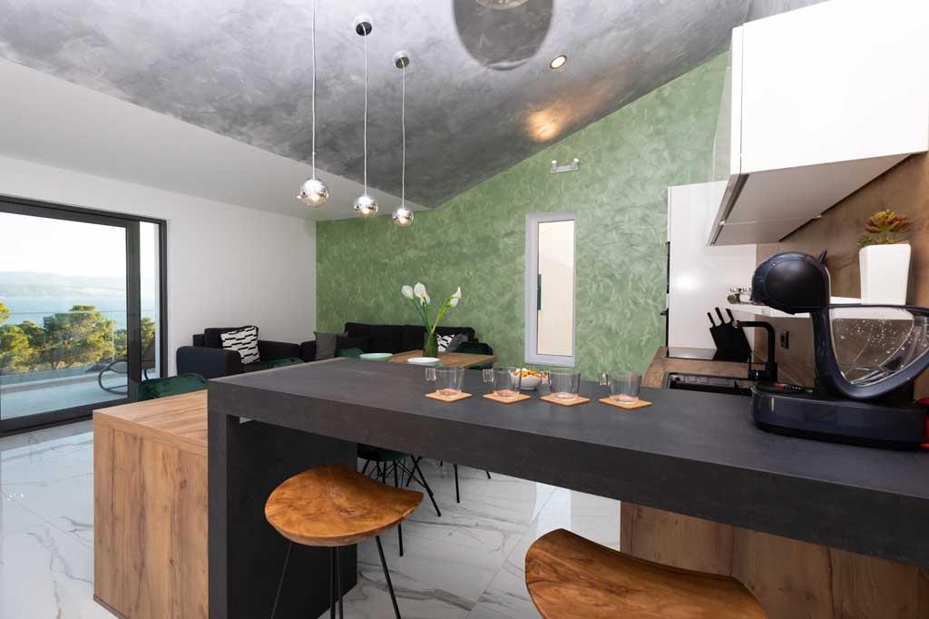 Veliki supermarket i pošta su udaljeni samo 700 m. Najbliži grad Omiš je udaljen 10 km. Grad Split je udaljen 30 km.