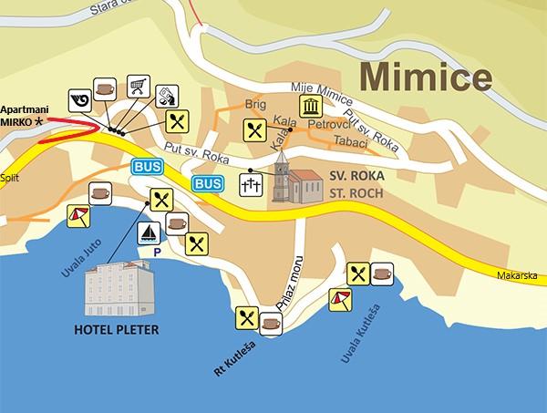 U blizini apartmana je kafić-pizzeria, pošta i market (1min hoda). Do plaže je 5-8min hoda. Besplatan parking i wi-fi Kuća se nalazi u mirnijem predjelu mjesta sa prostranim dvorištem. Mimice se nalaze u blizini Omiša, Makarske i Splita, što je idealno za obilaske. Dodatni sadržaji i aktivnosti: rafting na rijeci Cetini, zipline, pješačke staze, biciklizam, ronjenje, izleti brodom, Skywalk Biokovo... Za sve ostale informacije, slobodno nas kontaktirajte. DOBRODOŠLI! Danijela & Mirko