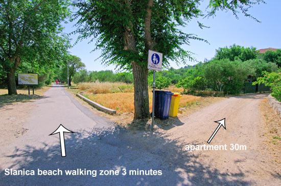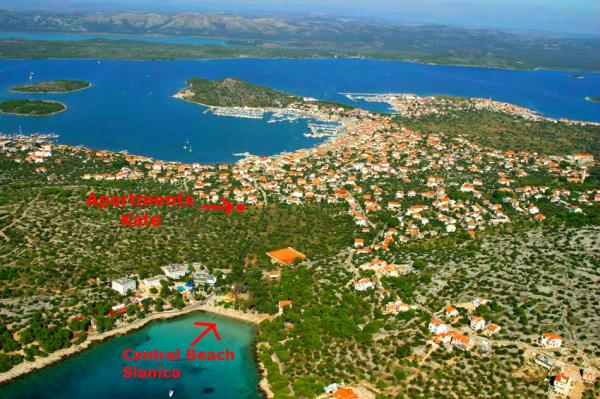 Apartmani Kate su smješteni u mjestu Murter, na otoku Murteru, koji se nalazi između Zadra i Šibenika. Murter je otok povezan mostom (nije potreban trajekt za dolazak do otoka Murtera) te se nalazi u blizini čak tri Nacionalna parka. Lokacija apartmana Kate je izuzetno pogodna zbog blizine glavne plaže u Murteru Slanica. Od apartmana do glavne plaže dijele samo maslinici i pješačka staza te se nalaze na tek nekoliko minuta hoda do plaže Slanica. U blizini apartmana Kate nalaze se čak tri plaže: Slanica, Luke i Podvrške Apartmani su okruženi maslinicima te se pogled pruža isključivo na prirodni okoliš, što omogućava ugodan prirodni ambijent za vrijeme boravka u apartmanima. Apartman Kate je potpuno opremljen (Wi-Fi, Tv/Sat, klima, parking) te se sastoji od odvojene spavaće sobe, kuhinje sa sofom na razvlačenje, kupaonice (45 m2) te terase (10 m2) i vrta.