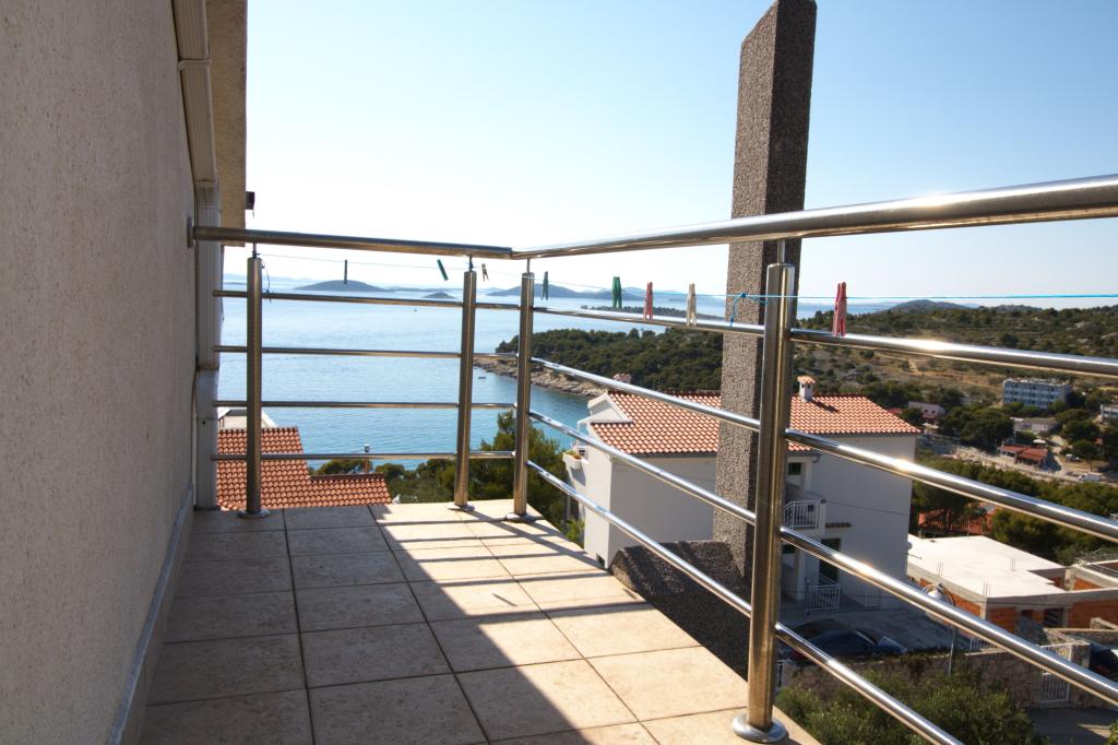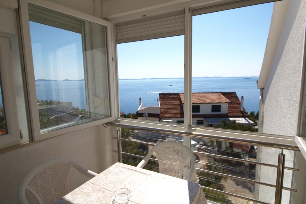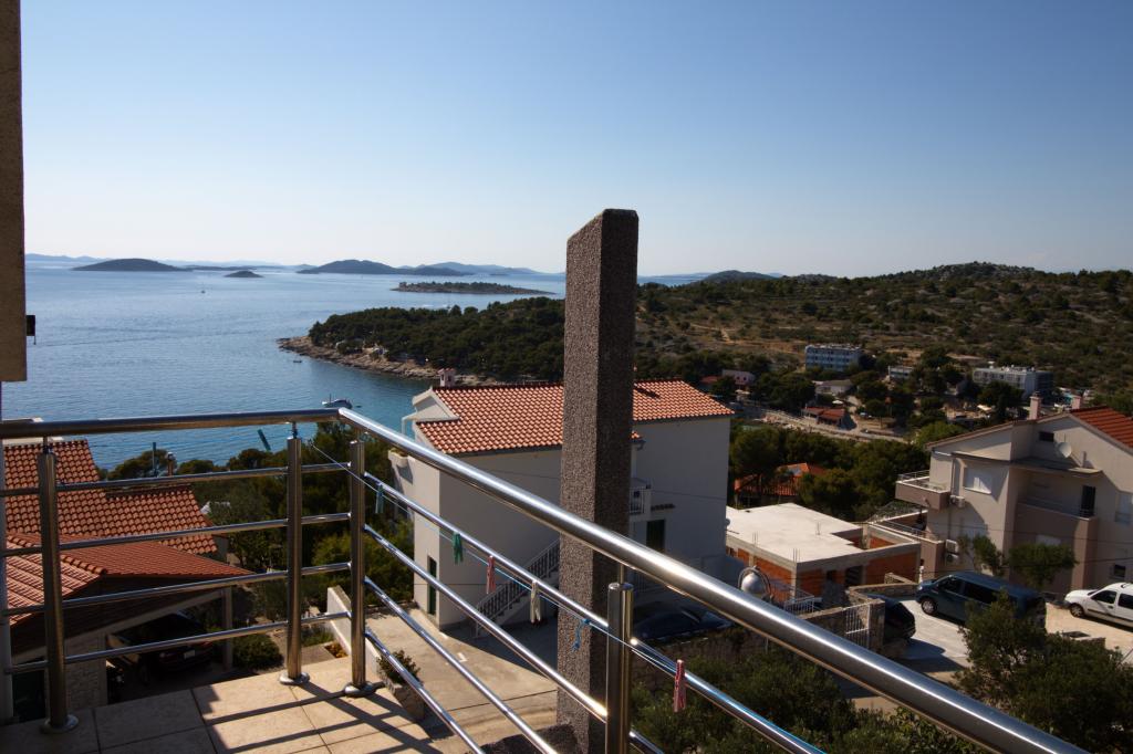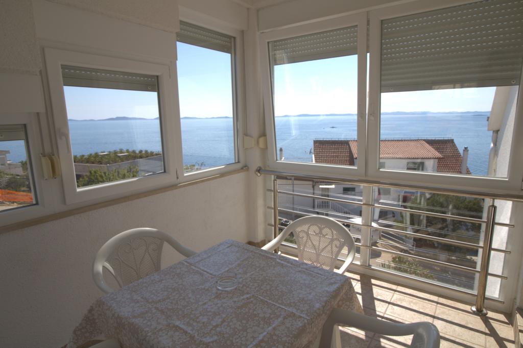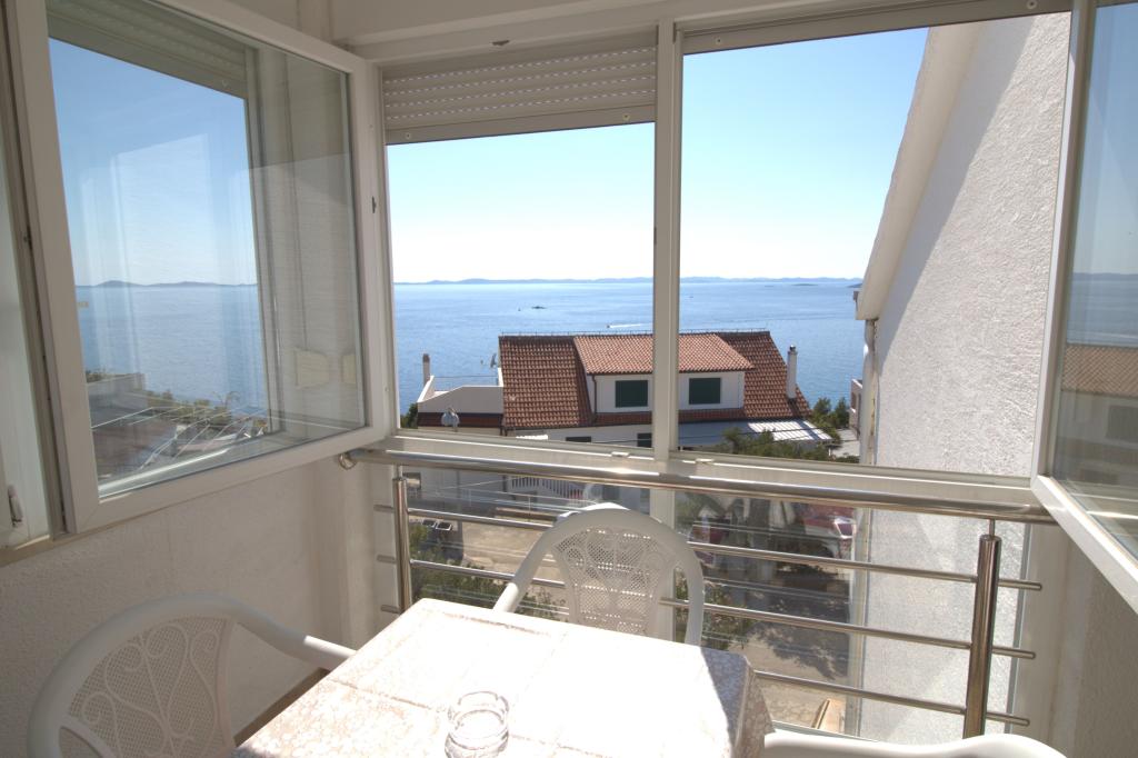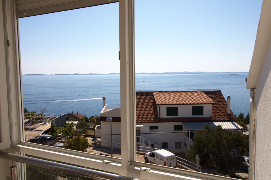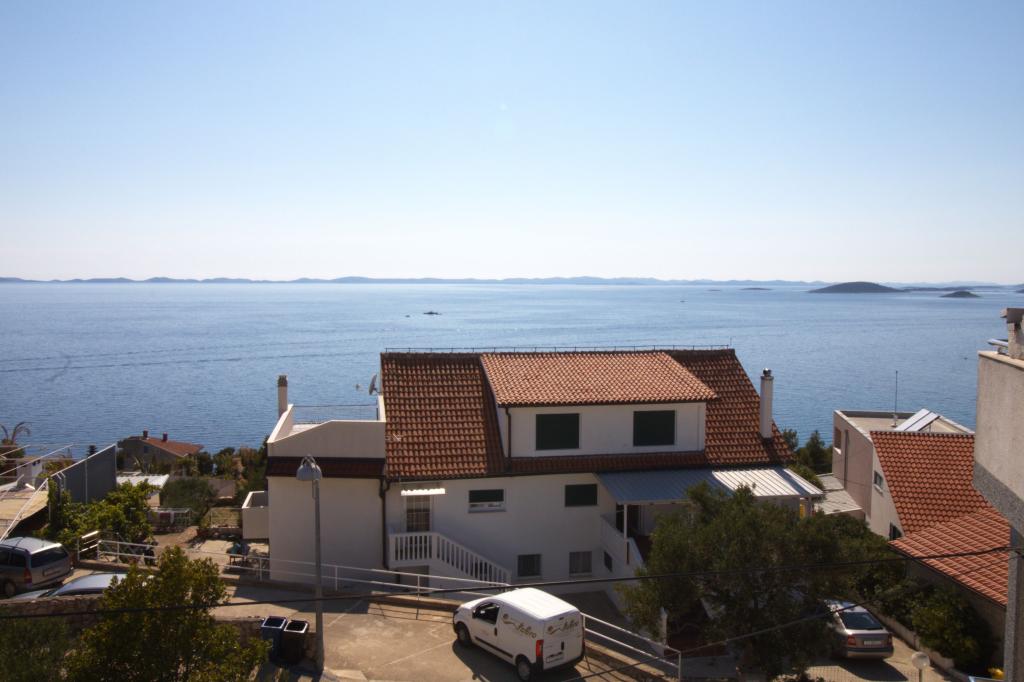 Apartman sa prekrasnim pogledom na more se nalazi na izvrsnoj lokaciji samo 300 metara udaljen od mora. Apartman ima površinu od 75 m2. Ima dvije spavaće sobe u kojima mogu spavati 5 odraslih osoba. Ima dnevni boravak. Ima pomoćni ležaj za jednu osobu. Ima kupaonicu sa tuš-kadom. Površina Balkon/terase je 12 m2. Apartman se nalazi na drugom katu kuće. Apartman je opremljen sa tv-om, satelitskim prijemnikom, pećnicom. Parking je osiguran i uključen u cijenu. Postoji vanjski roštilj koji se može koristiti. Apartman je oko 1000 m. udaljen od centra mjesta a 300 m. od mora ili prve plaže u mjestu Murter. Apartman ima prekrasan pogled na more, na pješčanu uvalu Slanica i kornatsko otočje.