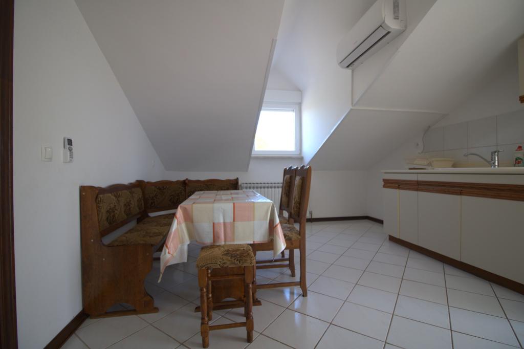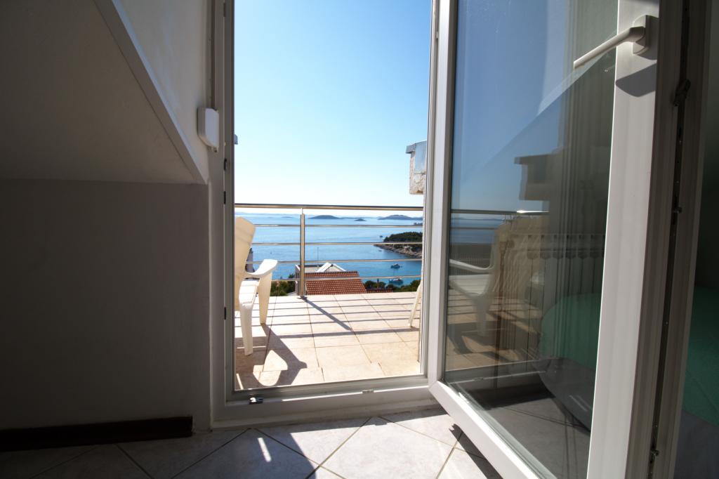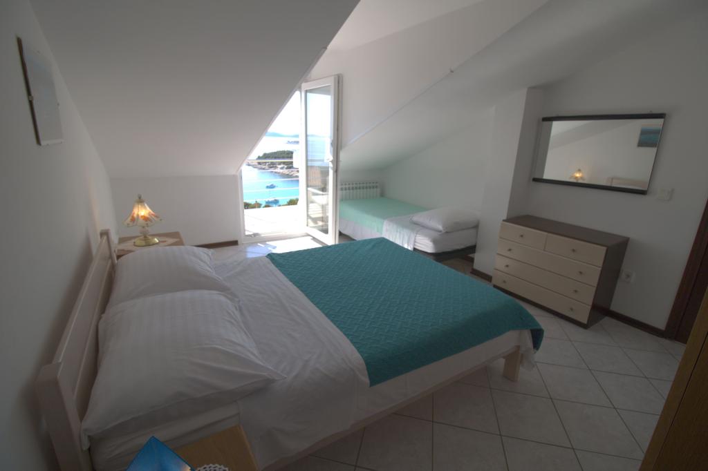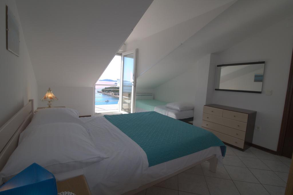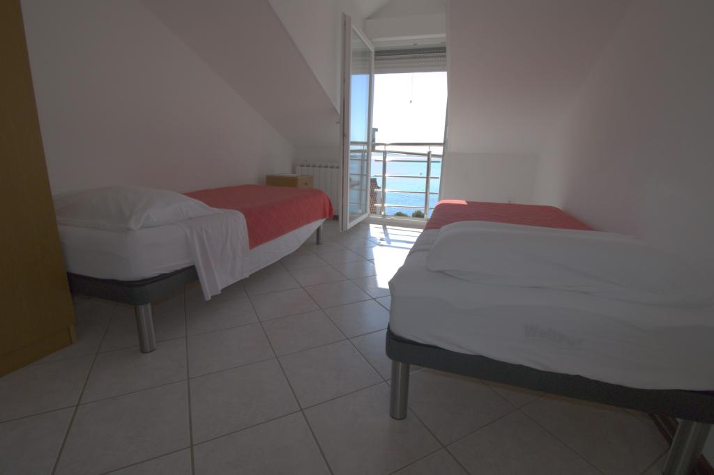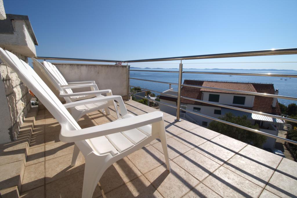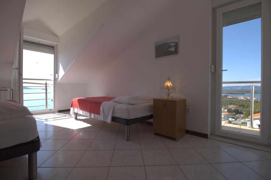Apartman sa prekrasnim pogledom na more se nalazi na izvrsnoj lokaciji samo 300 metara udaljen od mora. Apartman ima površinu od 75 m2. Ima dvije spavaće sobe u kojima mogu spavati 5 odraslih osoba. Ima dnevni boravak. Ima pomoćni ležaj za jednu osobu. Ima kupaonicu sa tuš-kadom. Površina Balkon/terase je 12 m2. Apartman se nalazi na drugom katu kuće. Apartman je opremljen sa tv-om, satelitskim prijemnikom, pećnicom. Parking je osiguran i uključen u cijenu. Postoji vanjski roštilj koji se može koristiti. Apartman je oko 1000 m. udaljen od centra mjesta a 300 m. od mora ili prve plaže u mjestu Murter. Apartman ima prekrasan pogled na more, na pješčanu uvalu Slanica i kornatsko otočje.