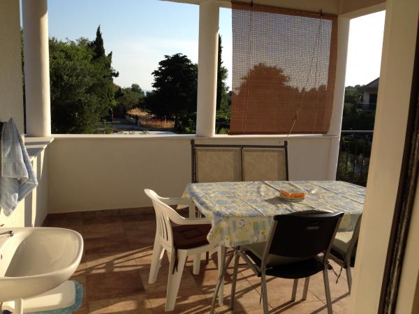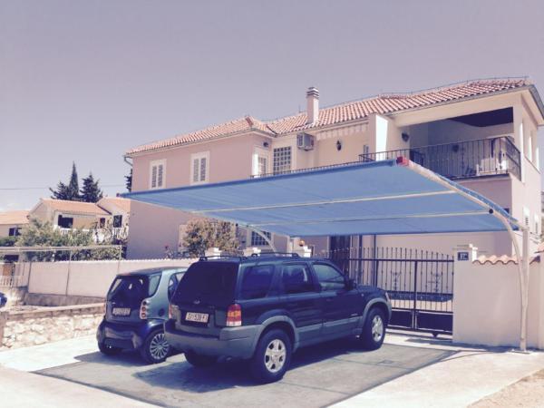 JEDOSOBN)I APARTMAN (3 osobe) Apartman je na 1. katu novoizgradjene kuce udaljen svega 300 metara od pjescane plaze Slanica, a isto toliko od plaze u Lukama. Apartman je povrsine 70 m2 i posjeduje vlastitu veliku terasu/tenda. Sastoji se od velike spavace sobe s bracnim krevetom, kupaone s tus kadom, kuhinja s dnevnim boravkom. Iz apartmana se pruza divan pogled na mjesto Murter. Apartman je klimatiziran i ima osigurano 1 parking mjesto i besplatan internet. DVOSOBNI APARTMAN (4 1) Apartman je na 1. katu povrsine preko 80 m2 posjeduje kupaonu s tus kadom, kuhinnju s dnevnim boravkom. Ima dvije spavace sobe s bracnim krevetom.Pored toga gosti ovog apartman pored balkona u sklopu apartmana imaju mogucnost koristenja velike natkrite terase 35m2 pogodne za serviranje obroka, suncanje, odmor i dnevni boravak.