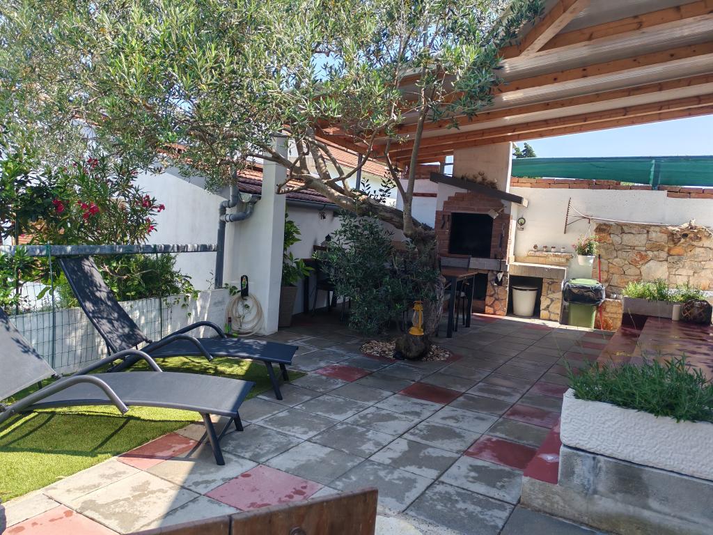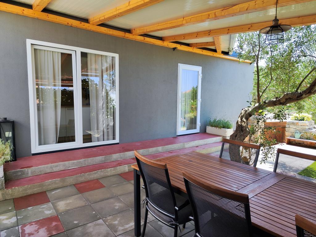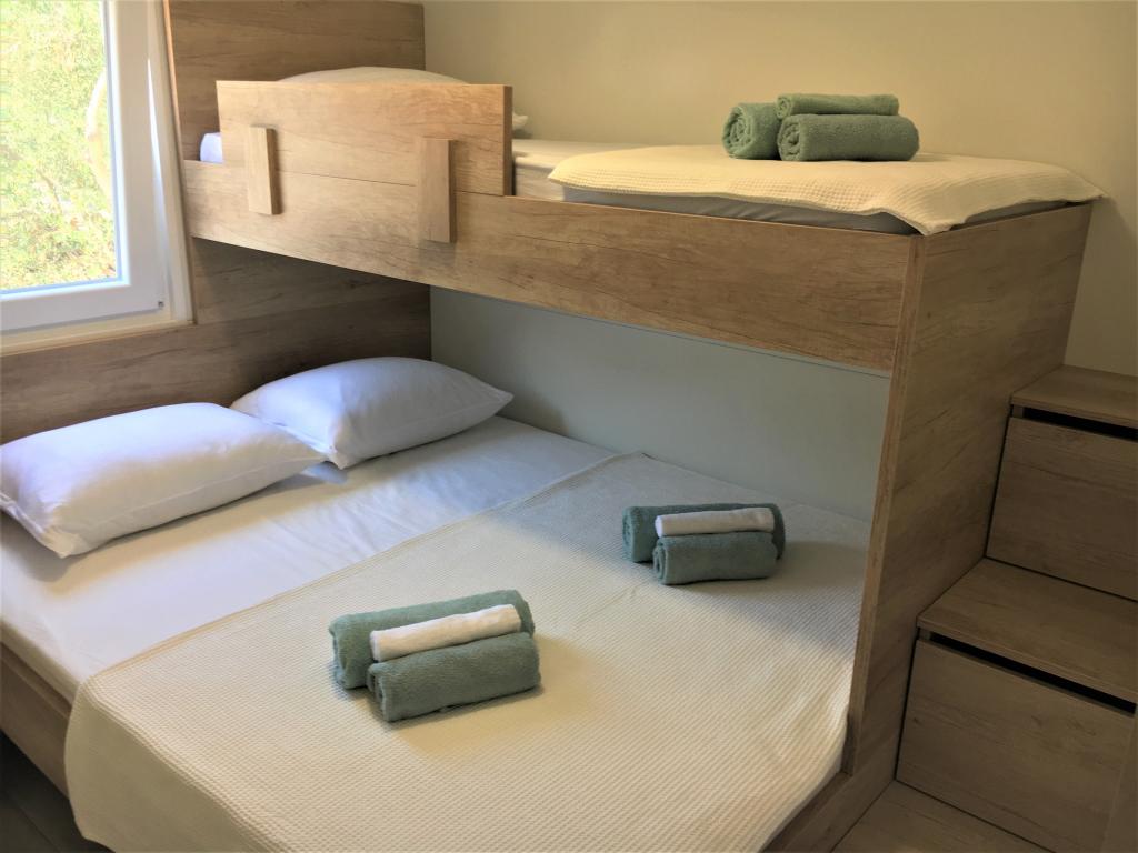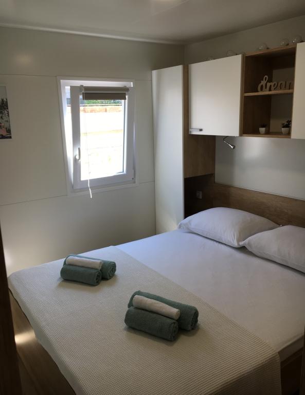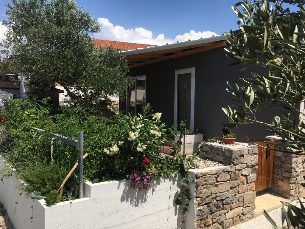 Mobilna kućica u vrtu punom maslina i zelenila, idealno za obitelji i osobe koje vole privatnost. Moderna i suvremeno opremljena kućica, udaljena svega 400metara od glavne, pješčane plaže Slanice, a od centra 10 minuta hoda. Blizu restorana, kafića, trgovine... Kućica ima 38m2, terasa 30m2. U kući se nalazi dvije sobe, jedna sa bračnim krevetom(160x200), a druga ima dva odvojena kreveta, donji za dvije osobe, a krevet na kat za jednu osobu. U dnevnom boravku je kutna garnitura koja se može koristiti kao pomoćni ležaj za jednu osobu ili dvoje male djece, te kuhinja i kupaonica. Na terasi se nalazi blagovaonski stol smješten odmah uz grill, te ležaljke za uživanje u ljetnim večerima. Parkirno mjesto je osigurano odmah pored kućice.