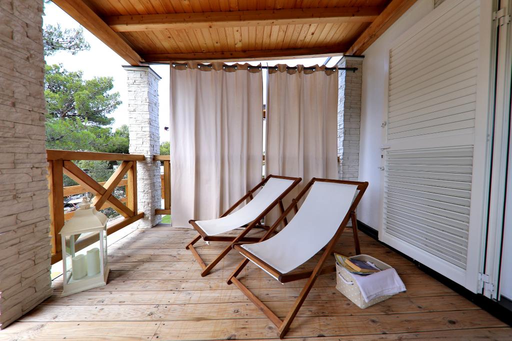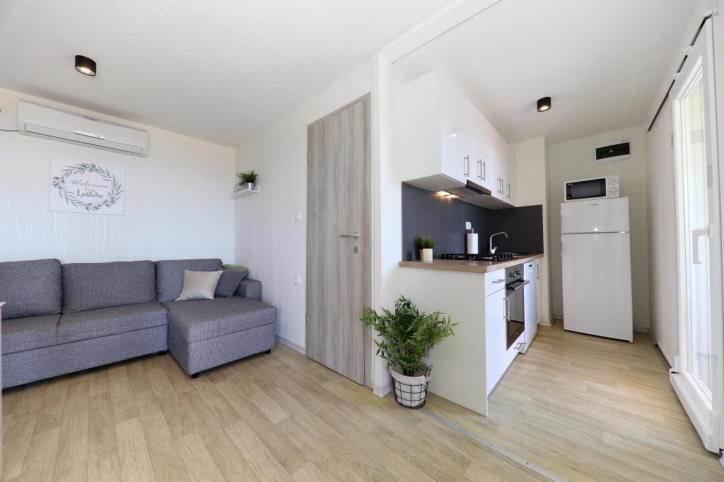 Mobilne kuće u kampu Lostura nalaze se u neposrednoj blizini jedne od najljepših plaža na Jadranu, Slanice!. Mobilna kuća se nalazi svega 30m od mora te 200m od pješčane plaže Slanica. Kućica ima 40m2 terasa 20m2. U kući se nalaze dvije spavaće sobe, jedna sa bračnim krevetom(160x200), te soba sa dva odvojena kreveta (80x200). U dnevnom boravku je kutna garnitura koja se može koristiti kao pomoćni ležaj za jednu odraslu osobu ili dvoje male djece. Kuhinja je potpuno opremljena sa svim potrebnim aparatima (frižider sa zamrzivačem, pećnicom, mikrovalom, perilicom posuđa, kuhalom za vodu, kuhalom za kavu). Kupaonica sa tuš kabinom, perilicom rublja, fenom za kosu, kupaonskim priborom. U dnevnom boravku se nalazi TV sa satelitskim resiverom, besplatni internet, Klima za hlađenje i grijanje. Na terasi se nalazi blagovaonski stol sa stolicama te ležaljka za sunčanje i uživanje u prekrasnom pogledu na Kornatsko otočje i plažu Slanica. Parkirno mjesto nalazi se u neposrednoj blizini kućice