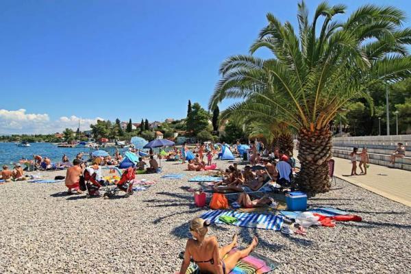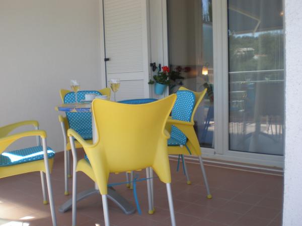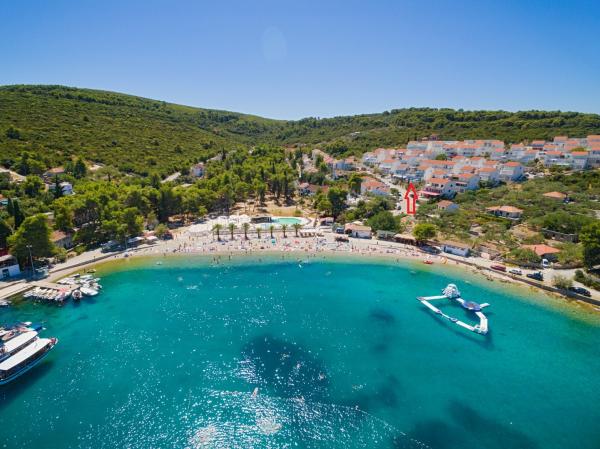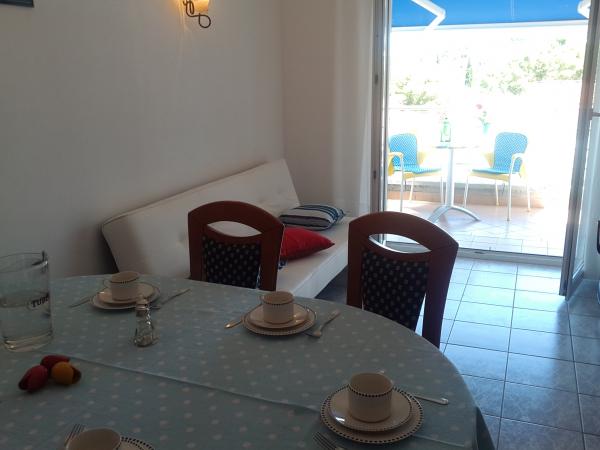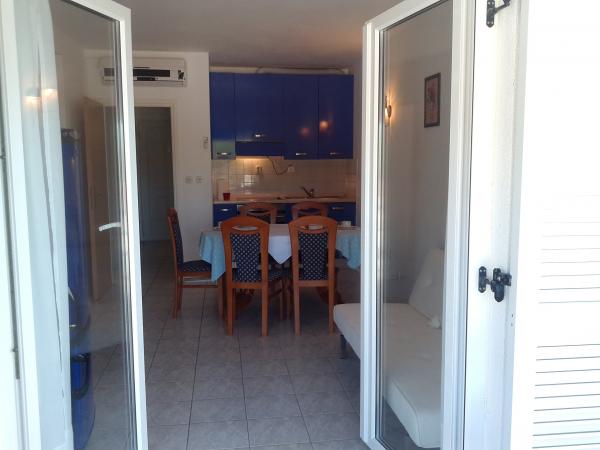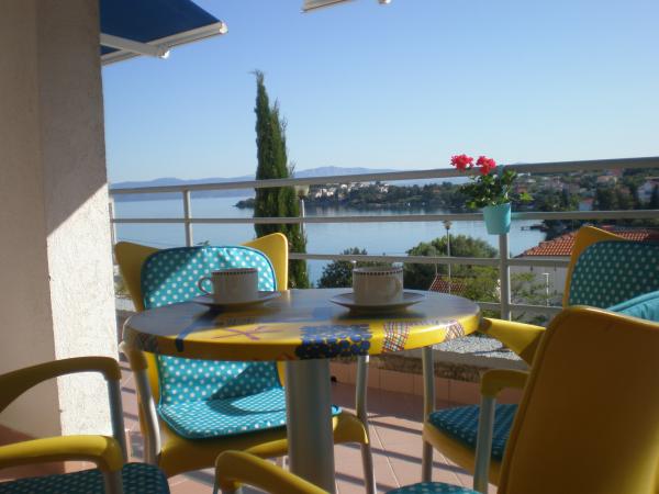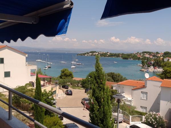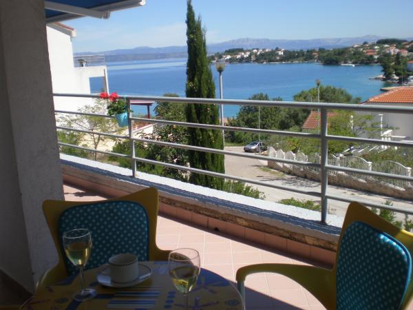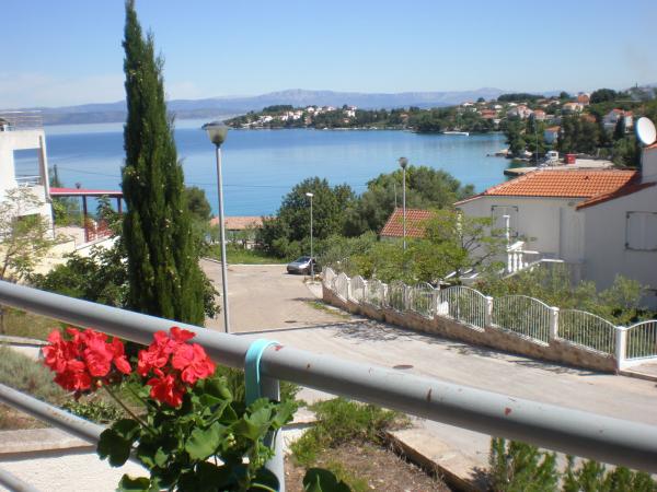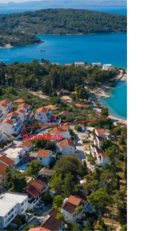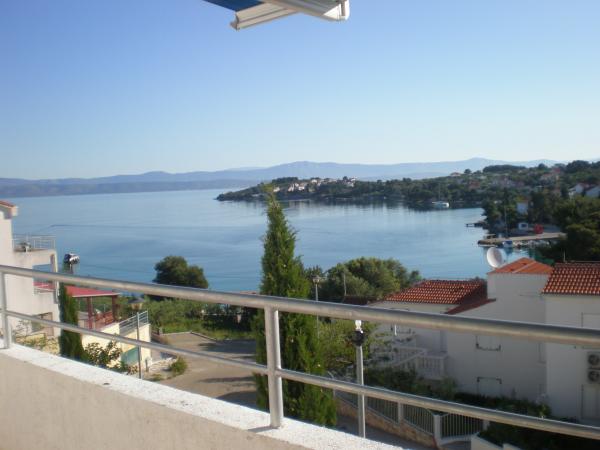 Kompletno i suvremeno opremljen apartman u neposrednoj blizini šljunčane plaze. Objekt se nalazi 2 minute hoda od plaže i centra mjesta. Sastoji se od ulaznog hodnika, dvije spavače sobe, kupaonice, dnevnog prostora s kuhinjom te velikog balkona. S balkona se pruža pogled na plažu, borovu šumu, uvalu te u daljini na otok Čiovo i grad Split. U većoj spavaćoj sobi se nalaze kreveti za tri osobe: veliki krevet za dvije osobe te krevet za jednu osobu. Manja soba je opremljena jednim krevetom za dvije osobe čija orijentacija omogućava gostu buđenje uz pogled na more iz kreveta. Kuhinja je opremljena svim potrebnim kućanskim aparatima: hladnjak, pećnica, štednjak, perilica suđa, perilica rublja, kuhalo za vodu, te ostalim kuhinjskim potrepštinama. Gostima su na raspolaganju i električni te roštilj na ugljen. U dnevnom prostoru se nalazi veliki kuhinjski stol, kauč i televizija. Pored apartmana se nalazi javni parking, koji se ne plaća, ali nije moguća rezervacija.