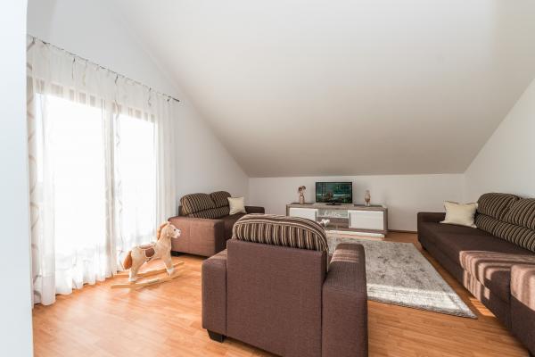 Apartman se nalazi u mjestu Vrsi-Mulo, udaljenom 20 km sjeverozapadno od Zadra. Apartman je na katu obiteljske kuće (kompletan kat unutarnje površine 120 m2), vlasnici žive u prizemlju, ulaz je zajednički! Apartman se sastoji od 3 sobe, velike kompletno opremljene kuhinje sa perilicom posuđa, dnevnog boravka sa smart tv/sat tv, WIFI, kupaone sa perilicom rublja, dodatnog toaleta, 3 terase od kojih su 2 sa pogledom na more. Klima je u svakoj sobi u apartmanu. Kuća je okružena velikim dvorištem u kojem se nalazi vrtni roštilj, ljuljačke, trampolin i šljunčanik za dječju igru, te je osiguran parking za više automobila.