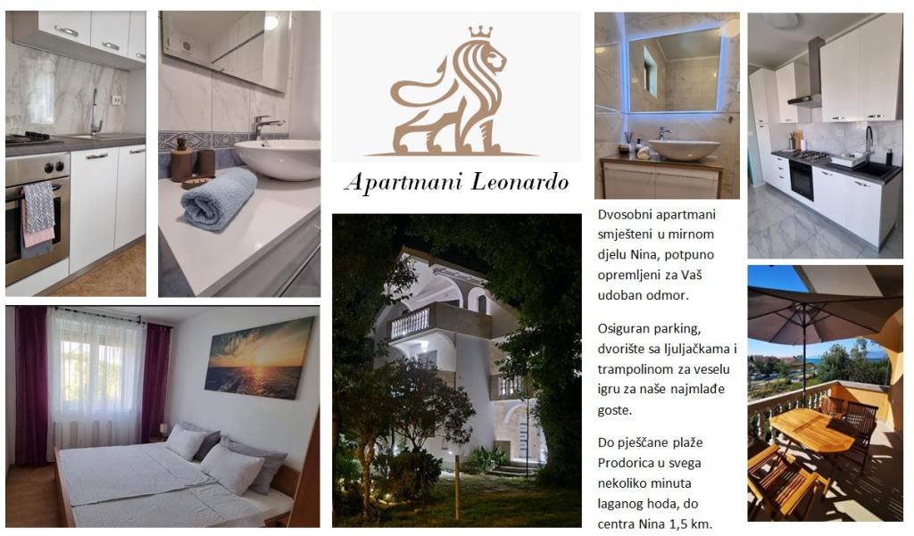 Apartmani Leonardo smješteni su u obiteljskoj kući sa ukupno 3 apartmana. Kuća se nalazi u mirnom dijelu mjesta, u blizini pješčane plaže Prodorica koja je izvrstan odabir za obitelji s djecom. Do centra Nina dijeli vas 15 min lagane šetnje ili 5 min vožnje autom. Apartmani se sastoje od dvije spavaće sobe sa bračnim krevetom i dva odvojena kreveta, kupaonice sa kadom/tuš kabinom, potpuno opremljene kuhinje i blagovaonice, te vanjske natkrivene terase. Gostima su na raspolaganju: klima, TV, mikrovalna, kuhalo za vodu, perilica rublja, fen, pegla, dječji kinderbet i hranilica. Parking je osiguran u dvorištu objekta za svaki apartman.