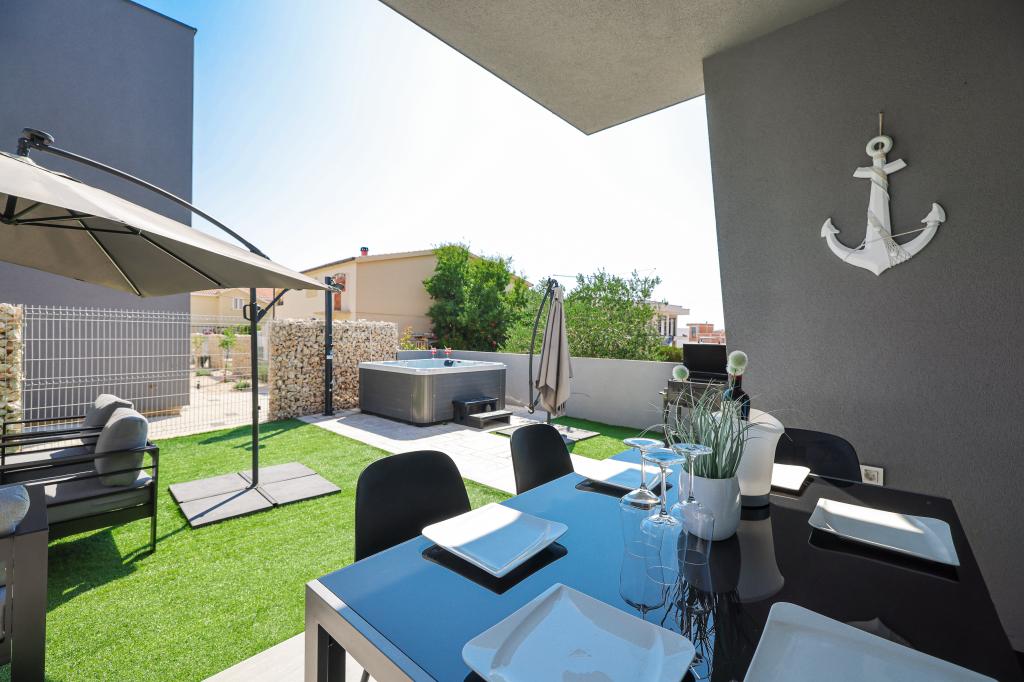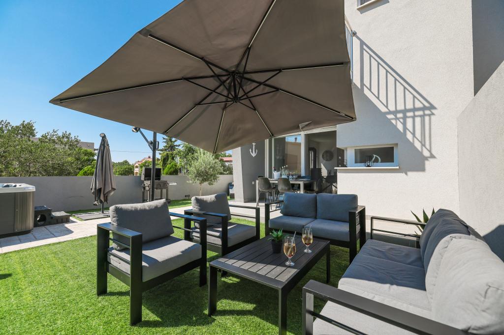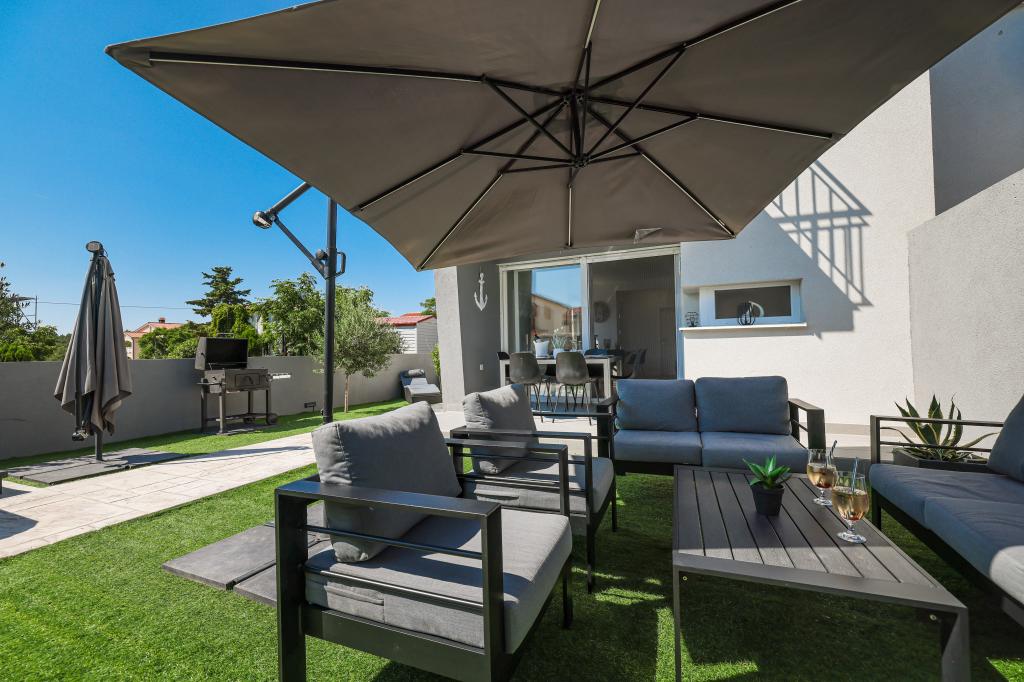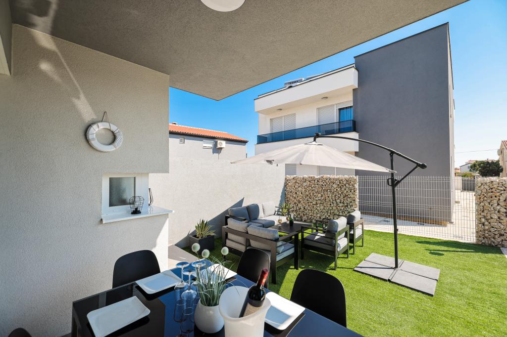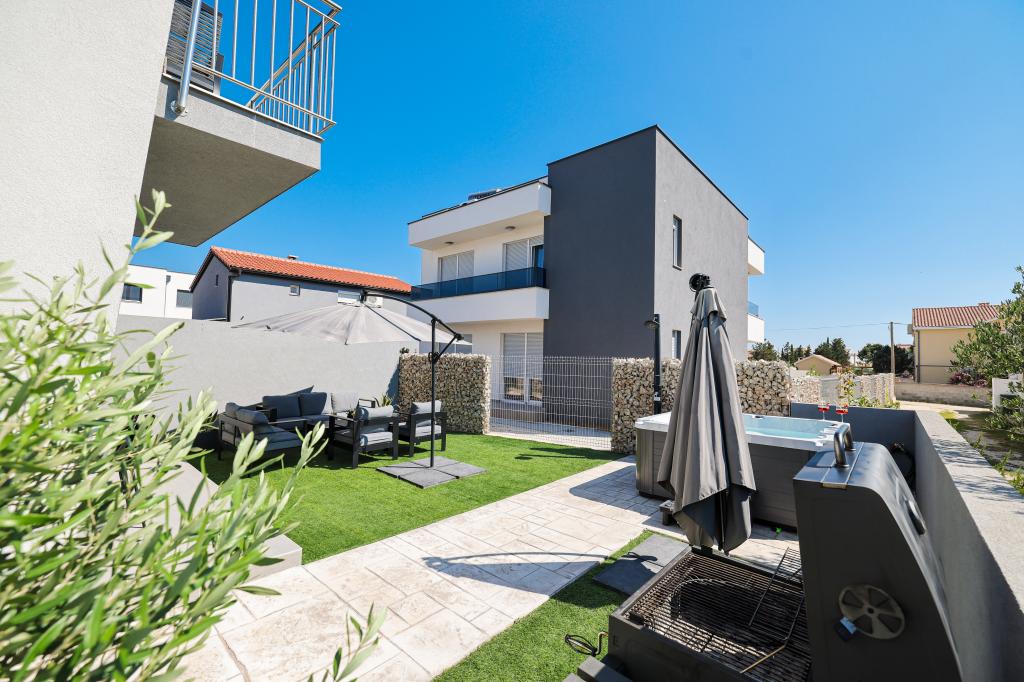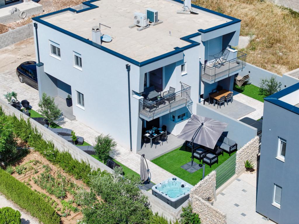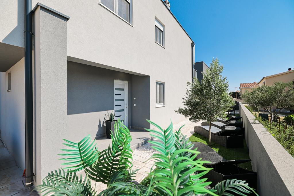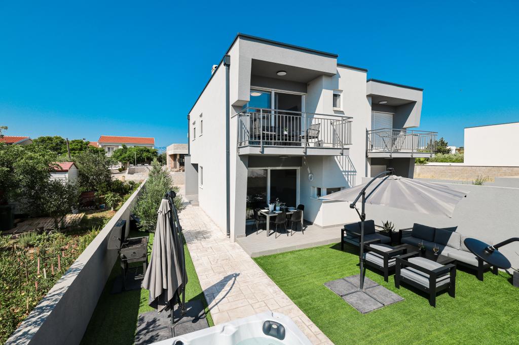 Moderan i potpuno uređen trosoban apartman u mirnom i tihom dijelu naselja Vrsi. Objekt se nalazi 800 metara od mora, ima 3 spavaće sobe opremljene klima uređajem i TV-om, dvije kupaone, prekrasnu terasu sa masažnom kadom, stolom za objedovanje i ležaljkama za sunčanje. Kuhinja je potpuno opremljena, a u zajedničkom prostoru dostupan je još jedan TV i klima uređaj. Za grupe 6+2 moguća su 2 pomoćna ležaja.