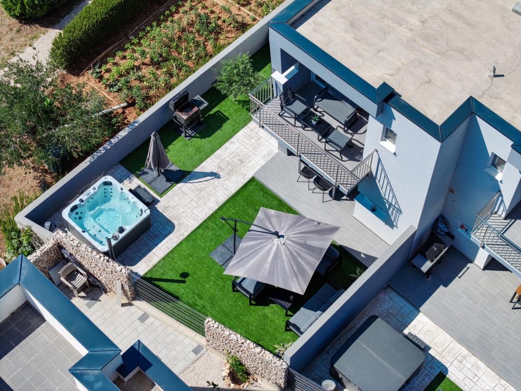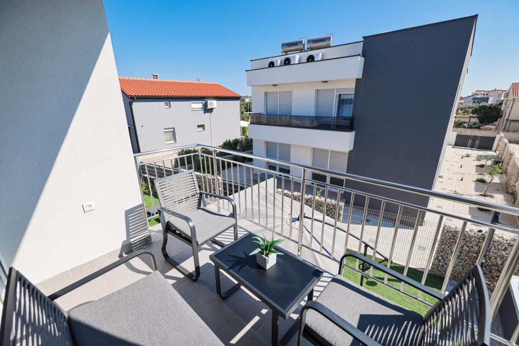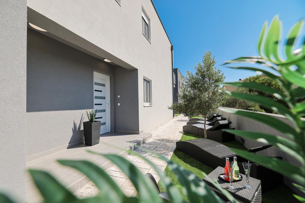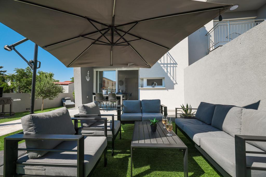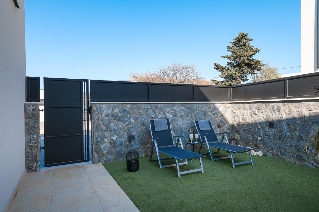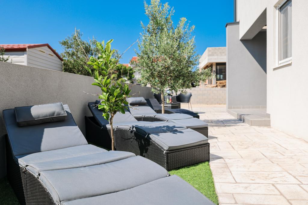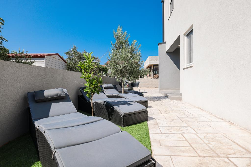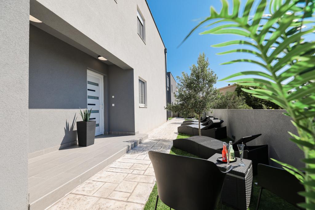 Moderan i potpuno uređen trosoban apartman u mirnom i tihom dijelu naselja Vrsi. Objekt se nalazi 800 metara od mora, ima 3 spavaće sobe opremljene klima uređajem i TV-om, dvije kupaone, prekrasnu terasu sa masažnom kadom, stolom za objedovanje i ležaljkama za sunčanje. Kuhinja je potpuno opremljena, a u zajedničkom prostoru dostupan je još jedan TV i klima uređaj. Za grupe 6+2 moguća su 2 pomoćna ležaja.