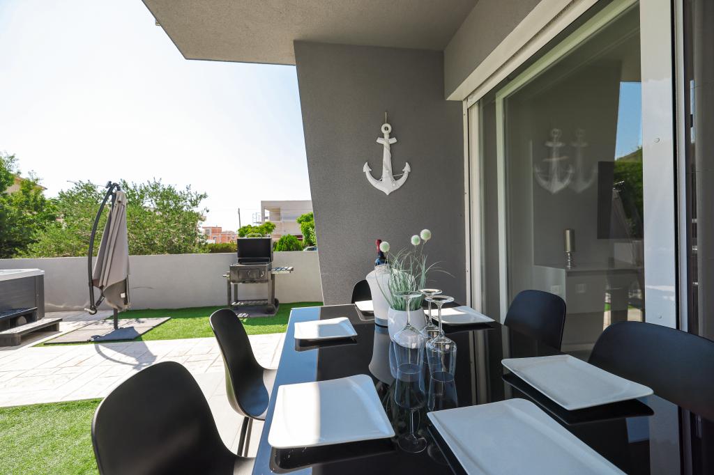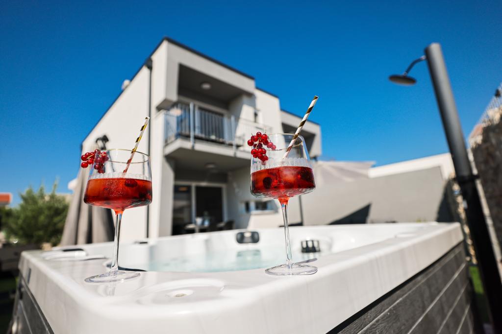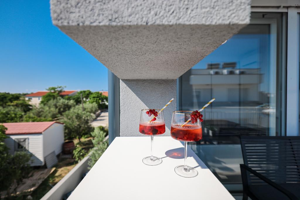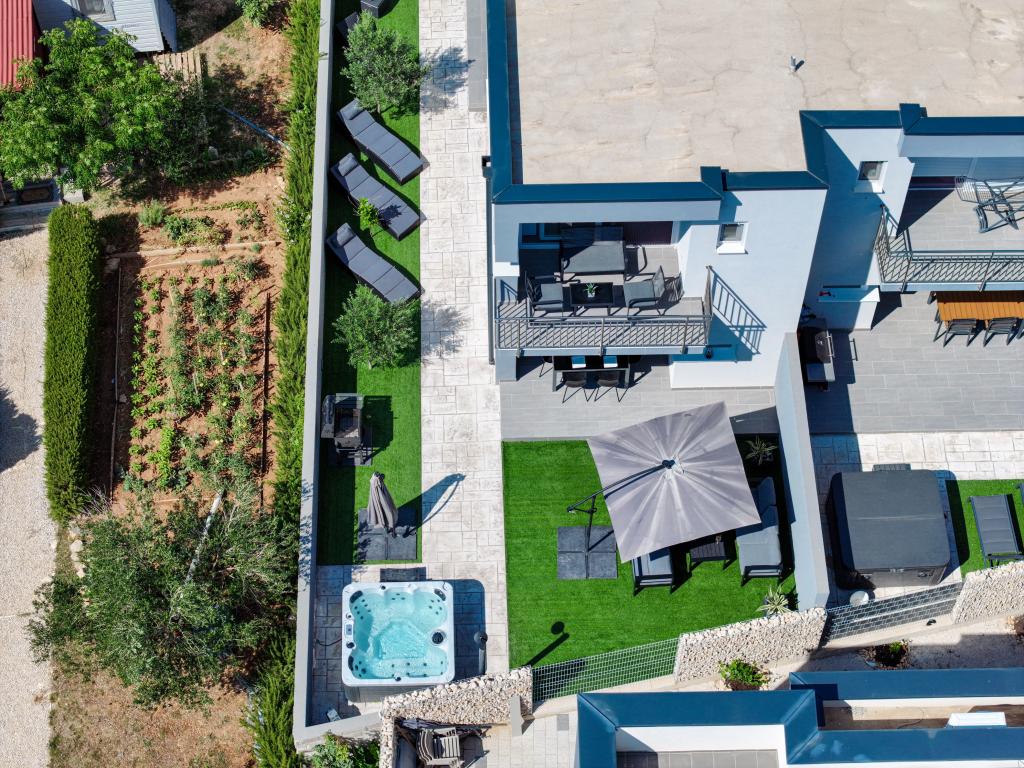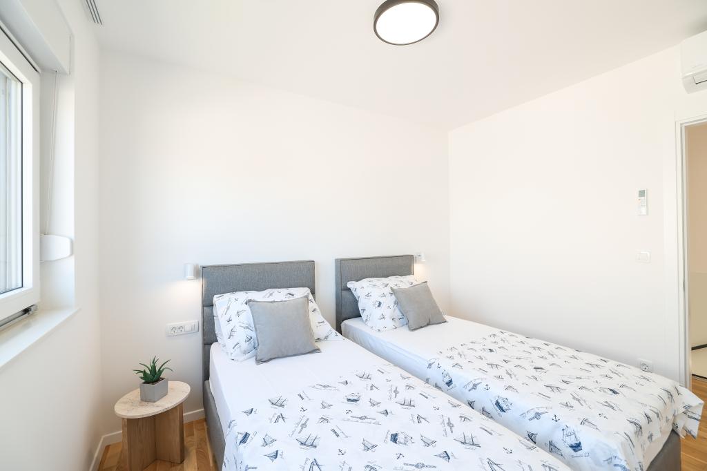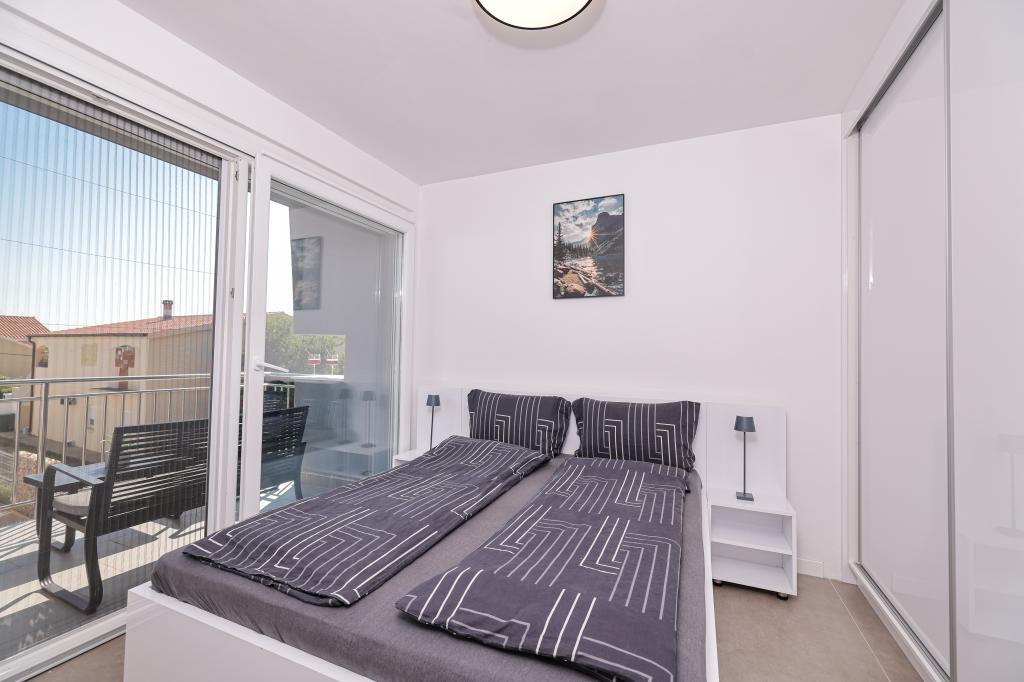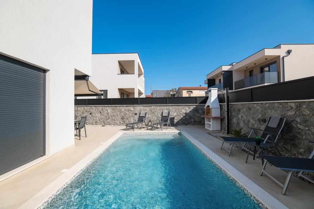 Moderan i potpuno uređen trosoban apartman u mirnom i tihom dijelu naselja Vrsi. Objekt se nalazi 800 metara od mora, ima 3 spavaće sobe opremljene klima uređajem i TV-om, dvije kupaone, prekrasnu terasu sa masažnom kadom, stolom za objedovanje i ležaljkama za sunčanje. Kuhinja je potpuno opremljena, a u zajedničkom prostoru dostupan je još jedan TV i klima uređaj. Za grupe 6+2 moguća su 2 pomoćna ležaja.