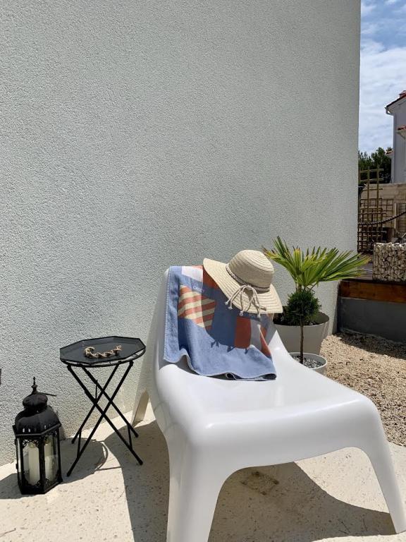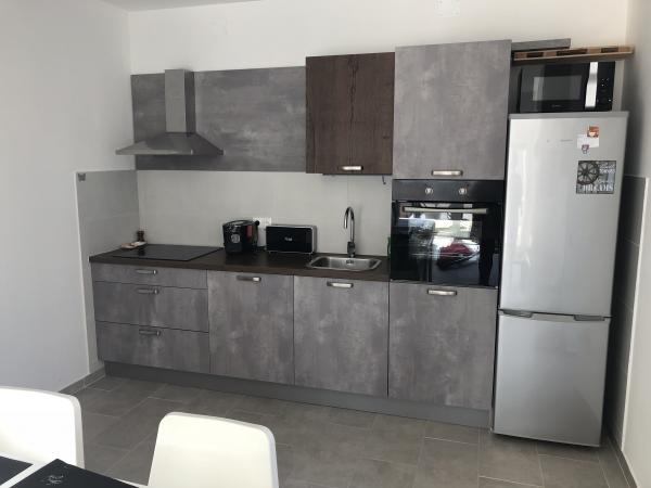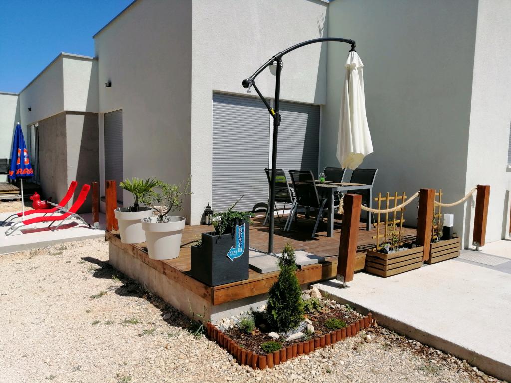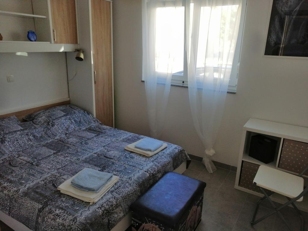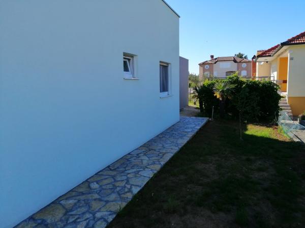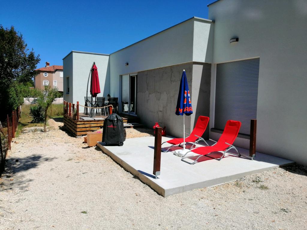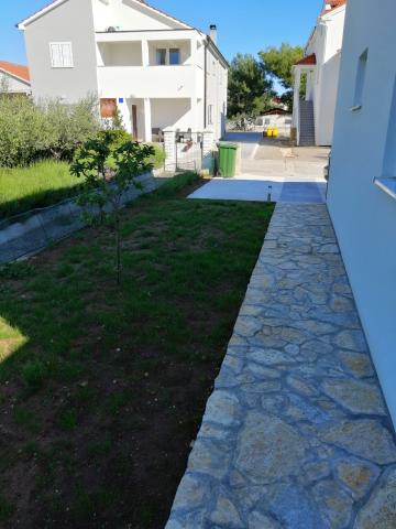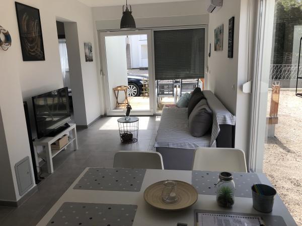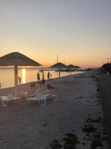 Potpuno novi apartmani, moderno uređeni. Svaki apartman iam 2 spavaće sobe, kompletnu kupaonicu ( perilica rublja) i dodatni wc. Kuhinja potpuno opremljena (pećnica, mikrovalna, perilica suđa, aparat za kavu, toster), prekrasna drvom obložena terasa. Oba apartmana su u prizemlju. Udaljeni od mora i šljunčane plaže 80 m, uz plažu šetnica, dječje igralište, odbojka na pijesku i ostali sadržaji. Osigurano parkiranje.