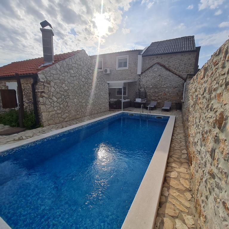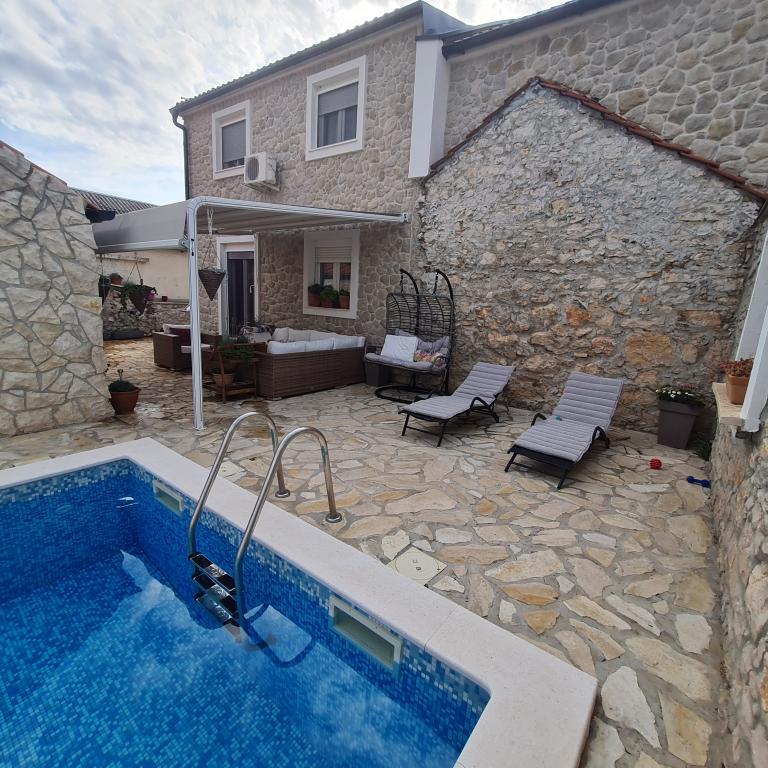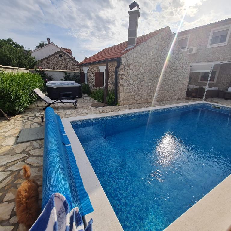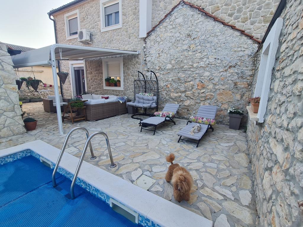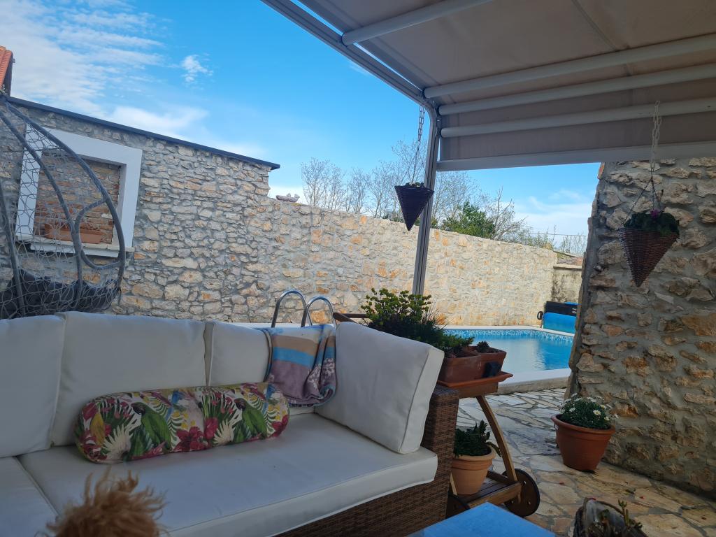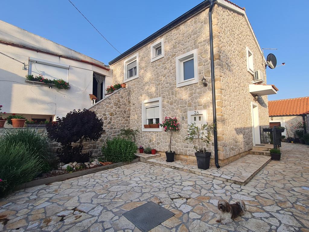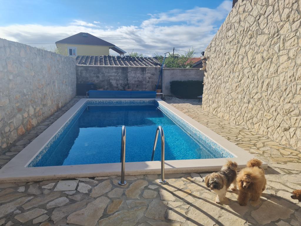Kompletno renovirana obiteljska kuca u predgradu Nina, mjesto Ninski stanovi. Predivno i skladno uredena, sa 3 spavace sobe. . Dvije sobe sa bracnin lezajem, jedna soba sa 3 lezaja. . U dnevnoj kutna garnitura i fotelje. U sklopu kuce se nalazi konoba izgradena u kamenu za ugodna prijateljska i obiteljska druzenja. Dvoriste je intimno okruzeno zidovima gdje imate potpunu intimu. Imate na raspolaganju i grijani bazen, vel. 8x3,5 te jacuzi za 5 osoba 2x2