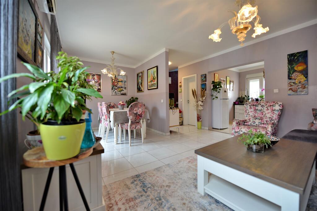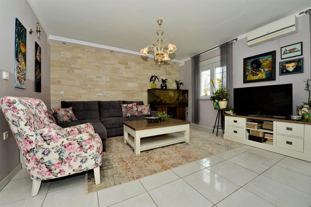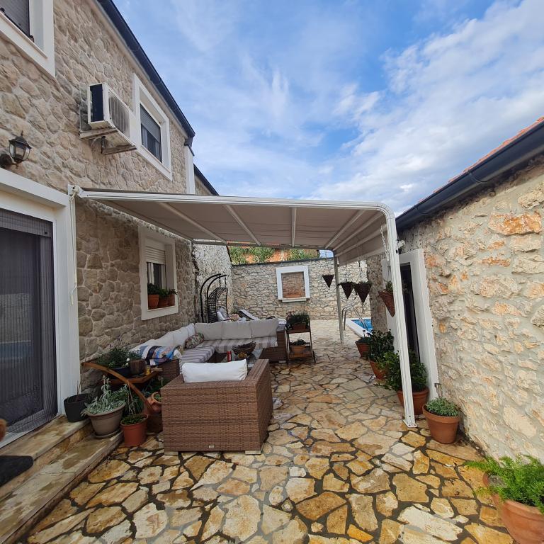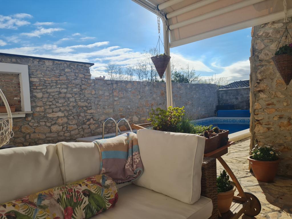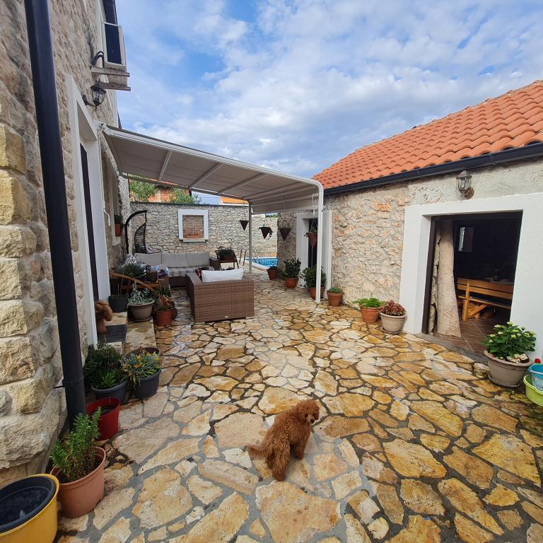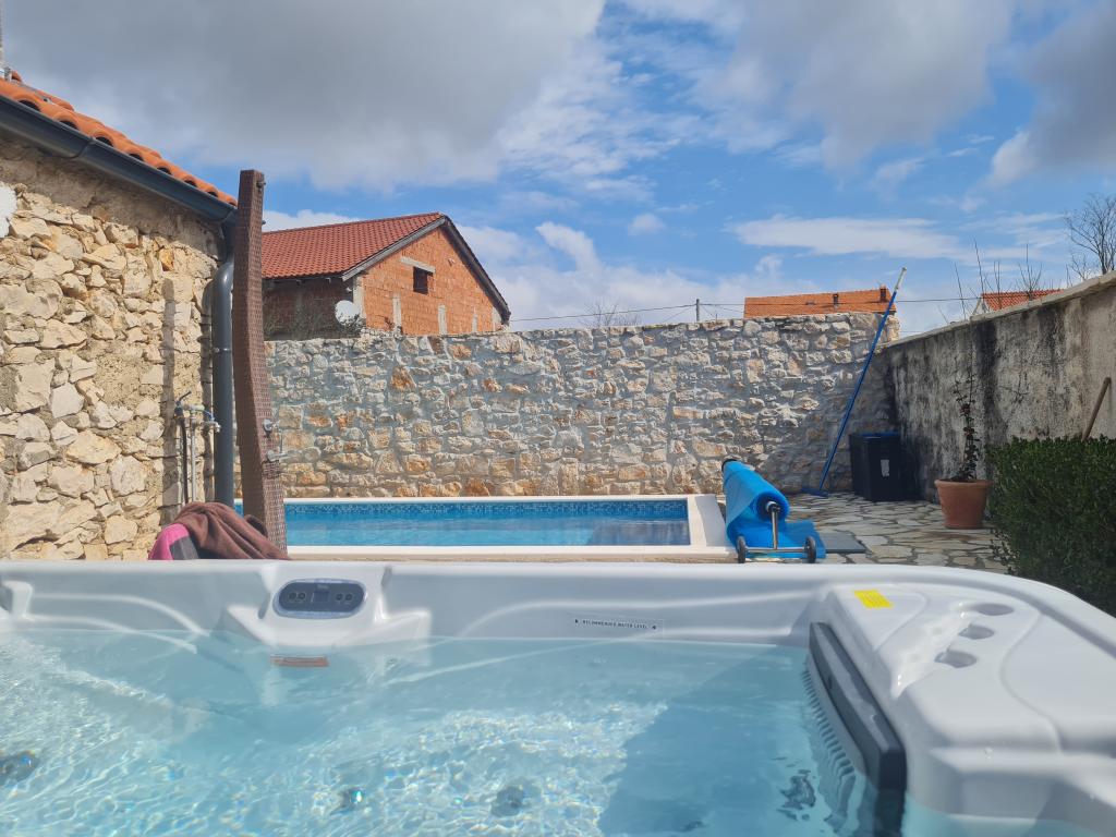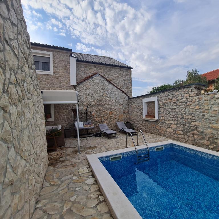 Kompletno renovirana obiteljska kuca u predgradu Nina, mjesto Ninski stanovi. Predivno i skladno uredena, sa 3 spavace sobe. . Dvije sobe sa bracnin lezajem, jedna soba sa 3 lezaja. . U dnevnoj kutna garnitura i fotelje. U sklopu kuce se nalazi konoba izgradena u kamenu za ugodna prijateljska i obiteljska druzenja. Dvoriste je intimno okruzeno zidovima gdje imate potpunu intimu. Imate na raspolaganju i grijani bazen, vel. 8x3,5 te jacuzi za 5 osoba 2x2