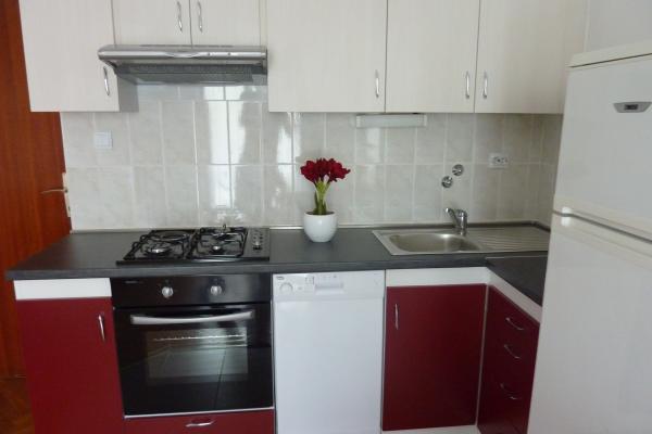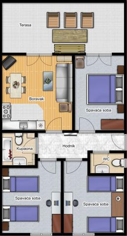 Tip smještaja: A6 Maksimalan broj osoba: 6 Kuhinja: Posuđe za pripremanje hrane i pića, krpe za posuđe, pribor za jelo, hladnjak s ledenicom, kuhalo za vodu, kave aparat, štednjak i pećnica. Sobe: Broj spavaćih soba: 3 Ukupan broj ležaja: 6 Broj francuskih kreveta: 1 Pomoćni krevet se nalazi u dnevnom boravku Komplet posteljina i ručnici. Dostupan je krevetić za bebe bez naknade. Kupaonica: Broj kupaonica: 1 Sadržaj: kada, umivaonik, wc WC: Broj WC-a: 1 Sadržaj: umivaonik, wc Uređaji: Televizor, klima Ostalo: Glačalo, sušilo za kosu, redovna zamjena posteljine i ručnika. Naravno, osiguran je i besplatan parking (2 mjesta) za Vaše vozilo kao i upotreba roštilja ako se želite okušati u pravljenju morskih specijaliteta na žaru. Besplatan pristup WiFi internetu. Kabelska TV Ljubimci su dobrodošli. Apartman se nalazi u prizemlju. Terasa – 20 m²