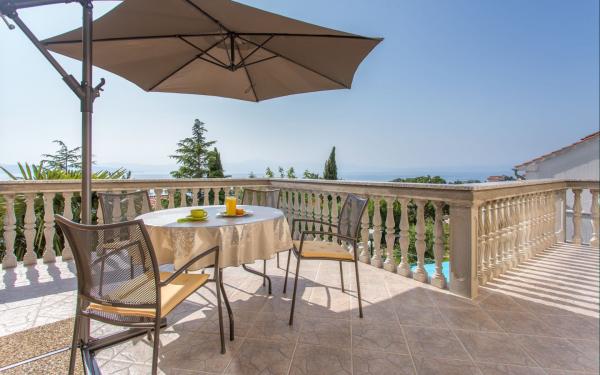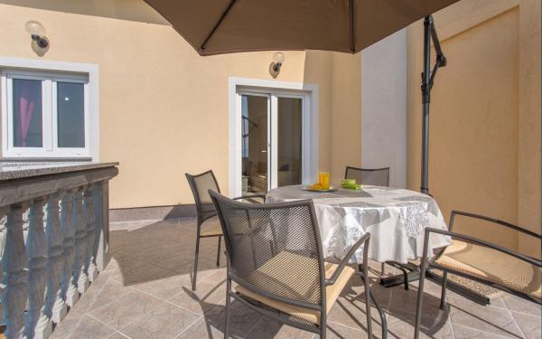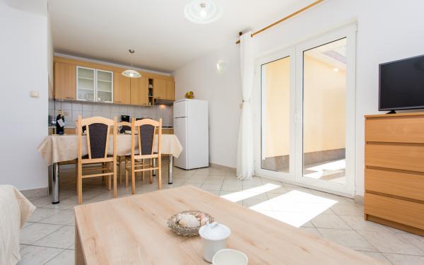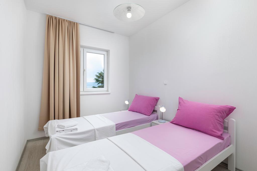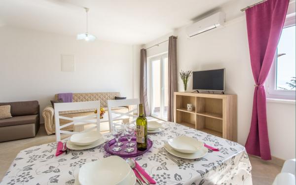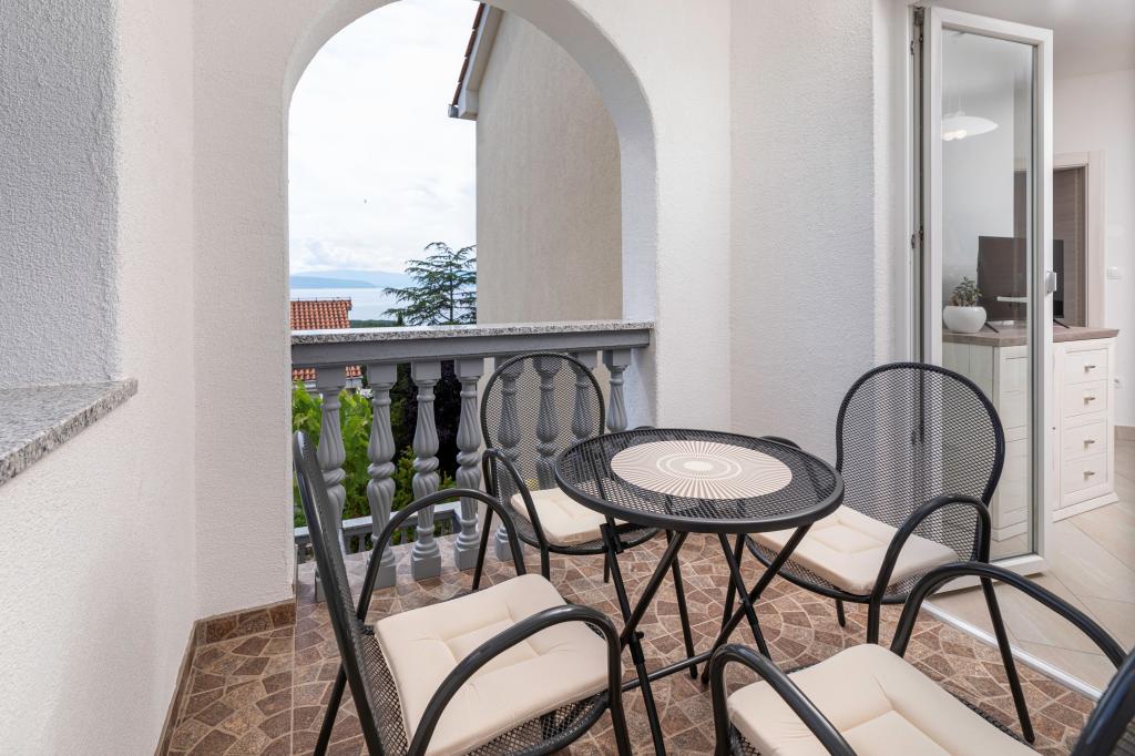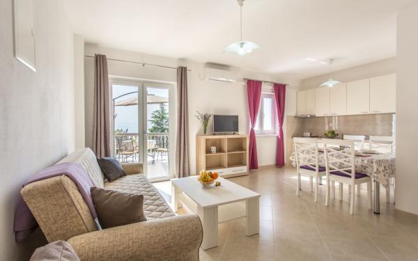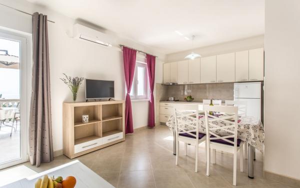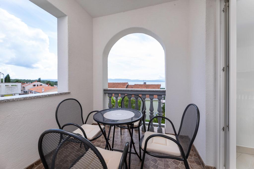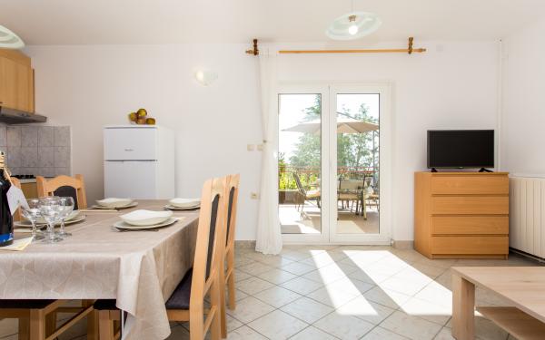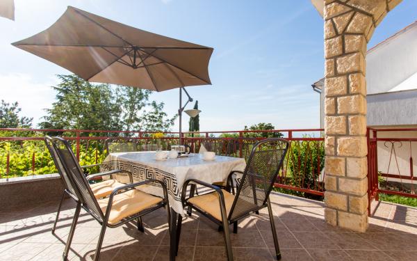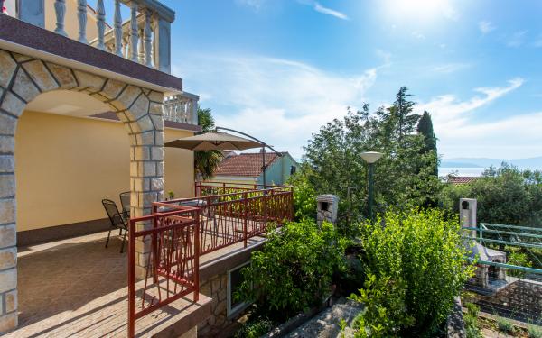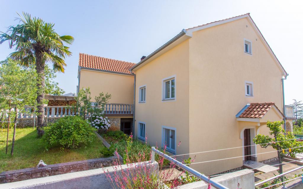 Kompletno opremljena tri apartmana u obiteljskoj kući. Svaki apartman ima zaseban ulaz izvana. Apartmani su smješteni na prvom i drugom katu kuće te svaki ima natkrivenu terasu s pogledom na more. U okućnici osigurano parkirno mjesto. Plaža Kijac se nalazi 600 m od objekta te sadrži prekrasnu šetnicu uz more u smjeru Njivice ili Malinska. Savršeno za laganu rekreaciju i obitelj, pješačenje ili bicikliranje. Objekt se nalazi na brdu i potrebno je 10 minuta hoda do plaže.