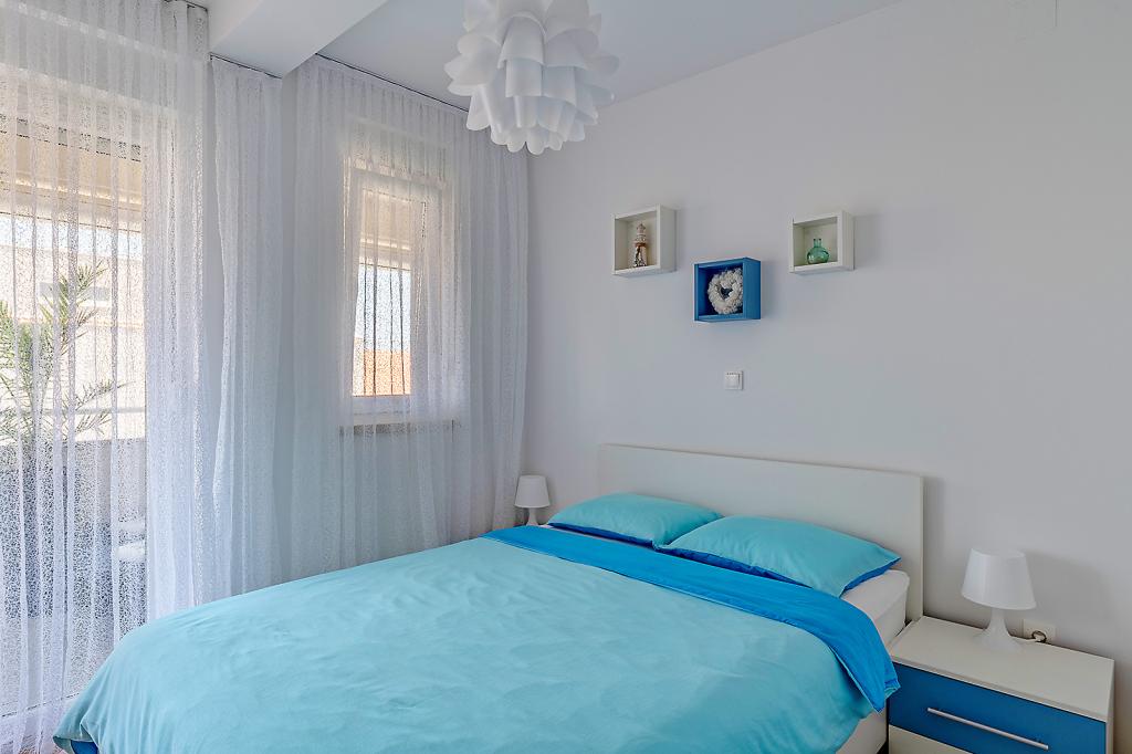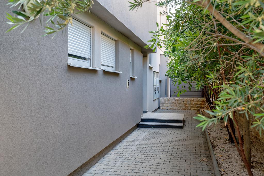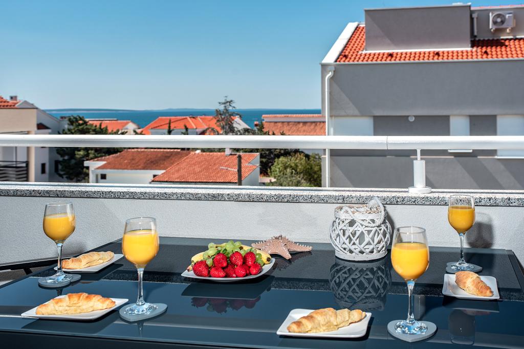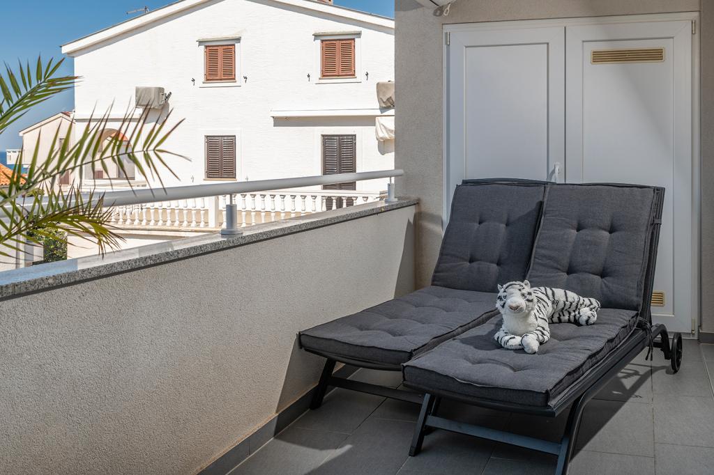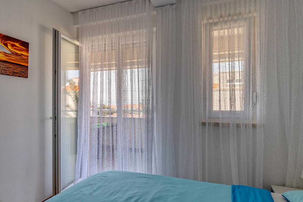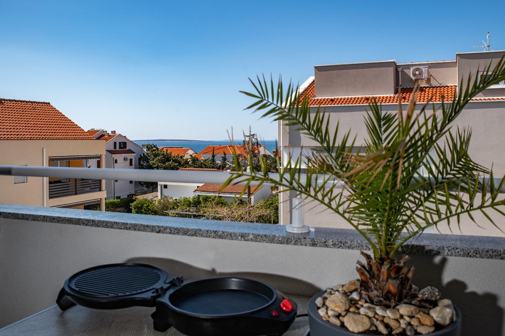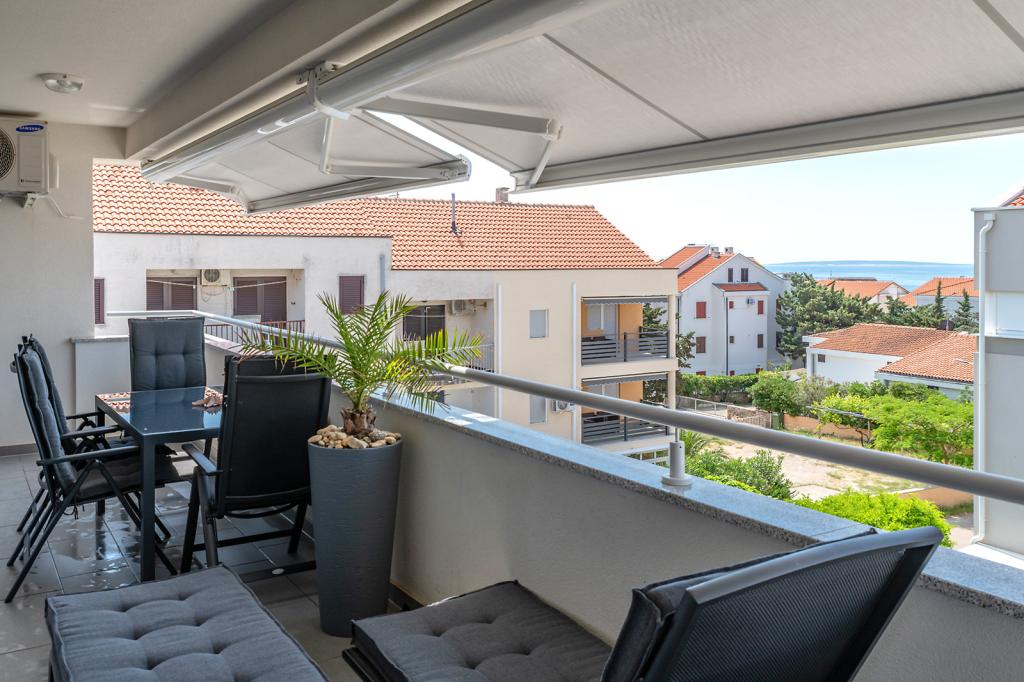 Nalazimo se na odličnoj lokaciji u Novalji, u Primorskoj ulici, 150m do pješčane plaže sa kristalno čistim morem, 15 minuta lagane šetnje uz more uz šetnicu do centra Novalje/rive sa brojnim barovima i igralištima za djecu. 150m do pješčane plaže Ploče, 8 minuta hoda do plaže Babe. Obje plaže su pogodne za djecu. Ostale prekrasne plaže na otoku udaljene su samo nekoliko minuta vožnje automobilom. Stan sadrži 2 spavaće sobe, kuhinju s blagovaonicom i dnevnim boravkom, kupaonicu, ulazni hol, veliku terasu s pogledom na more i parkirno mjesto. Sve tri sobe imaju izlaz na terasu. Kompletno opremljen za ugodan boravak: 2 klime, wi-fi, steklokeramička ploča za kuhanje, pećnica, hladnjak sa zamrzivačem, mikrovalna, perilica suđa, perilica rublja, 2 TV-a, posteljina, ručnici, kuhinjske krpe, kuhalo za vodu, električni roštilj, toster kruh, kosa sušilica, 2 udobne ležaljke na terasi, suncobran za plažu... Apartman nije pogodan za kućne ljubimce. Dobrodošli!