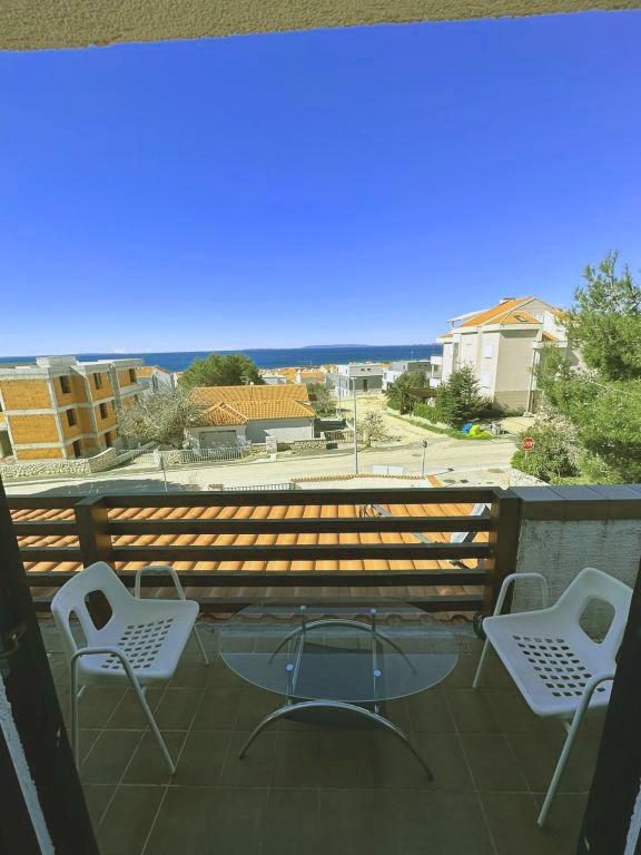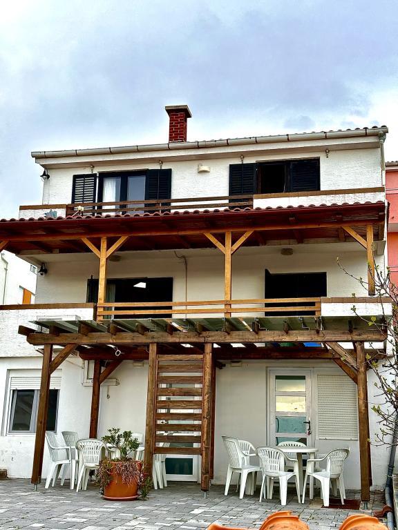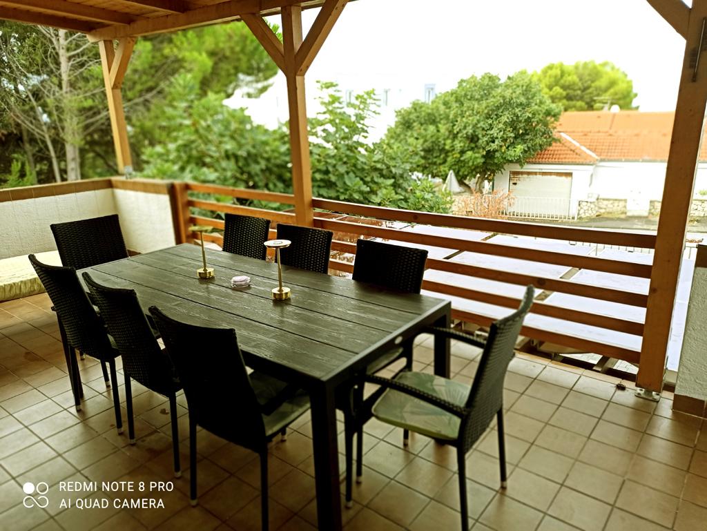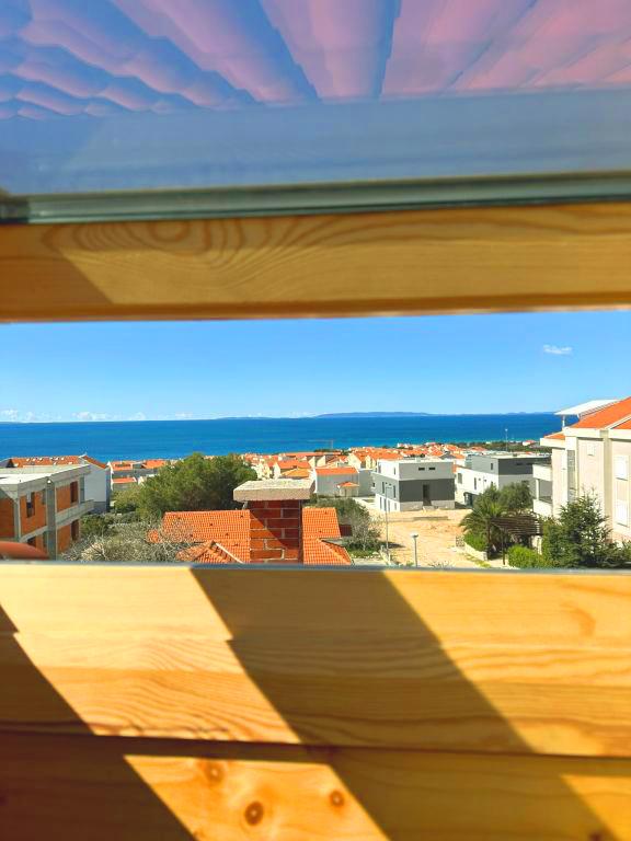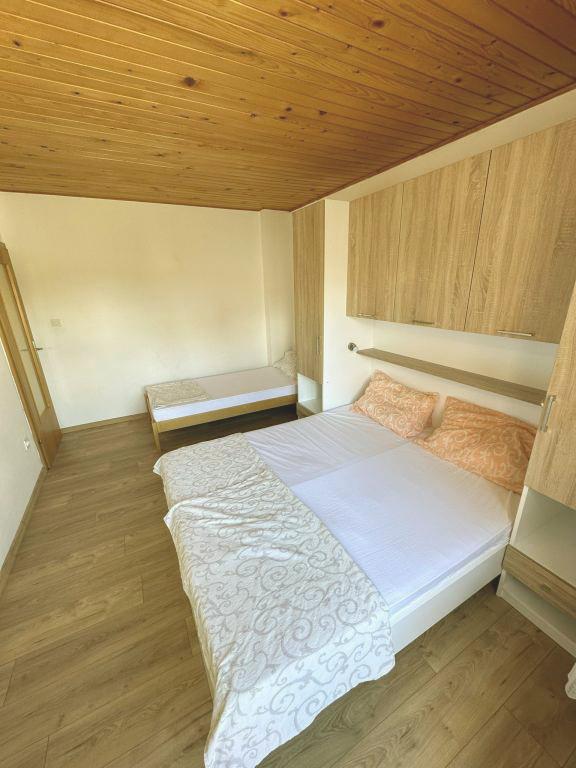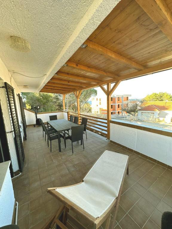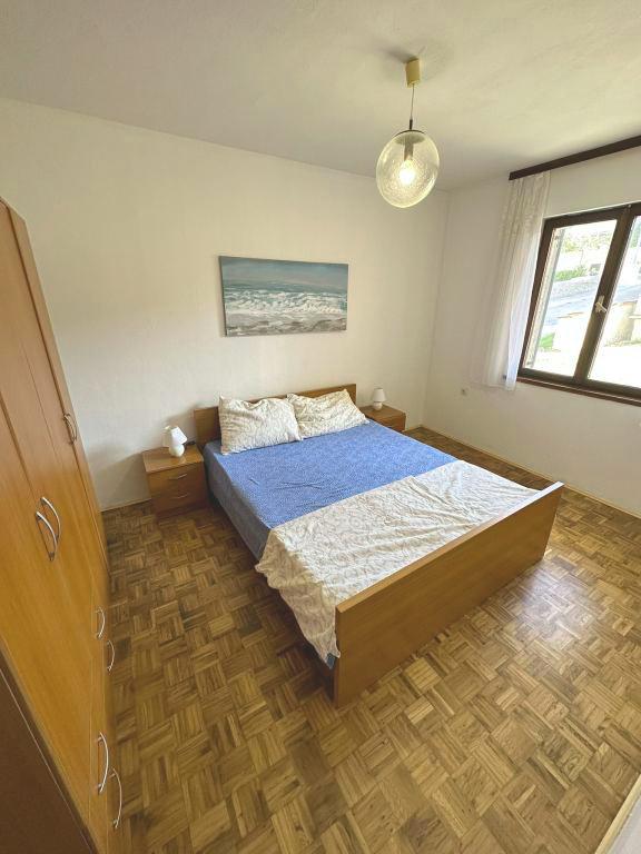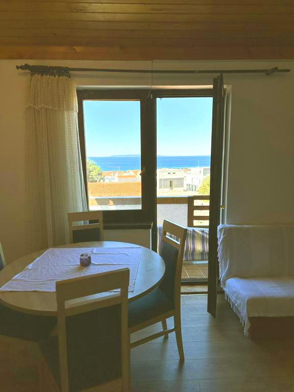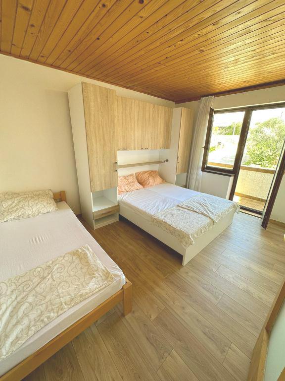 Uredno opremljen apartman sa tri spavaće sobe i pomoćnim ležajem u dnevnom boravku. Sve tri spavaće sobe imaju bračni krevet i ormar za odlaganje odjeće. Veliki dnevni boravak povezan sa kuhinjom. U sklopu apartmana je velika terasa sa pogledom na more. Uza apartman moguće je koristiti i roštilj. Za goste je osigurano parkirno mjesto u dvorištu i neposrednoj blizini apartmana.