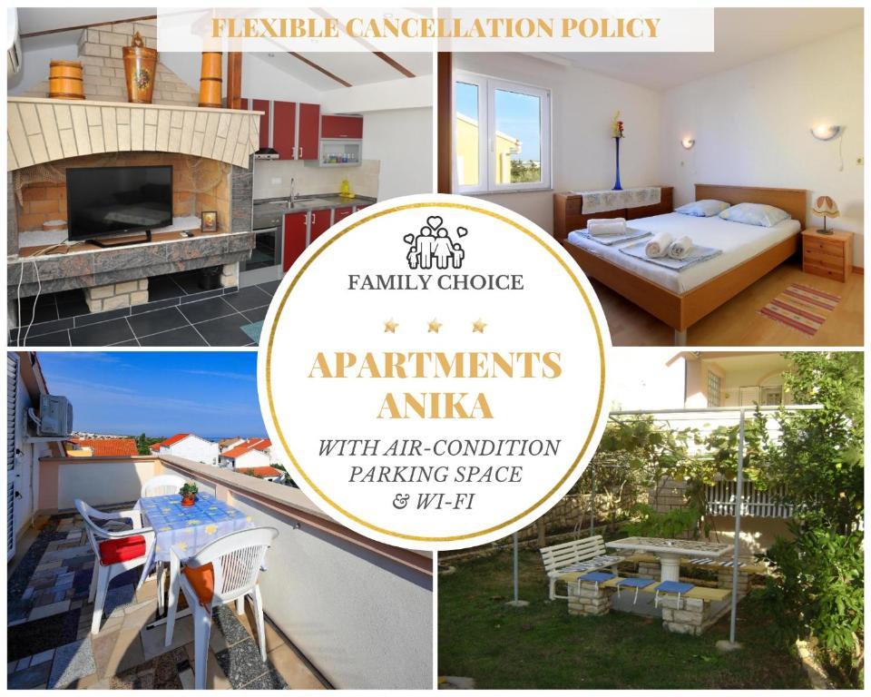 Apartmani Anika se nalaze u Novalji, u kući koju okružuje lijep i ogroman vrt, pun zelenila. Svi apartmani lijepo su opremljeni, imaju TV, klimu (osim apartman i soba u prizemlju) i veliku terasu. Svi gosti apartmana i soba mogu koristiti vrt u koje je roštilj (no na roštilju možete peći i na svojoj terasi). Parking je osiguran u dvorištu kuće. Do plaže je 10 minuta hoda, okolina je mirna, zelena i lijepa. Svi gosti mogu besplatan pristup Wi-Fi internetu.