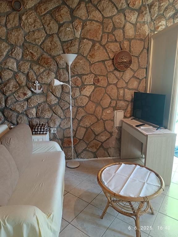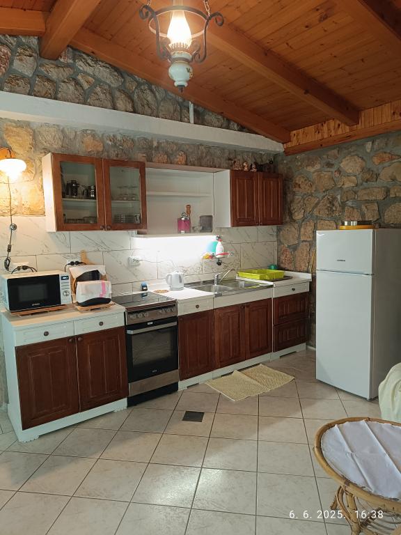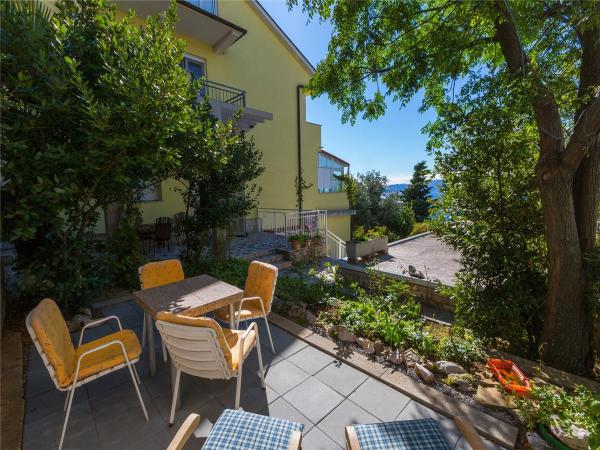 Dva veća dvosobna apartmana (60 m2) nalaze se na 2. katu kuće s prekrasnim pogledom na more, a manji jednosobni apartman (45 m2) nalazi se u zasebnoj kamenoj (rustikalnoj) kućici pored osnovne kuće s kojom dijeli vrt i dvorište. Besplatan parking osiguran. Roštilj sa terasom u vrtu zajednički je za sve goste. Udaljenost od mora je cca. 250m nizbrdicom, gdje se nalazi i šetnica s restoranima i različitim vrstama plaža. Udaljenost do centra oko 1,5km, šetnicom uz more.
