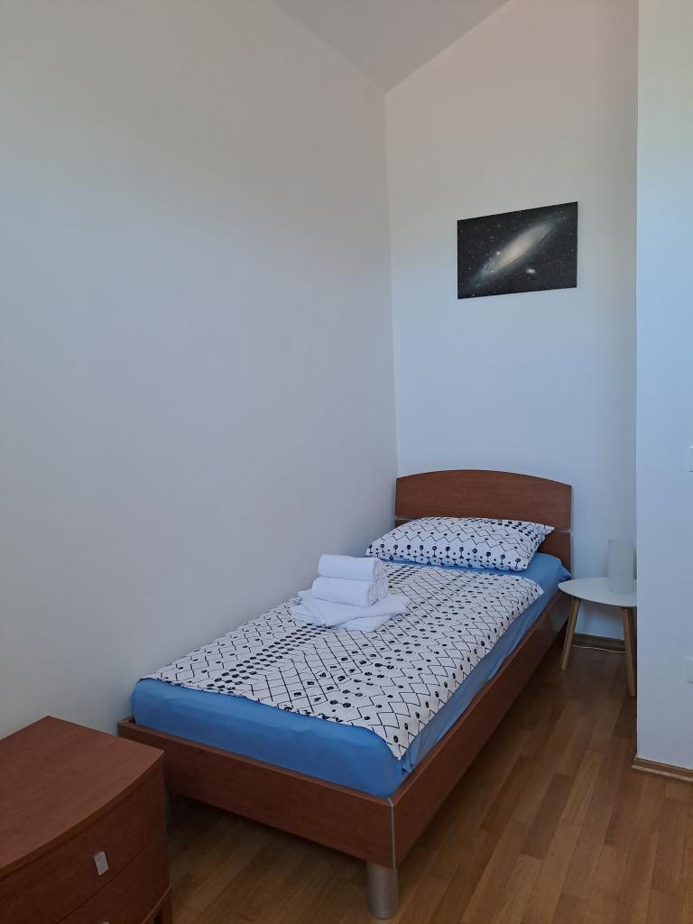 Apartman Nina nalazi se mirnom dijelu grada Novigrada, gradskoj četvrti Šaini, na blagoj uzvisini s koje se pruža lijep pogled na grad i more. Apartman se nalazi na drugom katu objekta i sastoji se od predsoblja, kuhinje s blagovaonom, dnevnim boravkom, dvije spavaće sobe i kupaonice. U kuhinji se nalaze kućanski aparati i pomagala i za najzahtjevnije. Klimatizirani boravak pruža opuštanje uz smart TV i WiFi. U velikoj spavaćoj sobi nalazi se bračni krevet, a u maloj sobi dva kreveta. Drugi klimatizacijski uređaj nalazi se između dvije sobe. Najljepši dio apartmana je terasa na kojoj možete uživati u jutarnjoj kavi s pogledom na more i naselje, ili večernjem zalasku sunca. Možete koristiti roštilj, koji se nalazi u dvorištu. Uz apartman nudimo i korištenje bazena. Svoj boravak možete upotpuniti raznim sportskim, kulturnim, društvenim i gastronomskim sadržajima kojih u Novigradu i okolici ima mnogo. Novigrad je izvrsno prometno povezan sa cijelom Istrom.