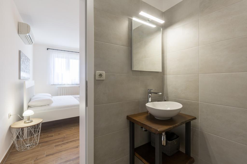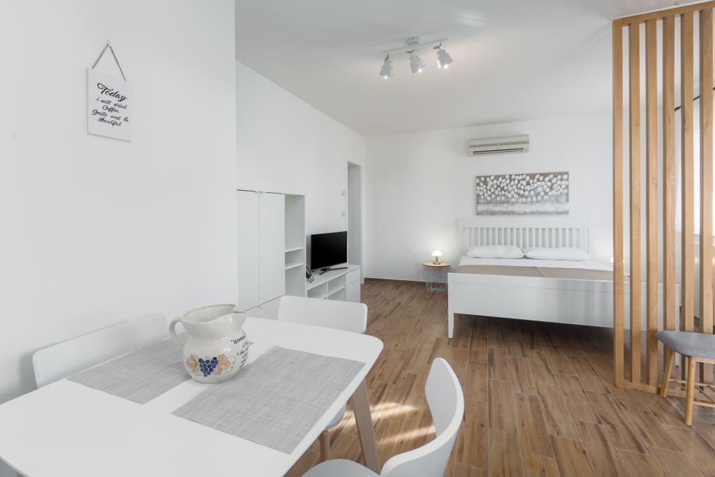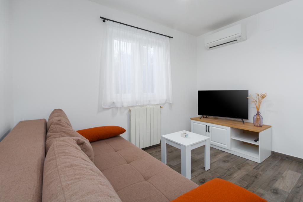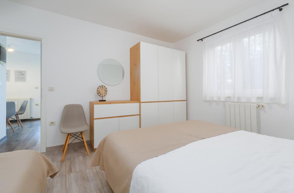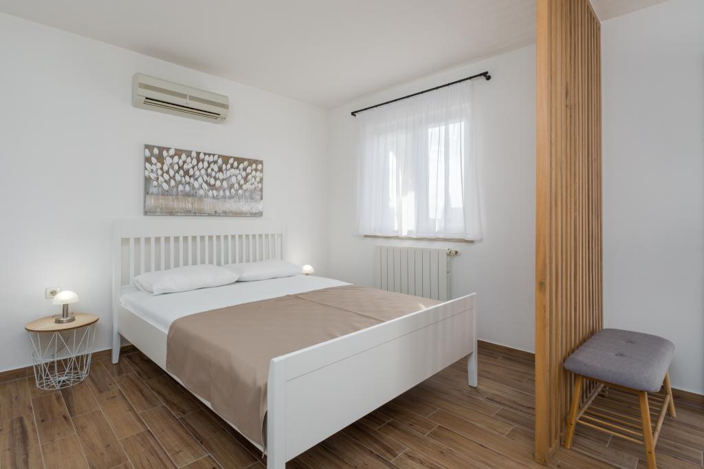 Apartman I sa zasebnim ulazom. Kompletno opremljen. Posteljina, klima, SAT-tv, WI-fi, parkiralište, mogućnost korištenja grila i vanjskog tuša. Okružen parkom. Ljuljačke za djecu i ležaljke. Nalazimo se cca 100 m od mora, na plažu možete pješke.
