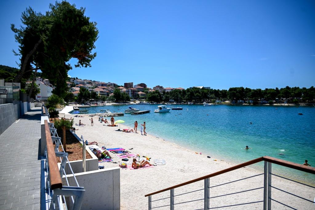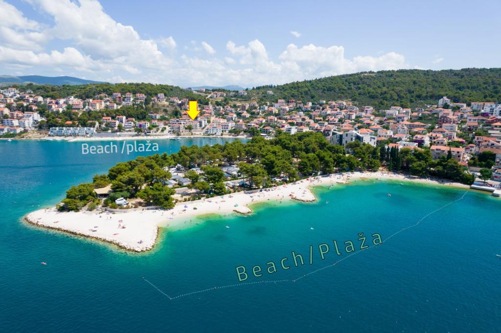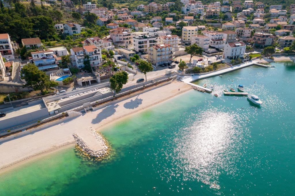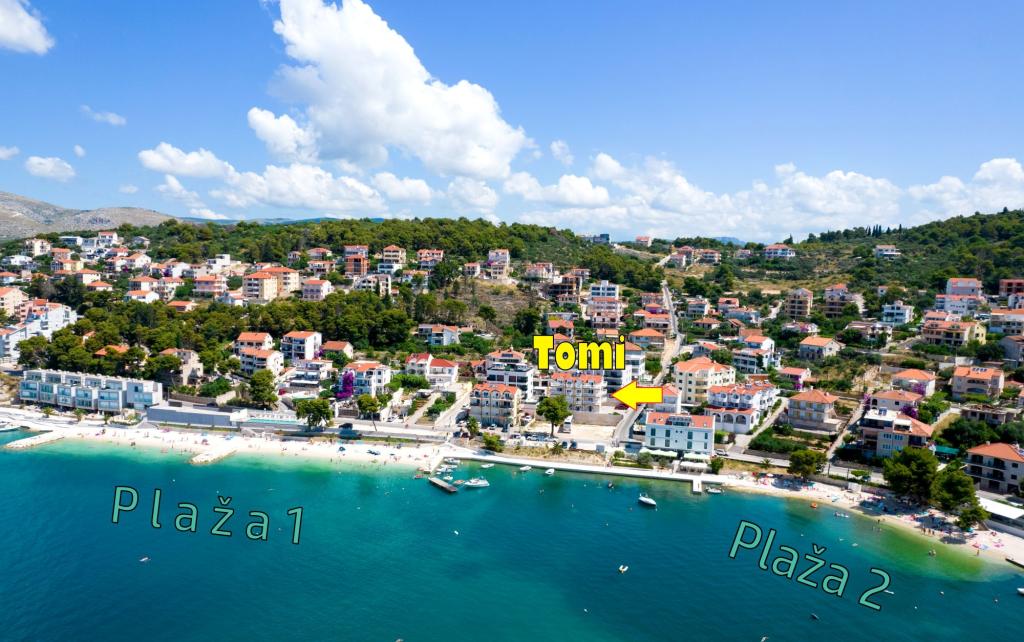 Naša kuća – Apartmani Tomi – smještena je u prvom redu do mora, uz pješčano-šljunčanu plažu na otoku Čiovu, svega 1500 m od UNESCO-ovog grada Trogira. Do centra vodi prečac 10–15 min pješice. Trogir je star preko 2300 godina, poznat po uskim uličicama, kamenim kućama i bogatom ljetnom životu. Naši apartmani udaljeni su samo 50 m od plaže idealne za obitelji i sve koji vole odmor uz more. Plaže se protežu kilometrima i nude i sunce i prirodni hlad. Uz kuću se nalazi trgovina, a svakom gostu osigurano je parkiralište. Apartmani su moderno uređeni, klimatizirani i opremljeni svime što vam treba za ugodan odmor. Bilo da dolazite s obitelji, partnerom ili prijateljima, Apartmani Tomi su pravi izbor za opuštajući ljetni boravak u srcu Dalmacije.