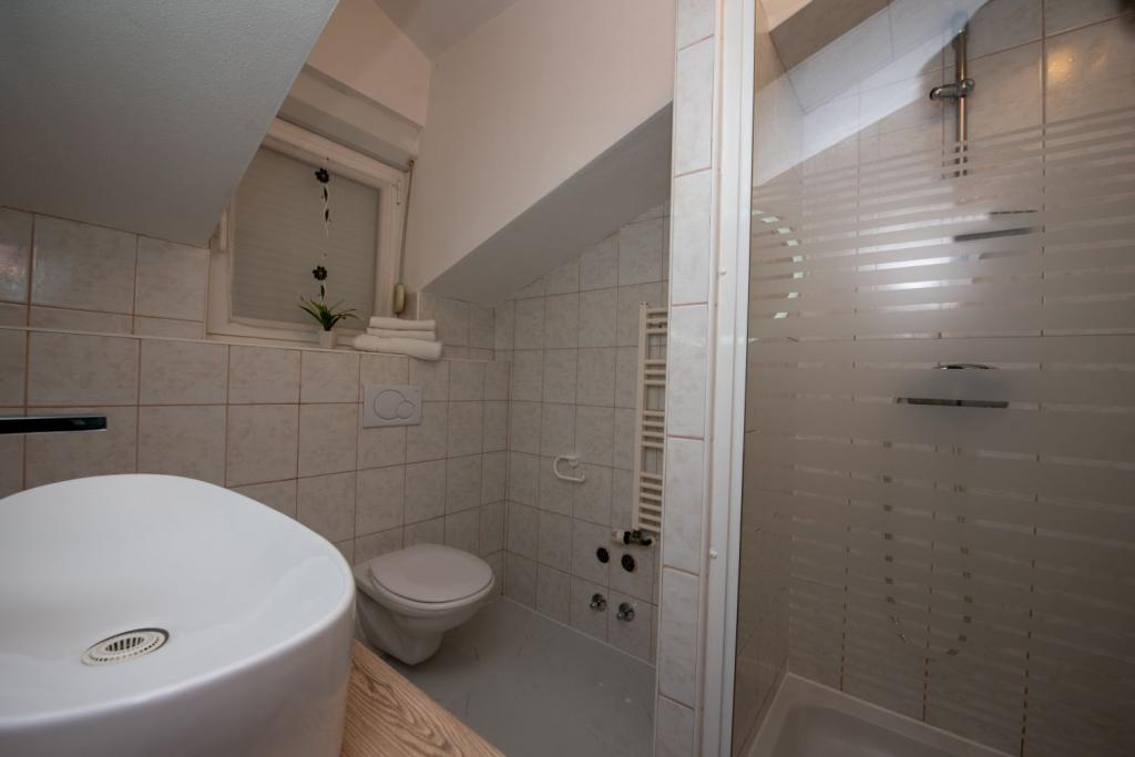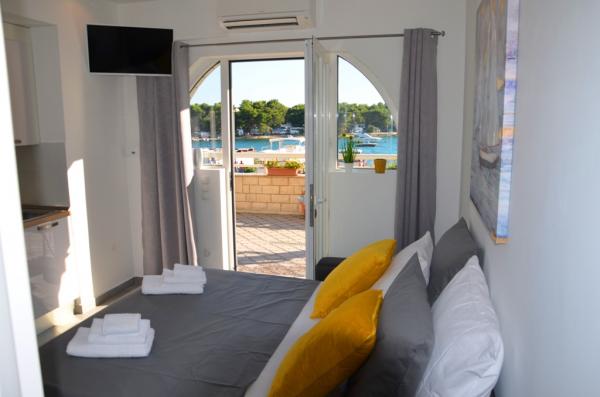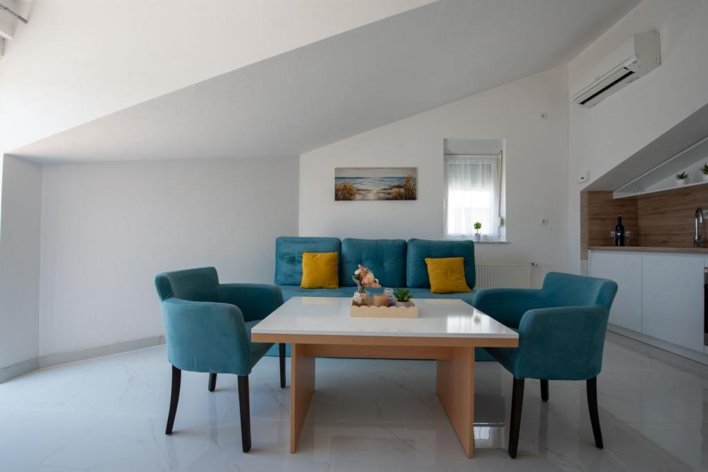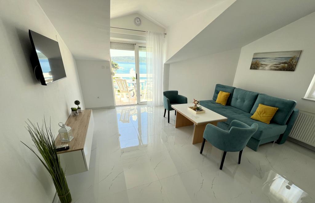Turistička pristojba je uključena u cijenu.U ponudi imamo prostrane dvosobne apartmane s prekrasnim pogledom na more, idealne za 2 + 2 osobe, kao i sobe te studio apartman za dvije osobe – savršene za parove ili pojedince koji traže mir i udobnost uz samu obalu. Svaki apartman opremljen je vlastitom kupaonicom, SAT TV-om, spavaćom sobom s izlazom na terasu te prostranom dnevnom sobom koja također ima terasu sa sjedećom garniturom – idealnom za jutarnju kavu s pogledom na more. U dnevnom boravku nalazi se trosjed na razvlačenje (dimenzije 160x200 cm), koji služi kao pomoćni ležaj za dvije osobe. Kuhinja u sklopu dnevnog boravka je potpuno opremljena – s hladnjakom, štednjakom te potrebnim priborom za kuhanje, jelo i piće. Apartmani se nalaze na drugom i trećem katu kuće, a svi su klimatizirani, što osigurava ugodan boravak i tijekom najtoplijih ljetnih dana. Svakom gostu na raspolaganju su ručnici – jedan veliki (140x70 cm) i jedan mali (100x40 cm), a zamjena se vrši po dogovoru ili potrebi gosta. Udobnost, čistoća i fun