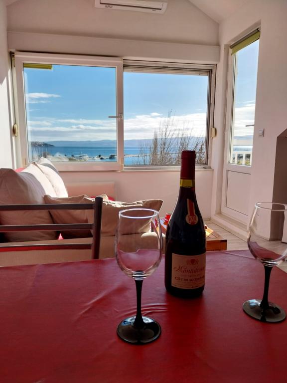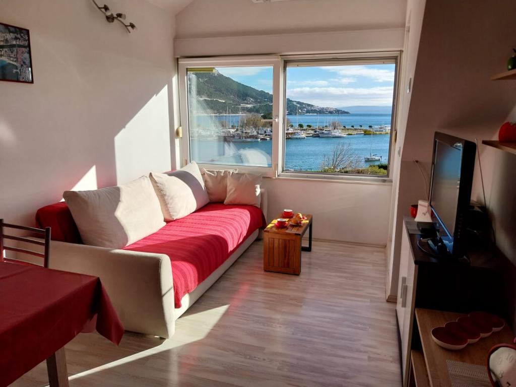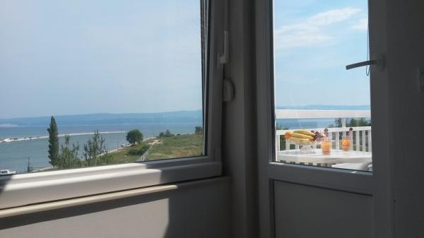 Potpuno opremljen apartman s balkonom i prekrasnim pogledom na more, rijeku i planine. Nalazi se u mirnom kvartu grada, na ušću rijeke Cetine, 5 minuta hoda do prekrasne pješčane plaže i 10 minuta do centra grada. Apartman je na 4.katu, bez lifta. Pomazemo pri nosenju prtljage. Okružen zelenilom i ocaravajucim plavetnilom ovaj apartman čeka na Vas.