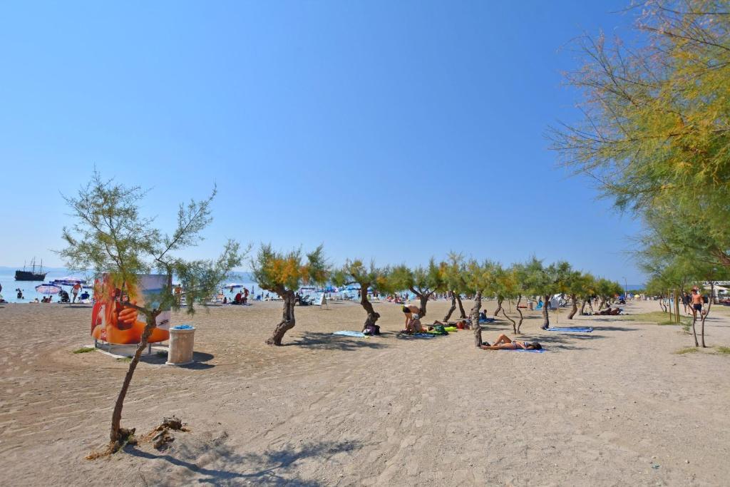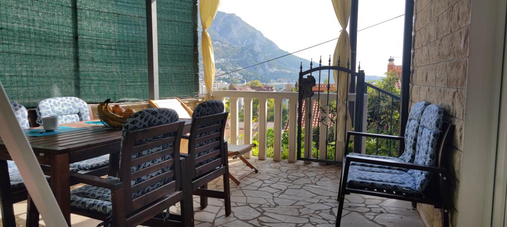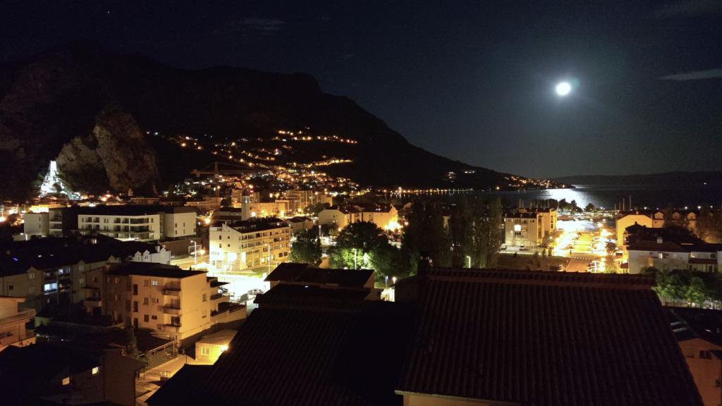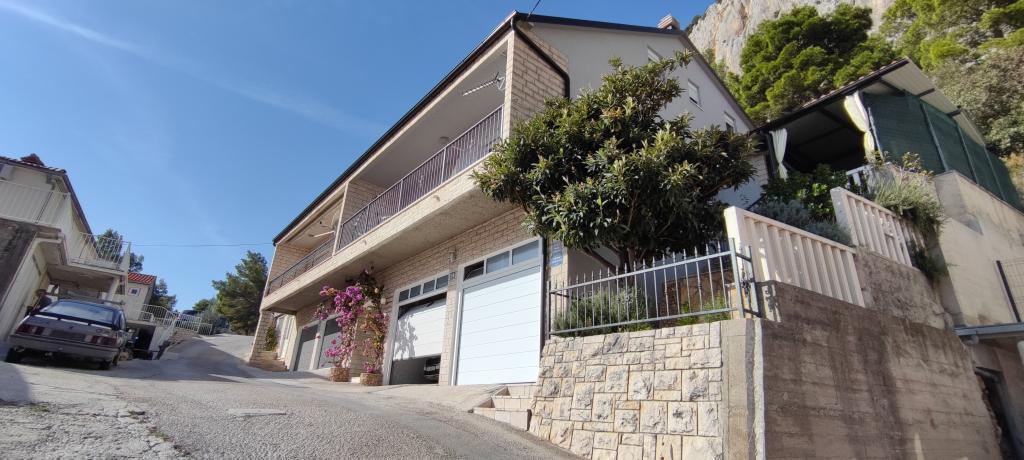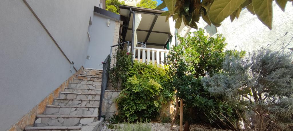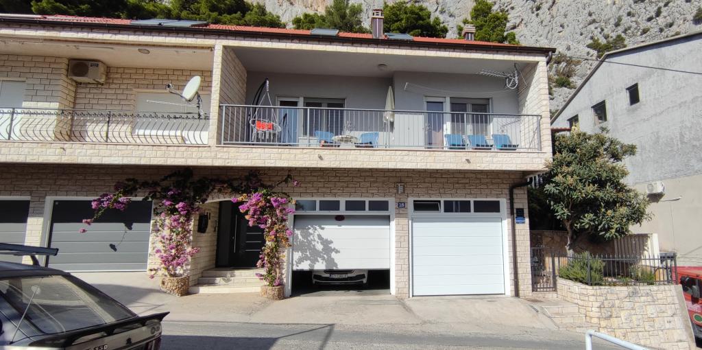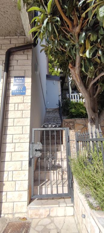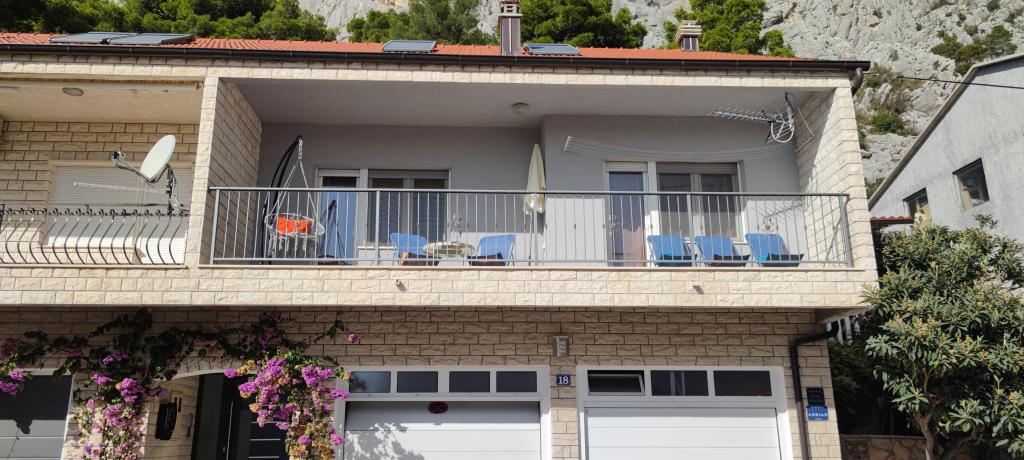 ADRIAN je jedini apartman u čitavom objektu što Vam garantira potpunu privatnost - nema ometanja od drugih gostiju! Suvremeno je uređen, klimatiziran, udoban i prostran, sa svim kućanskim aparatima, ima stabilni WIFI i nalazi se u mirnoj ulici u SZ dijelu Omiša. Sastoji se od velikog stana na 1. katu s posebnim ulazom s ulice kroz vrt s mirisnim biljem, te ima zatvorenu garažu u prizemlju s pristupom na ulicu. Sa sjevera je šumovita planina, s istoka je prostrana terasa (25m2) s nadstrešnicom idealna za uživanje uz veliki grill, dok je s juga veliki balkon (16m2) pogodan za sunčanje ili večernje opuštanje u udobnim ležaljkama ili ljuljačkom uz pogled na centar grada, rijeku Cetinu i more. Apartman ima 2 kupaonice i 2 prostrane sobe, kuhinju i zasebni dnevni boravak. Omiš nije velik, pa sve možete lako obaviti pješice: pekare, banke, dućani, kafići su udaljeni oko 5 min hoda, a za 10 min hoda dolazite do centra grada s mnogo restorana, a tu je smještena i velika pješčana plaža "Punta".