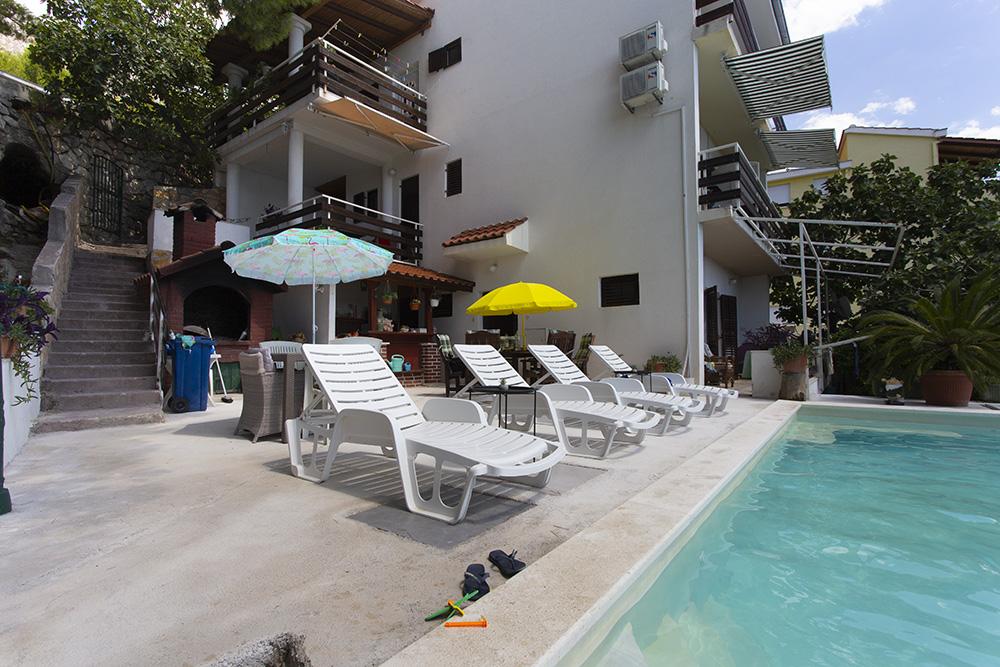 Apartmani Kapela nalaze se u malom turističkom mjestu Ruskamen, nedaleko od grada Omiša. Kuća je smještena u mirnom okruženju, udaljena svega 40 metara od šljunćane plaže do koje vode privatne stepenice. Na plaži gosti imaju na raspolaganju ležaljke i suncobrane kojima se mogu potpuno besplatno koristiti. U sklopu objekta je dvorište s bazenom, ležaljkama i velikim roštiljem kojim se gosti mogu neometano koristiti. Privatni parking za vozila gostiju je u sklopu objekta. Svi apartmani posjeduju klima uređaj, sat-tv, kuhinju, kupaonicu, wifi internet, roštilj na ugljen i terase s pogledom na more. U bližoj okolici možete uživati u prekrasnim šljunčanim plažama s prirodnim hladom i kristalno čistim morem. Centar mjesta s supermarketom, restoranima, kafićima i hotelskim kompleksom je udaljen oko 400 metara. Preporučavamo posjetiti gradove: Omiš (5 km), Split (30 km), Makarska (30 km), Brela (18 km), Trogir (40 km).