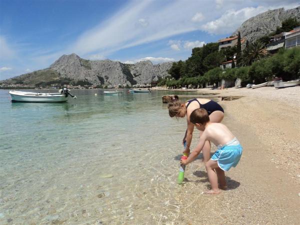 Na raspolaganju cijelu godinu! Moderna obiteljska kuća nalazi se u atraktivnom i idiličnom dijelu drevnog i slikovitog dalmatinskog grada Omiša, udaljena je samo 50m od prekrasne šljunčane plaže s tuševima i ugostiteljskim sadržajima. Lijepo uređeni apartmani su na povišenom terenu okrenuti prema kristalno čistom moru i jugu sa pogledom na otok Brač. Do centra i stare jezgre je tek nekoliko minuta hoda. Nadomak popularnog raftinga na Cetini - 700 m, sportskog penjališta - 700 m, izletničkih brodova - 500m, starih gusarskih utvrda - 500 m, planinarskog i ronilačkog centra - 500 m, paraglidinga - 500 m, odbojke na pijesku - 700m, Dino parka i luna parka - 1 km, Doma zdravlja - 250 m, Splita - 20 km, Makarske - 30 km, blizina Brela, Baške Vode, Bola, Međugorja...Dobro nam došli! Kuća ima vlastiti parking koji se ne može rezervirati, ali je slobodno korištenje ukoliko ima mjesta. Naročito pogodan smještaj u prizemlju objekta i pristup kupalištu invalidnim osobama i djeci u kolicima.