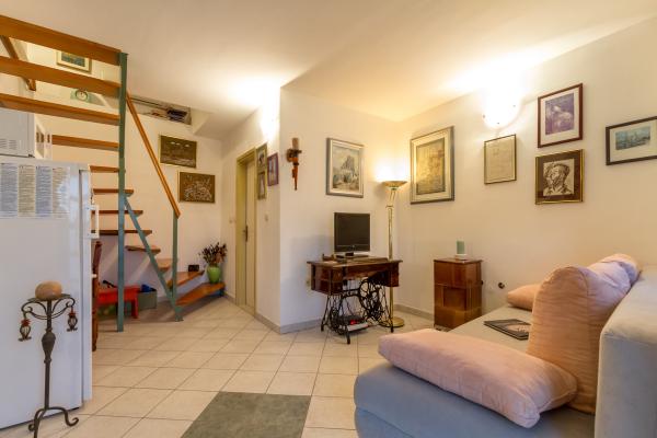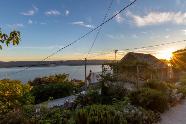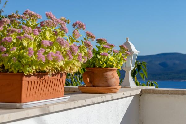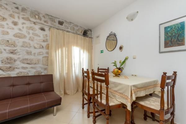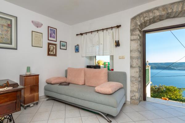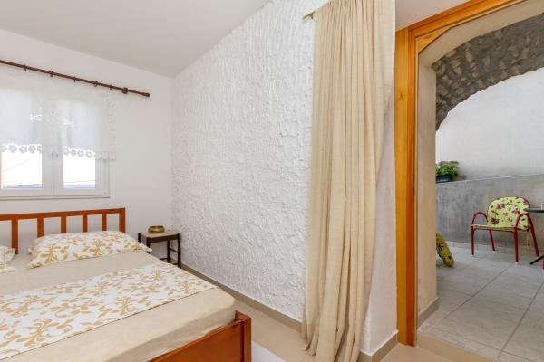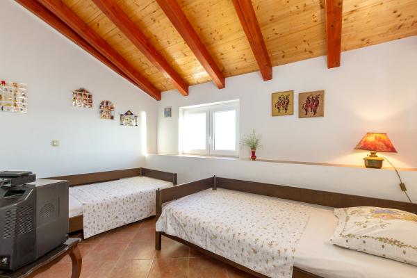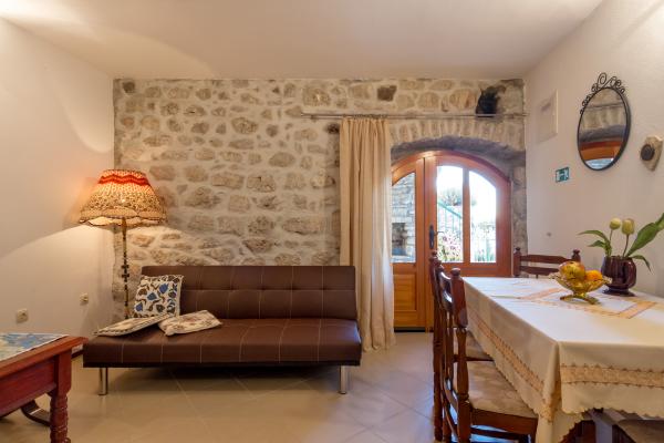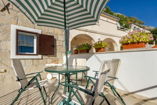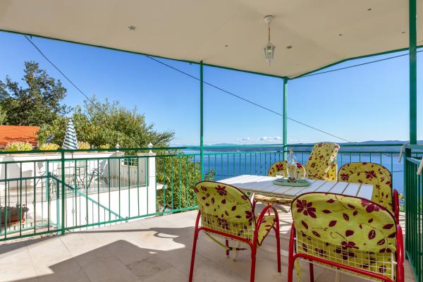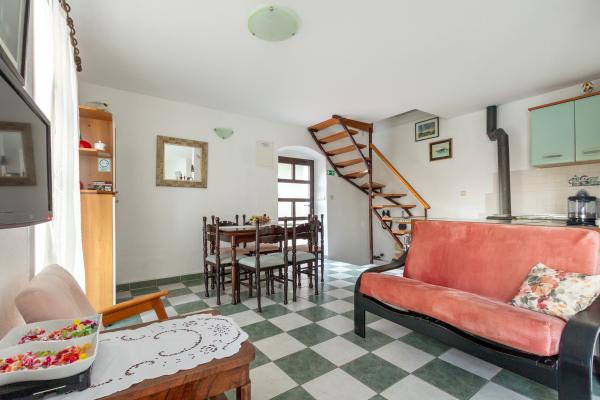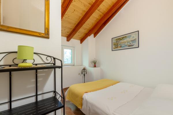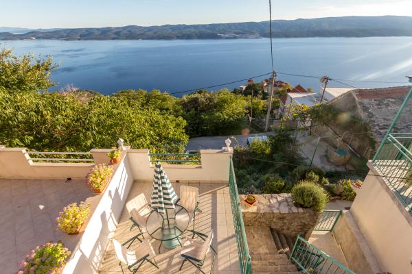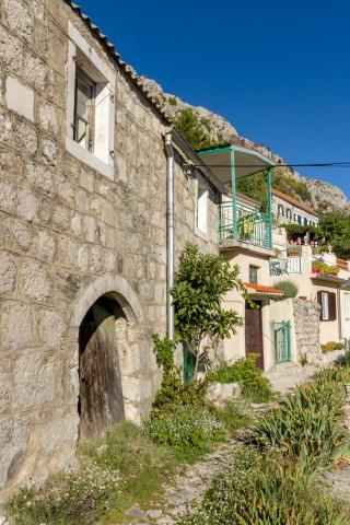 Kamena seoska kuća izgrađena 1892 god potpuno renovirana i prilagođena modernom životu. Nalazi se na 357 m iznad mora. Sa terasa se pruža očaravajući pogled na more i otoke. Kuća je opremljena sa gotovo svim pomagalima za lagodan i ugodan boravak. Svatko može naći svoj ugodan kutak, bilo na jednoj od terasa kojih je 4 i promatati nezaboravni zalaz sunca. Djeca imaju kutak u kući za igru što ih osobito veseli. Nakon cjelodnevnih izleta priprema jela na roštilju uz dobro dalmatinsko vino postaje nezaboravna večer. Proteže se na 3 etaže. Na I etaži je dnevni boravak s potpuno opremljenom kuhinjom, blagovaonicom i kupatilom sa tuš kabinom. Na katu su 4 spavaće sobe. U prizemlju je kupatilo sa tuš kabinom, i strojem za pranje rublja. U prizemlju je odvojeni apartman potpuno opremljen sa kuhinjom, blagovaonicom, sjedećom garniturom i kupatilom s tuš kabinom. Spavaća soba je odvojena od dnevnog dijela. Ispred apartmana je ugodna terasa opremljena stolom i stolicama i ležaljkom.
