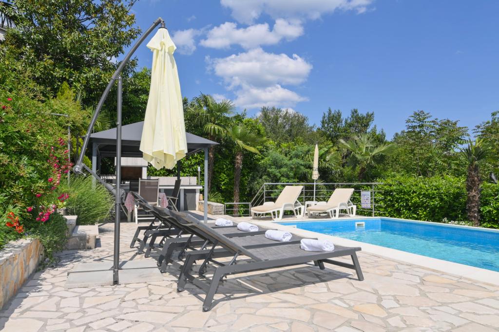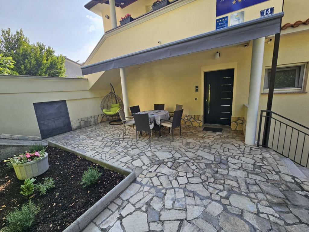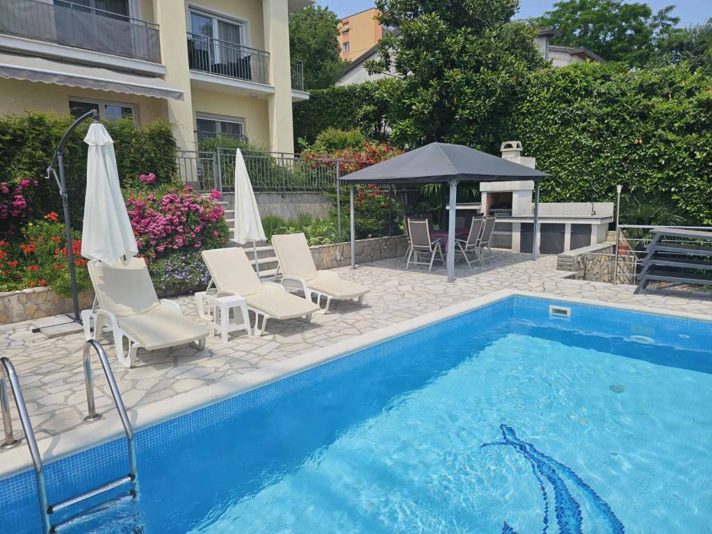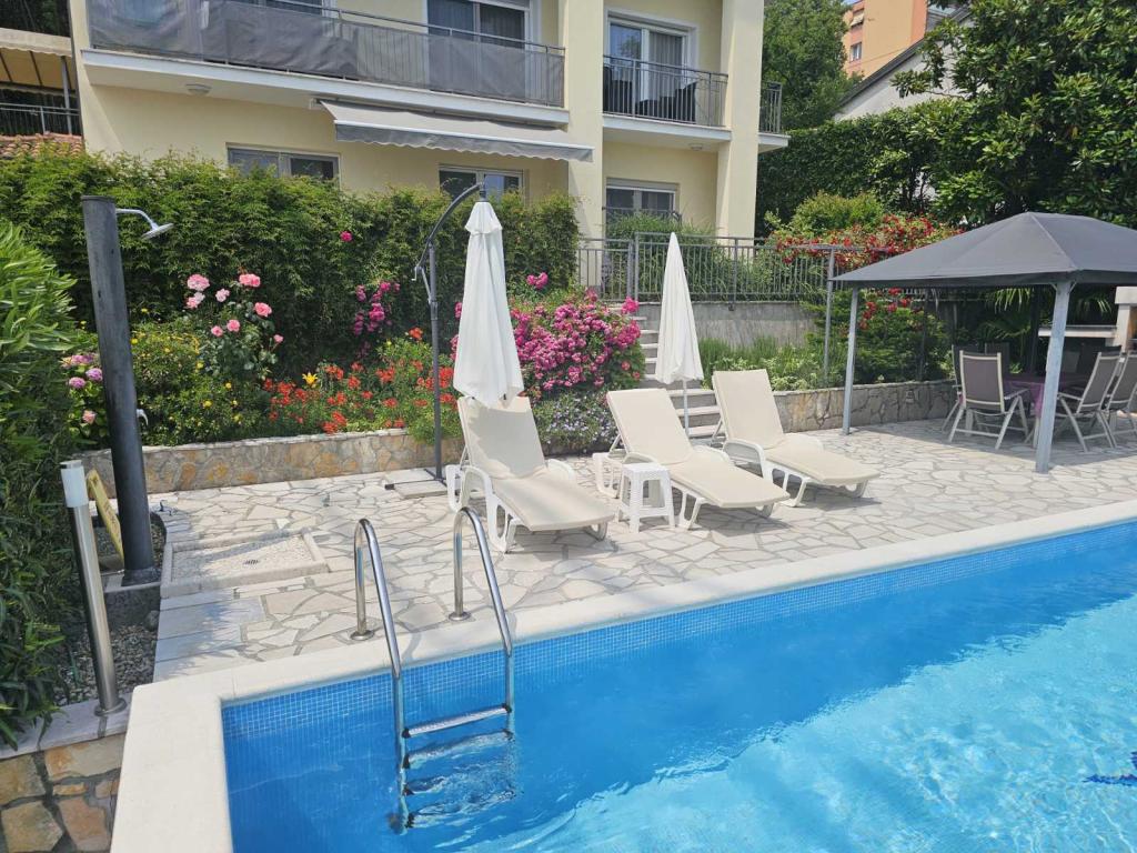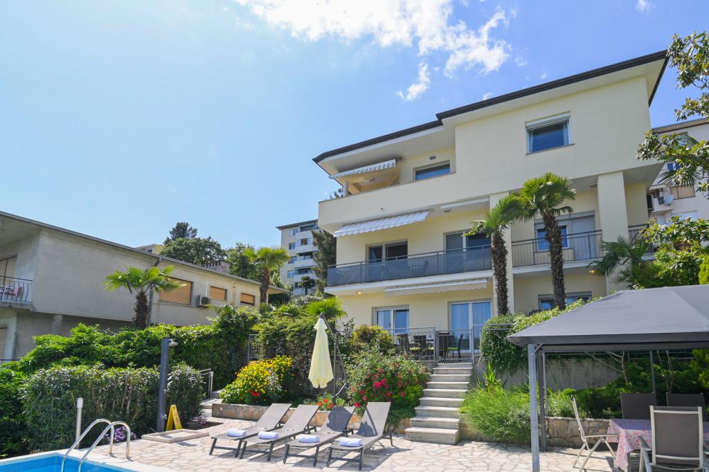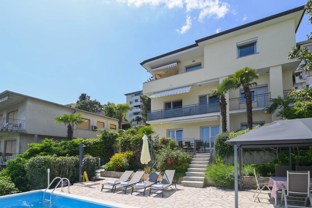 Apartmani Grozić smješteni su u obiteljskoj kući u mirnom dijelu Opatije, okruženi terasama, lijepo uređenim vrtom sa palmama i mediteranskim biljem,bazenom 7,0 x 3,5 m,dubine1,5 m. Kuća nudi smještaj u dva novo uređena i komforna apartmana. Apartmani imaju zasebni ulaz, što dodatno omogućava potrebnu privatnost gostima. Apartman A2 (4-6 osoba) ,85 m2 nalazi se u prizemlju. Apartman A1 (4-6 osoba), 90 m2 nalazi se na 1 katu. Parkirna mjesta (natkrivena) su osigurana. U prostranom i lijepo uređenom vrtu, smješten je bazen sa terasama za sunčanje, gostima su na korištenje: zidani grill, natkrivena vrtna garnitura (stol stolice), suncobrani, ležaljke... Uživajte u privatnosti i ekskluzivnosti bazena.. Dobrodošli!
